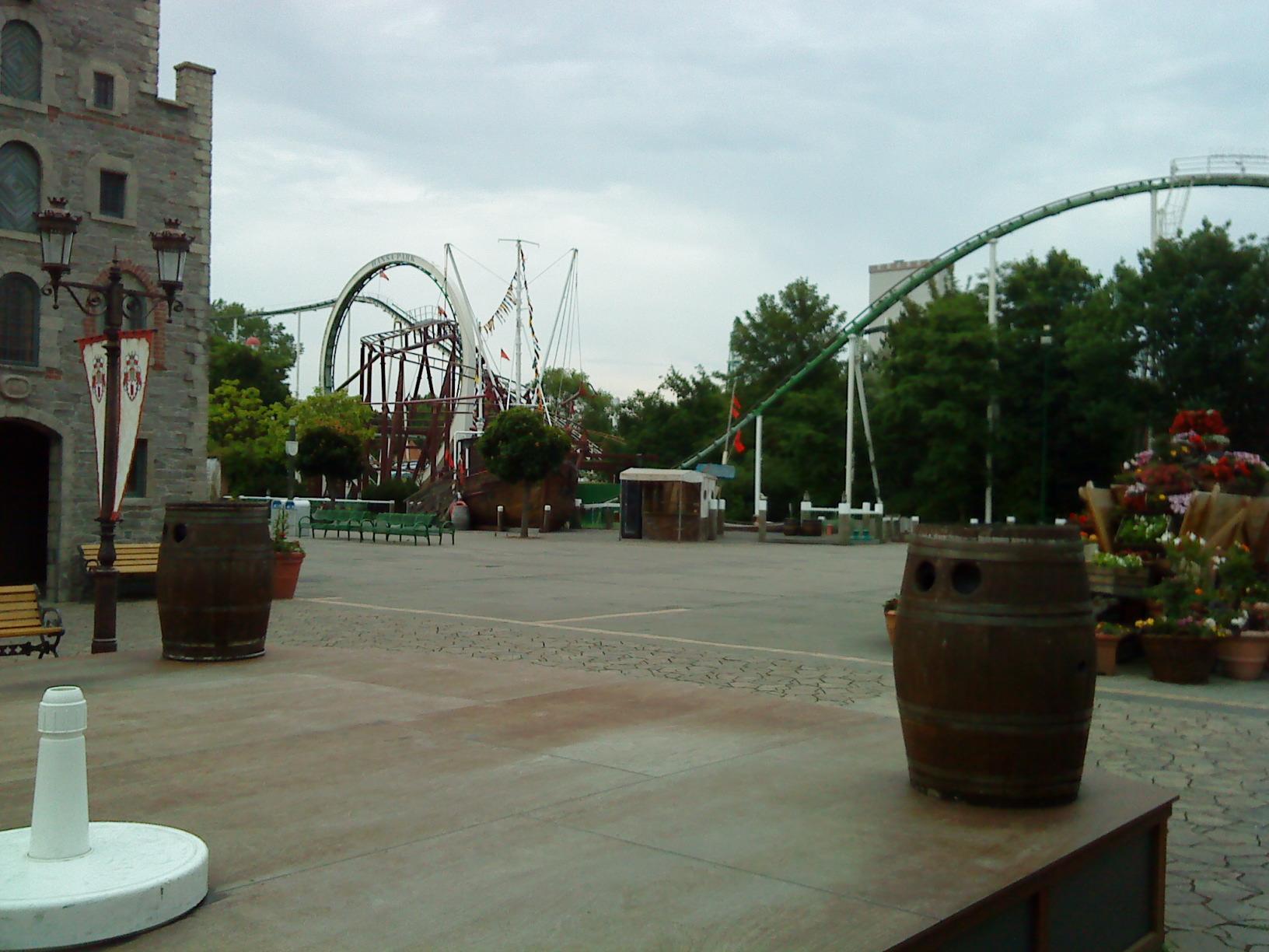 Gerstlauer zunächst zu einem Schweigen führte. Am schlimmsten für mich war als Erstbesucher aber, dass ich immer wieder einen Zug über Schwarzkopfsche Schienen fahren hörte, in den ich schon seit langem sitzen möchte. Nach der Magenfütterung ging es daher schnell zur Linderung des viel zu großen Achterbahnhungers. So zog es meinen Sitznachbarn Kevin und mich zusammen mit ein paar anderen Onridern zunächst linker Hand zu den beiden ältesten Achterbahnen des Parks.