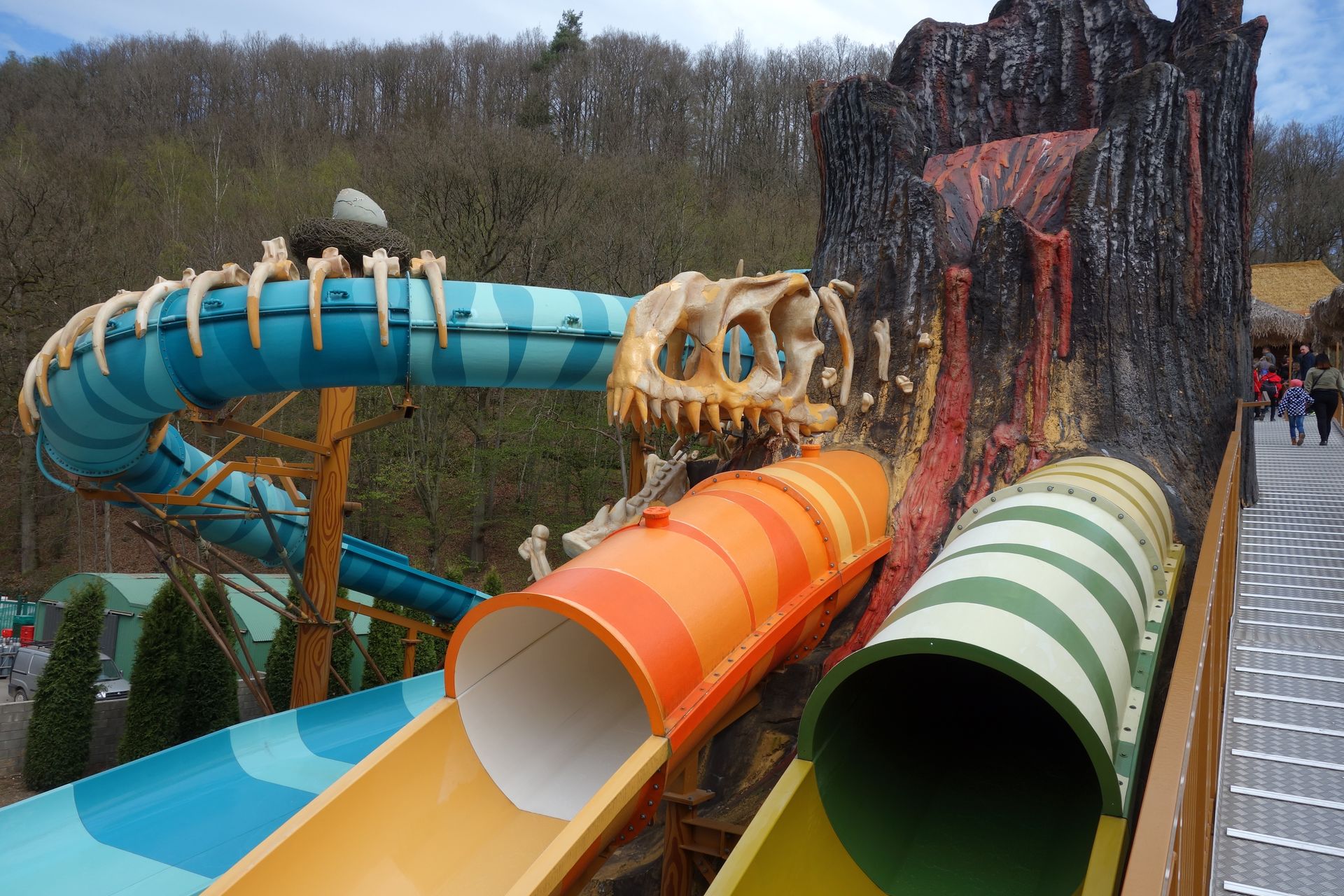 Zwei davon führen als klassische Wellenrutsche durch den großen Vulkan hindurch.
