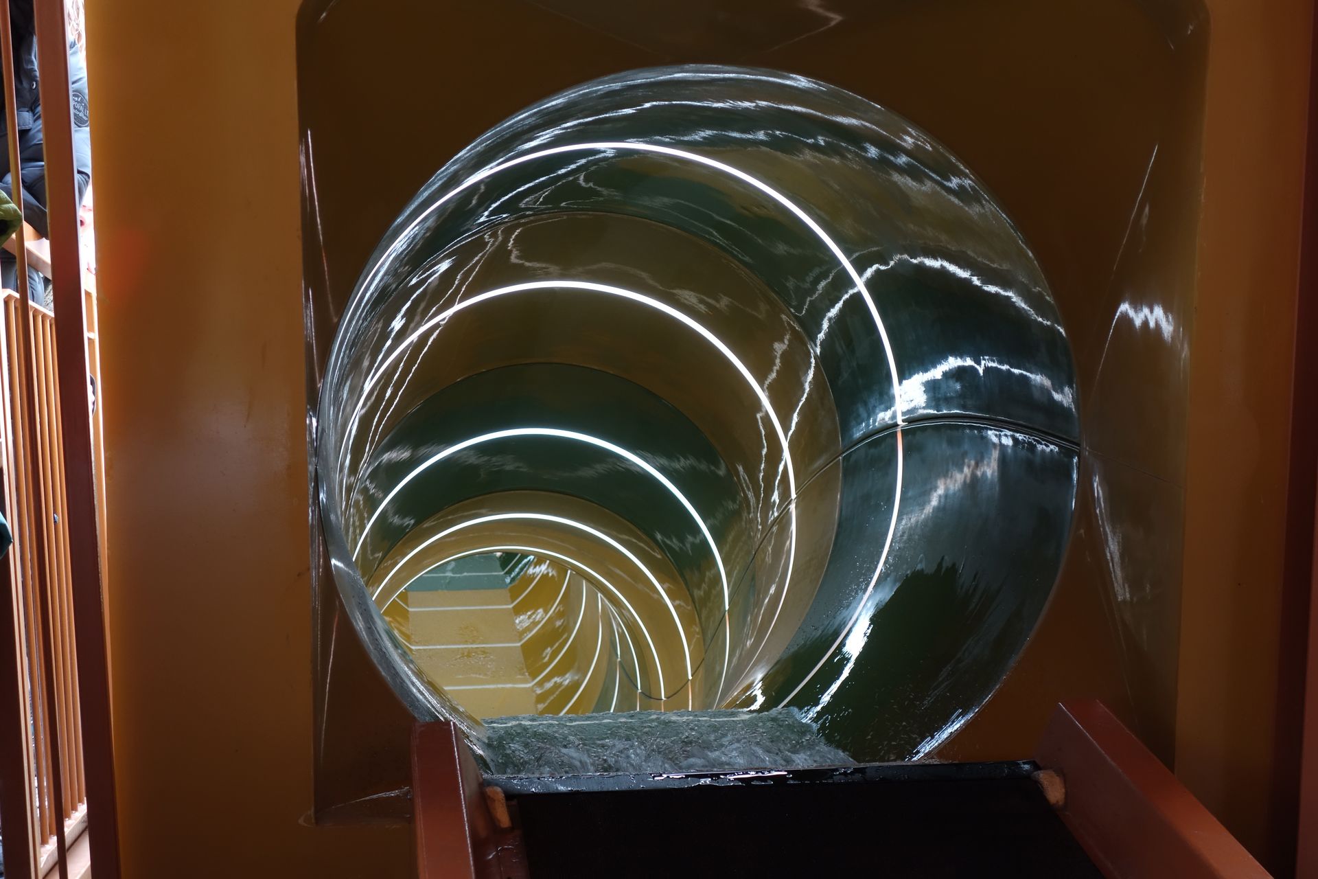 Bei der zweiten kann man sich per Knopfdruck aussuchen, welche Musik und welche Lichteffekte die Rutschpartie begleiten sollen.