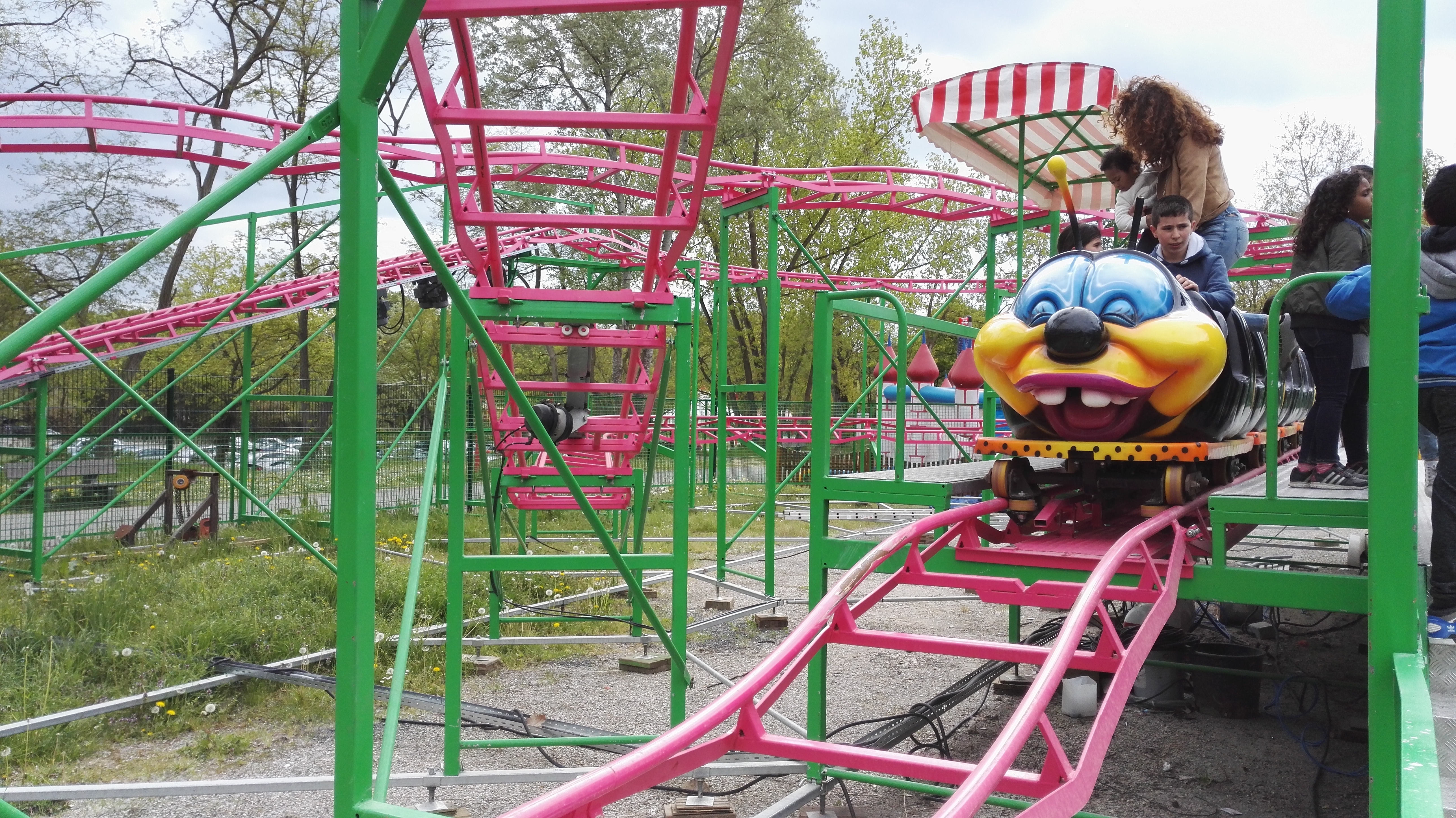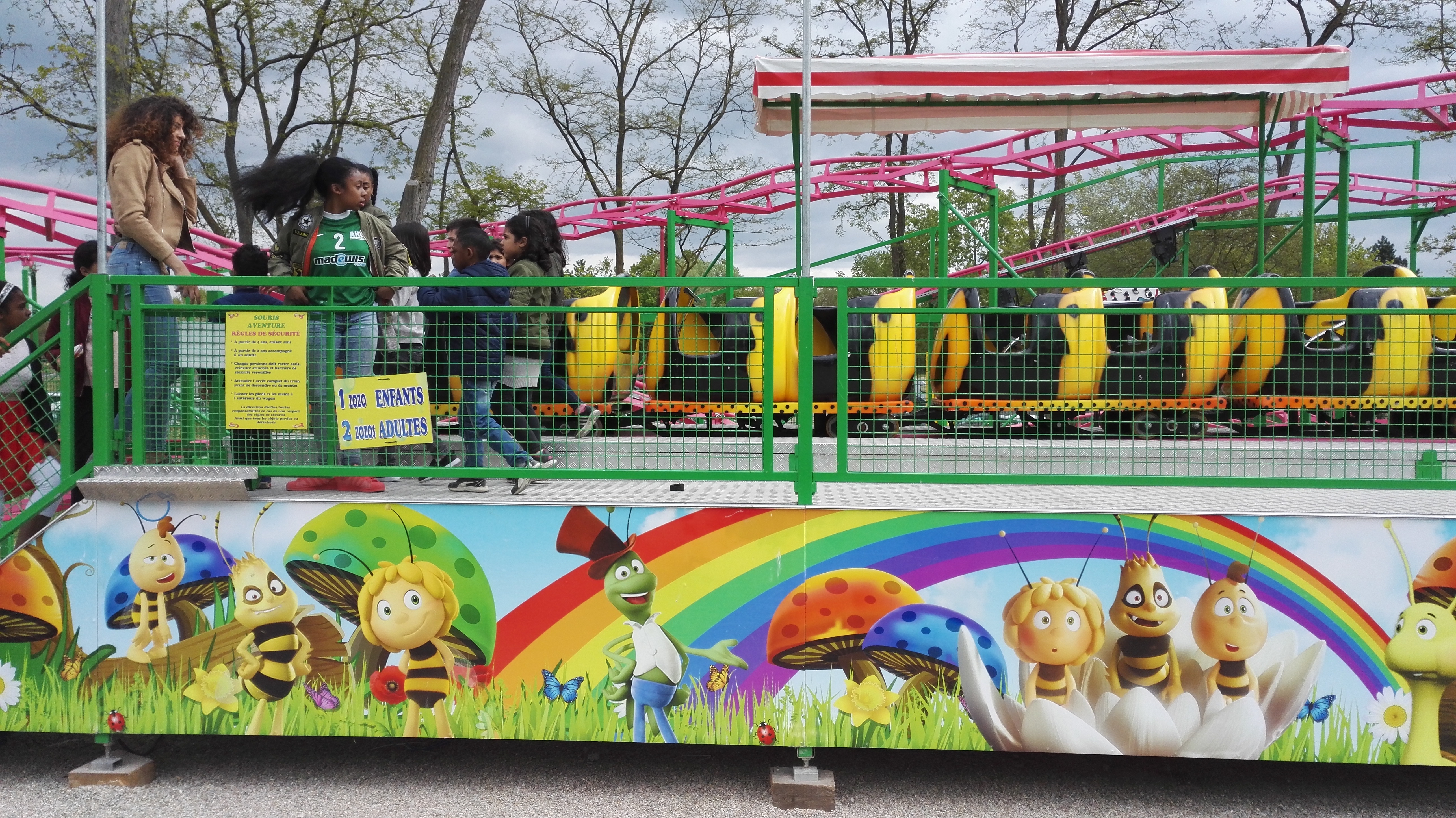 Im Kinderparadies wird jede Attraktion seperat mit der hauseigenen Währung, dem Zozo, bezahlt. Wir kaufen sechs Zozos am Büdchen für 10,80 EUR und begebben uns direkt zum Big Apple, der auch in Cergy den Namen "La Souris" (zu Deutsch "Maus") trägt. Im ergleich zu den bisherigen Anlagen, herrscht in diesem Zug die meiste Action. Die Kinder sind begeistert und mit lautem Geschrei geht es über die Huckelstrecke bis zum Drop.