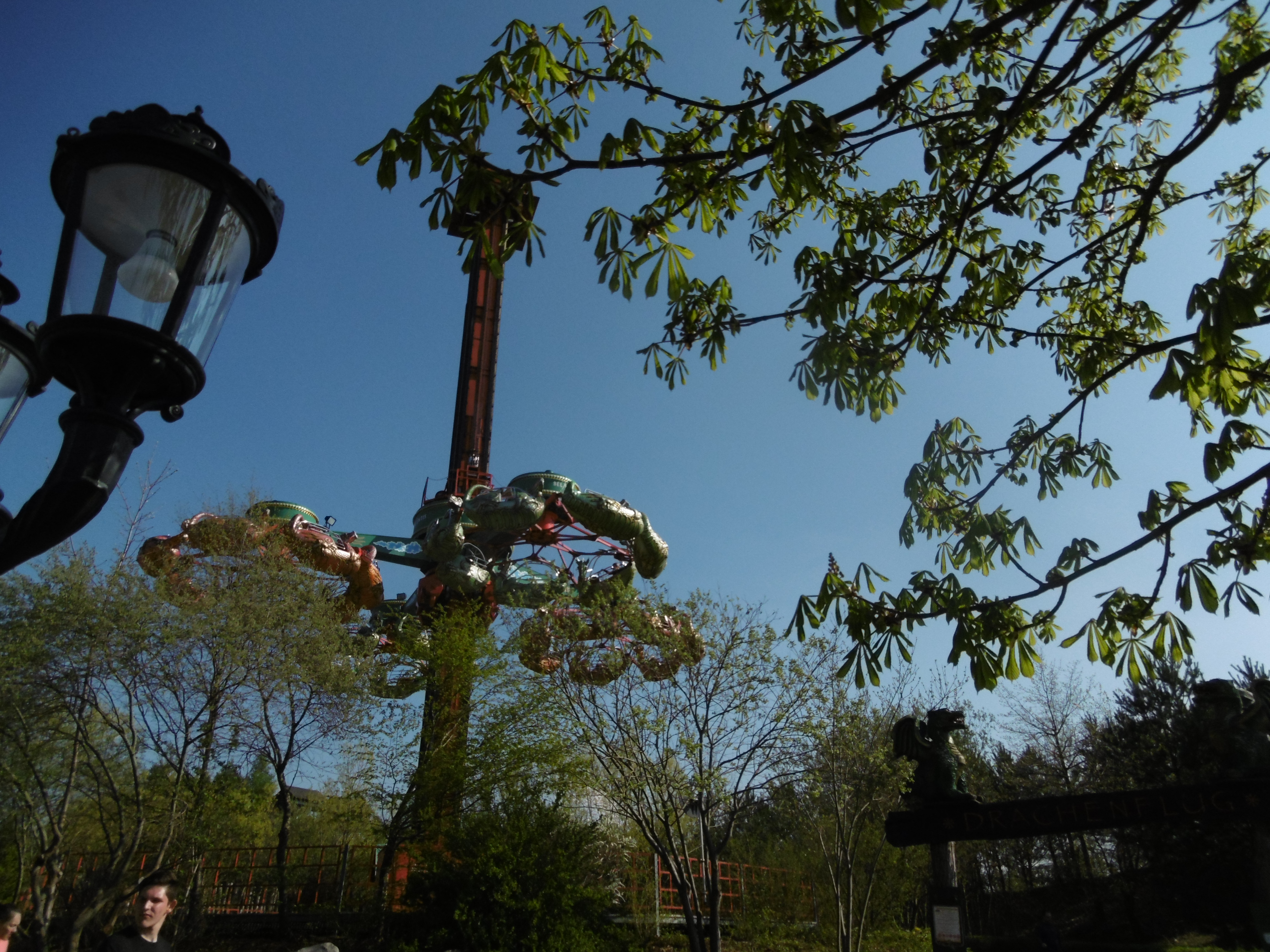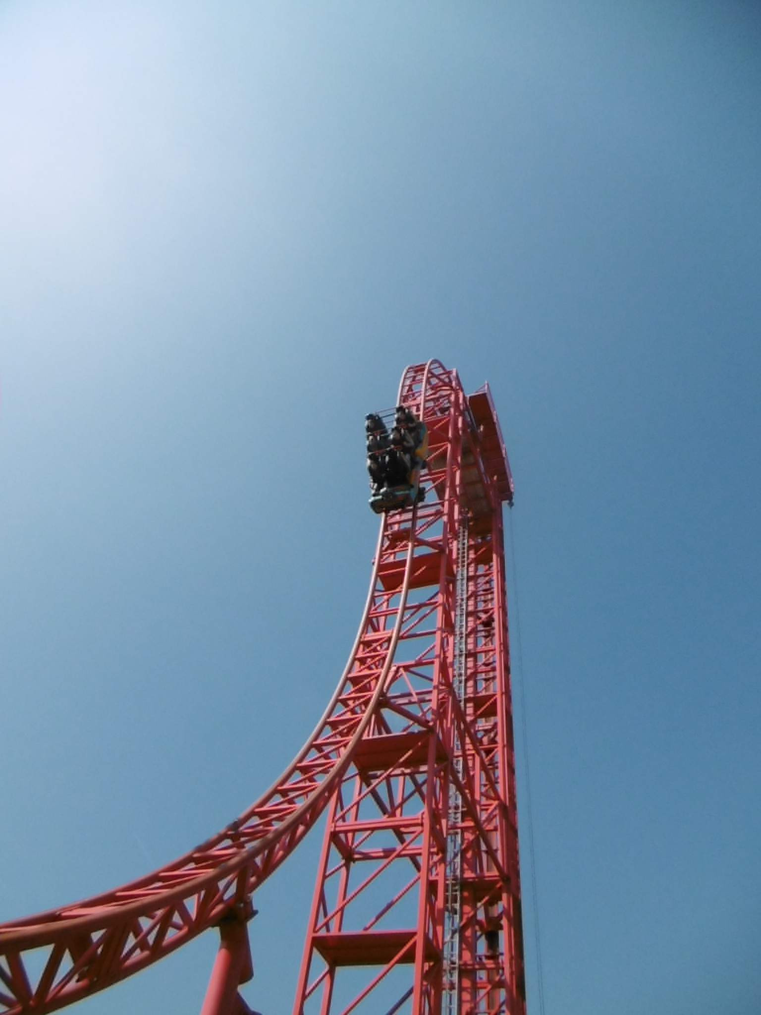 Nach ganz kurzer Wartezeit haben wir vorne Platz genommen und konnten den Weg zum senkrechten Lift in Angriff nehmen. Oben angekommen kam es zur diesjährigen Neuheit, der Schockstarre. Senkt die Kapazität, vermindert die Geschwindigkeit und gibt ein wenig die Chance, sich den Park aus 32 Metern Höhe anzusehen.