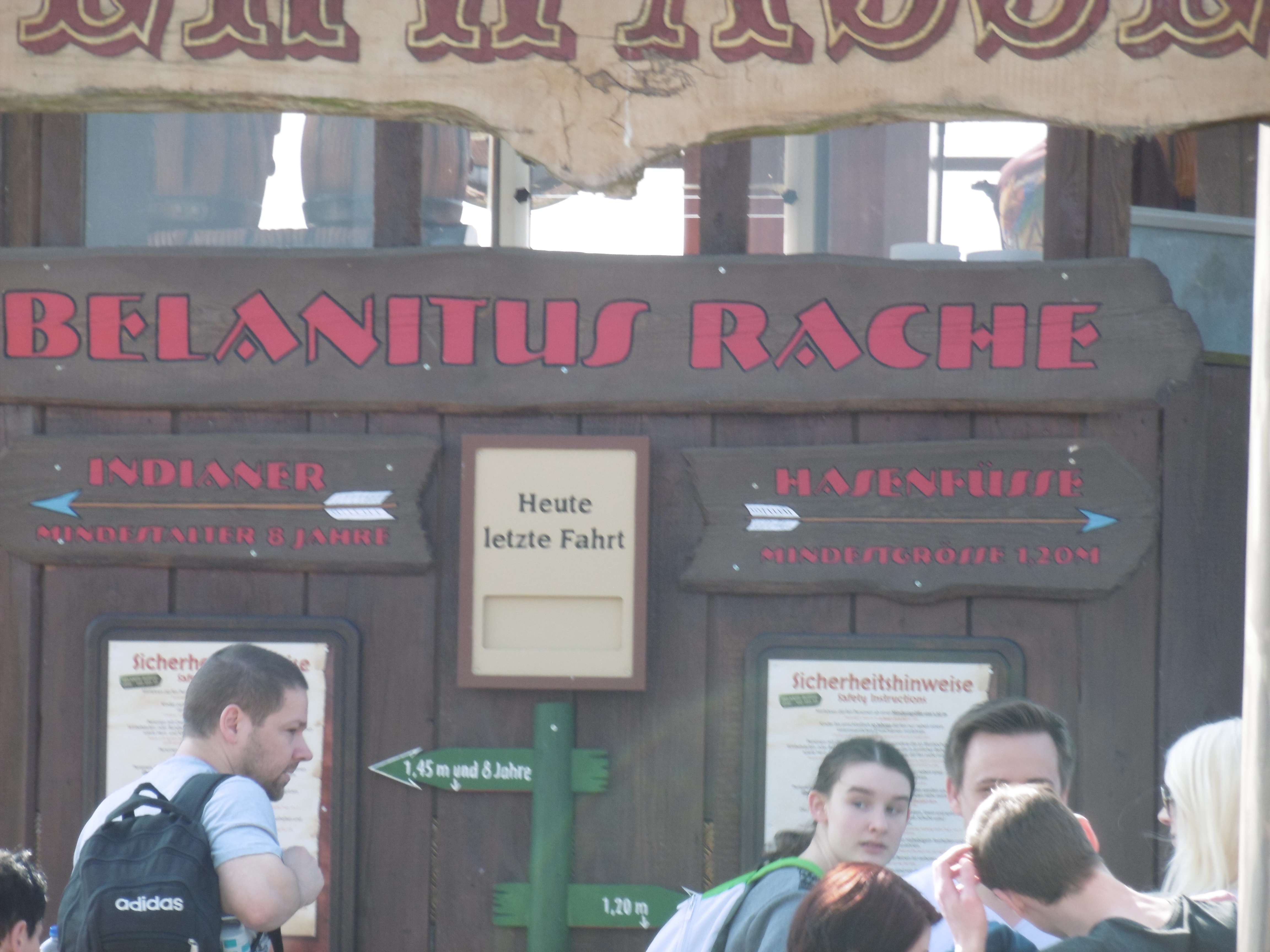 Den ganzen Tag sah ich schon viele Kinder und Jugendliche mit Bemalung im Gesicht und Stirnband durch den Park laufen. Auf dem Bild ist auf der linken Seite der Grund zu sehen. Jede Bank ist besetzt und die Kids freuen sich, Indianerschmuck herzustellen und diesen Stolz durch den Park zu tragen. Aber auch für Erwachsene gibt es hier etwas zum Fahren. Gerade als ich angekommen bin, wurde damit begonnen die Gondel des Belanitus Rache zu beladen.
