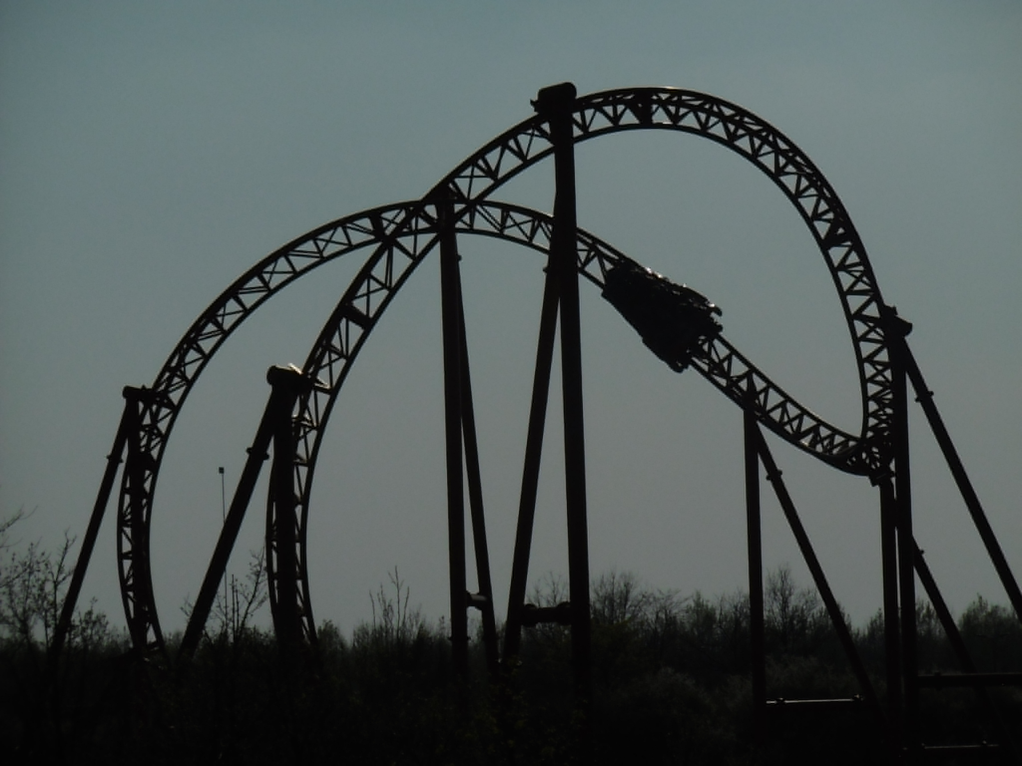 V.a. hinten wird der Fahrgast noch auf dem Lifthill durch den langen Zug schön in die Tiefe gezogen und bei diesem Umschwung GeForce-ähnlich schön herumgerissen.