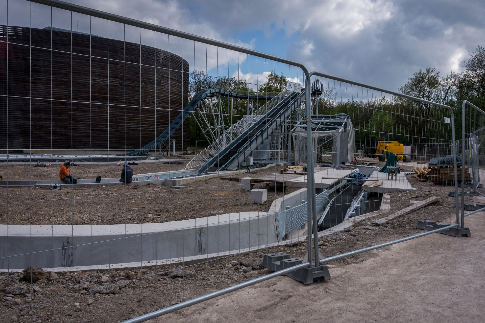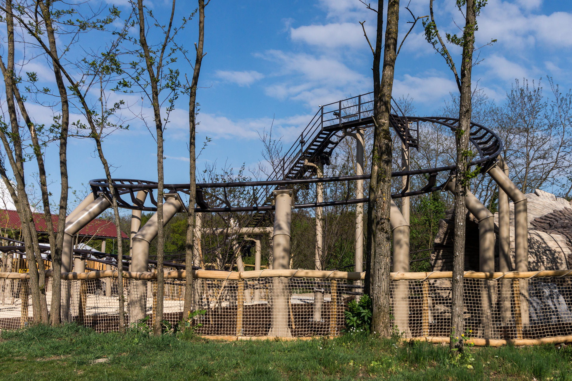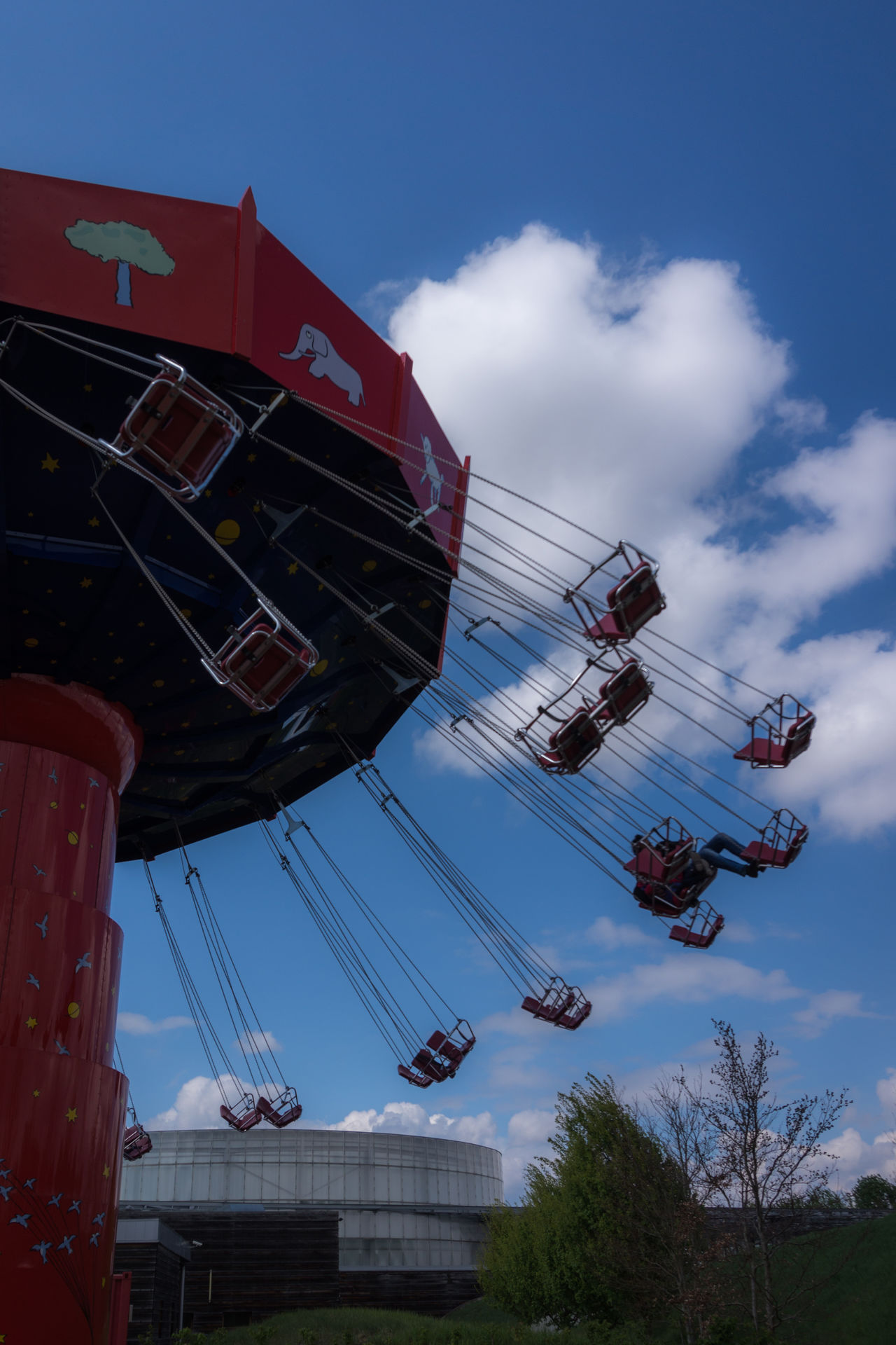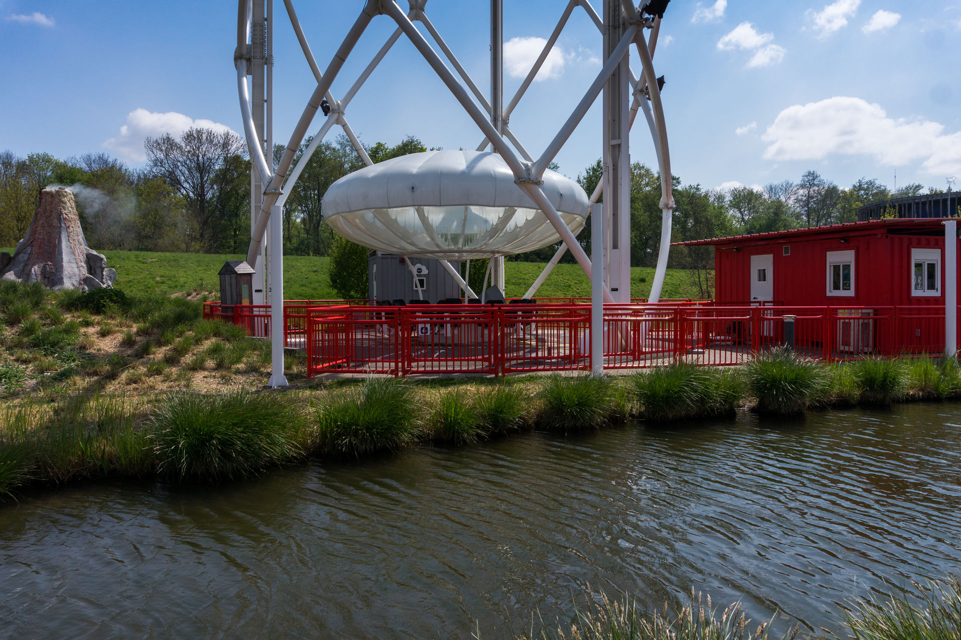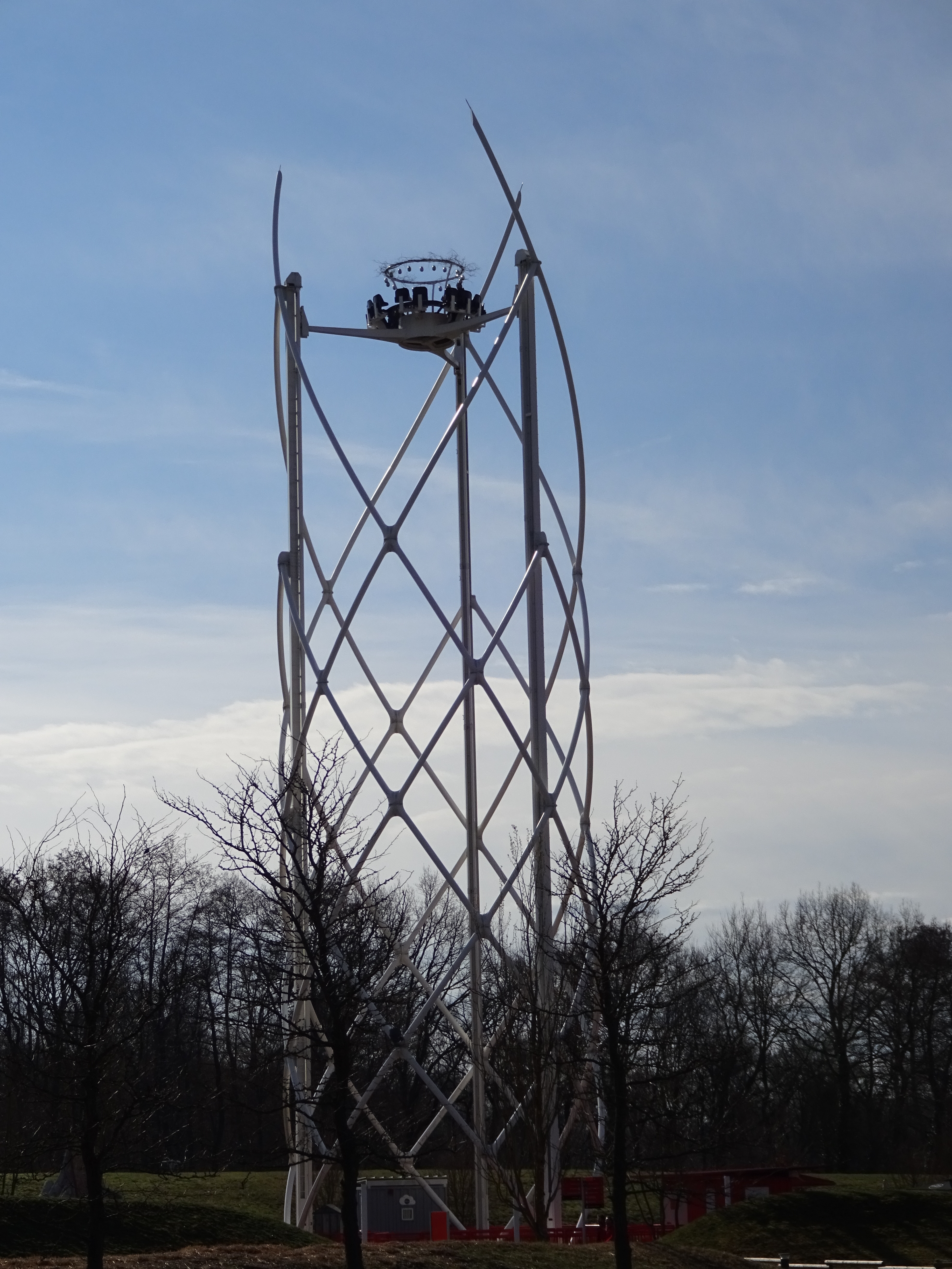 Da die beiden Fesselballone wegen des starken Winds am Boden bleiben mussten, blieb uns nur die „Aérobar du Buveur“, also die Luftbar des Säufers übrig um den Park von oben beobachten zu können. Hierbei handelt es sich um einen sehr interessant konstruierten Aussichtsturm, bei den die Fahrgäste mit baumelden Füßen um einen Tisch sitzen. Als interessantes Gimmick darf und soll man dabei Getränke und Speisen mit nach oben nehmen, eine Pflicht dazu besteht jedoch nicht.