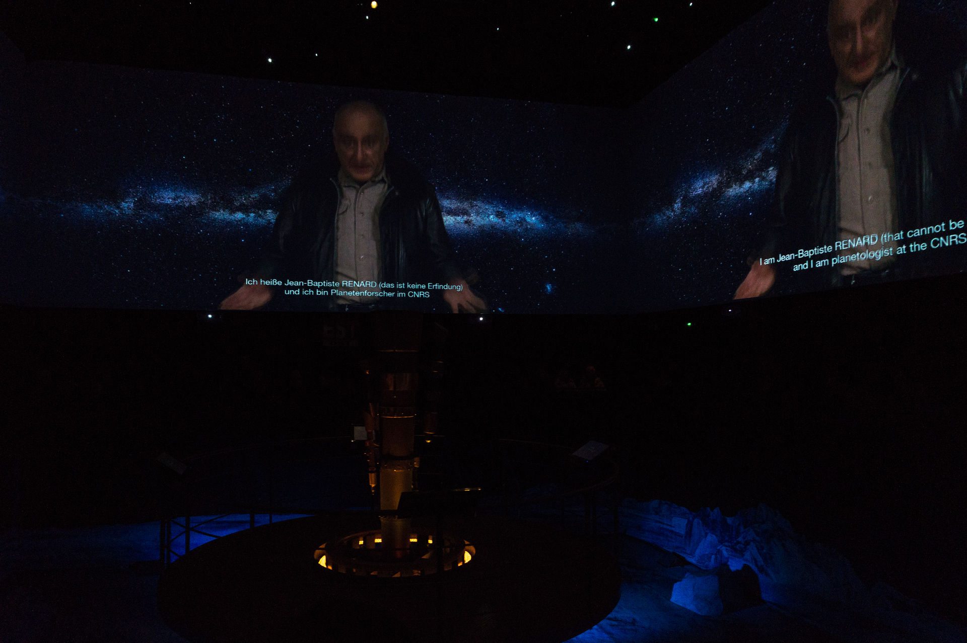 Eine weitere Hauptattraktion des Parks ist das interaktive Theater „Questions Astronomiques“, bei der man dem Astronomen, also dem Enkel des Entdeckers des Asteroiden B-612, hilft den kleinen Prinzen zu finden. Unterstützung bekommt dieser von Jean-Baptiste Renard, Forschungsdirektor der globalen Umwelt beim CNRS und natürlich uns. Pädagogisch wertvoll werden hier beeindruckende Bilder aus den Weiten des Alls gezeigt, zu dem jeweils drei Fragen (in Deutsch, Englisch und Französisch) gestellt werden. Dabei reagiert der Astronom in sehr humorvoller Weise mit den Gästen und den Videoeinbindungen, was schnell zu einer gewissen Dynamik innerhalb der vier Teams (Nord, Est, Sud und Ouest) kommt. Da wir eine Reihe für uns Alleine hatten, rannten wir diese schnellstmöglich ab um somit für mehr Spieler auf unserer Seite zu sorgen. Und man waren wir gut, bis dann die letzte Frage kam und Véronique uns die falsche Antwort als Teamantwort eingeben ließ… Generell ist der Schwierigkeitsgrad des Quizs ziemlich hoch und viele Lösungen eigentlich nur durch Intuition lösbar, was dem Spaß insgesamt sogar förderlich ist. Auf der Rückseite des großen Showtheaters befindet sich noch die Ausstellung „Exposition Saint-Exupéry“, sowie die große Kreidetafel „Dessine-moi un mouton“, bei der die Kinder tatsächlich hauptsächlich Schafe gezeichnet haben.