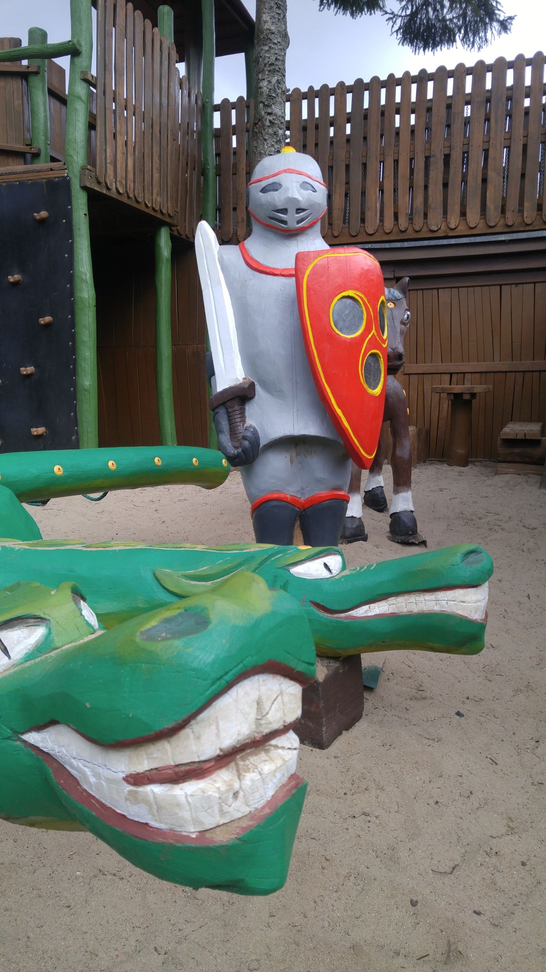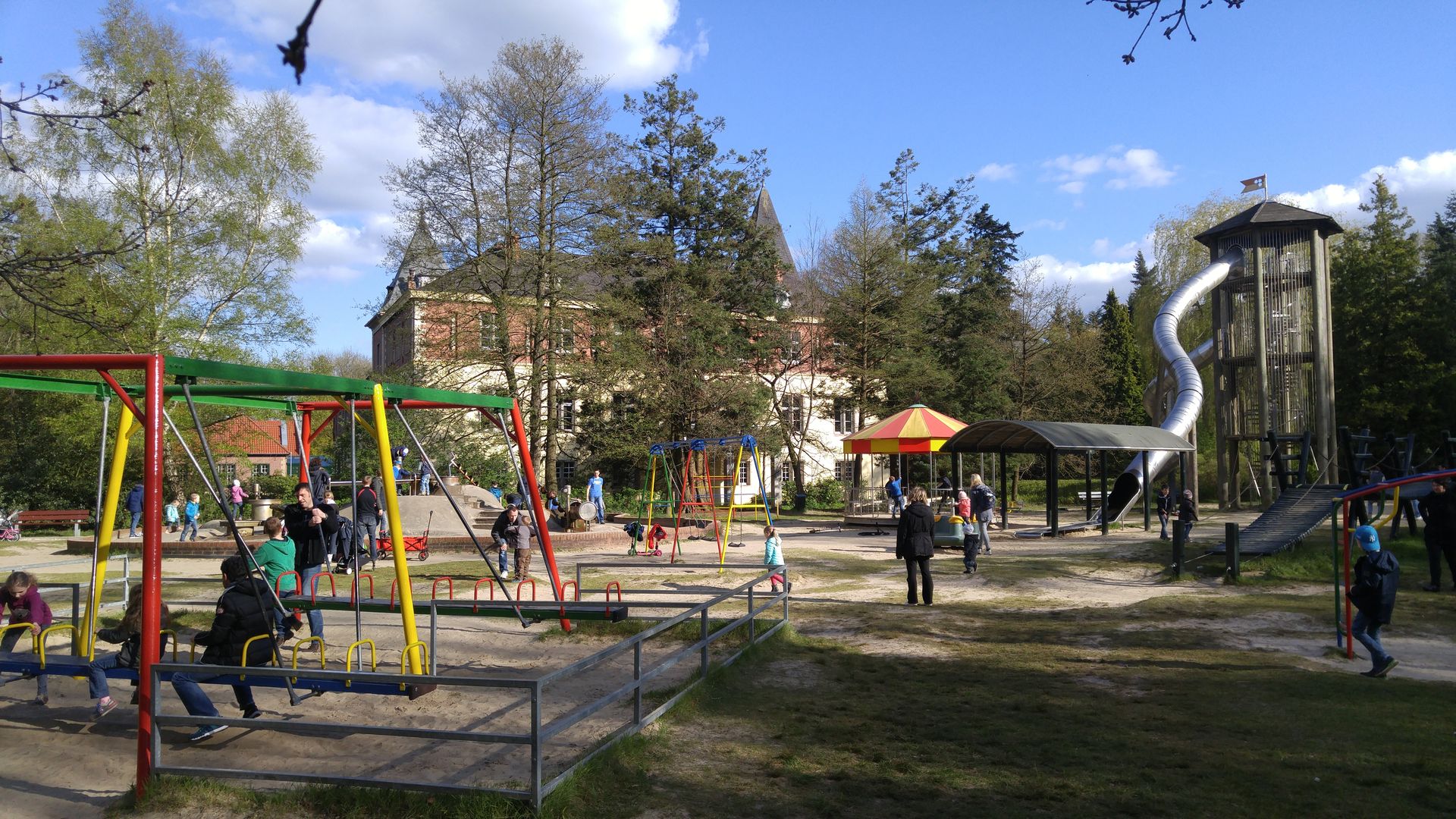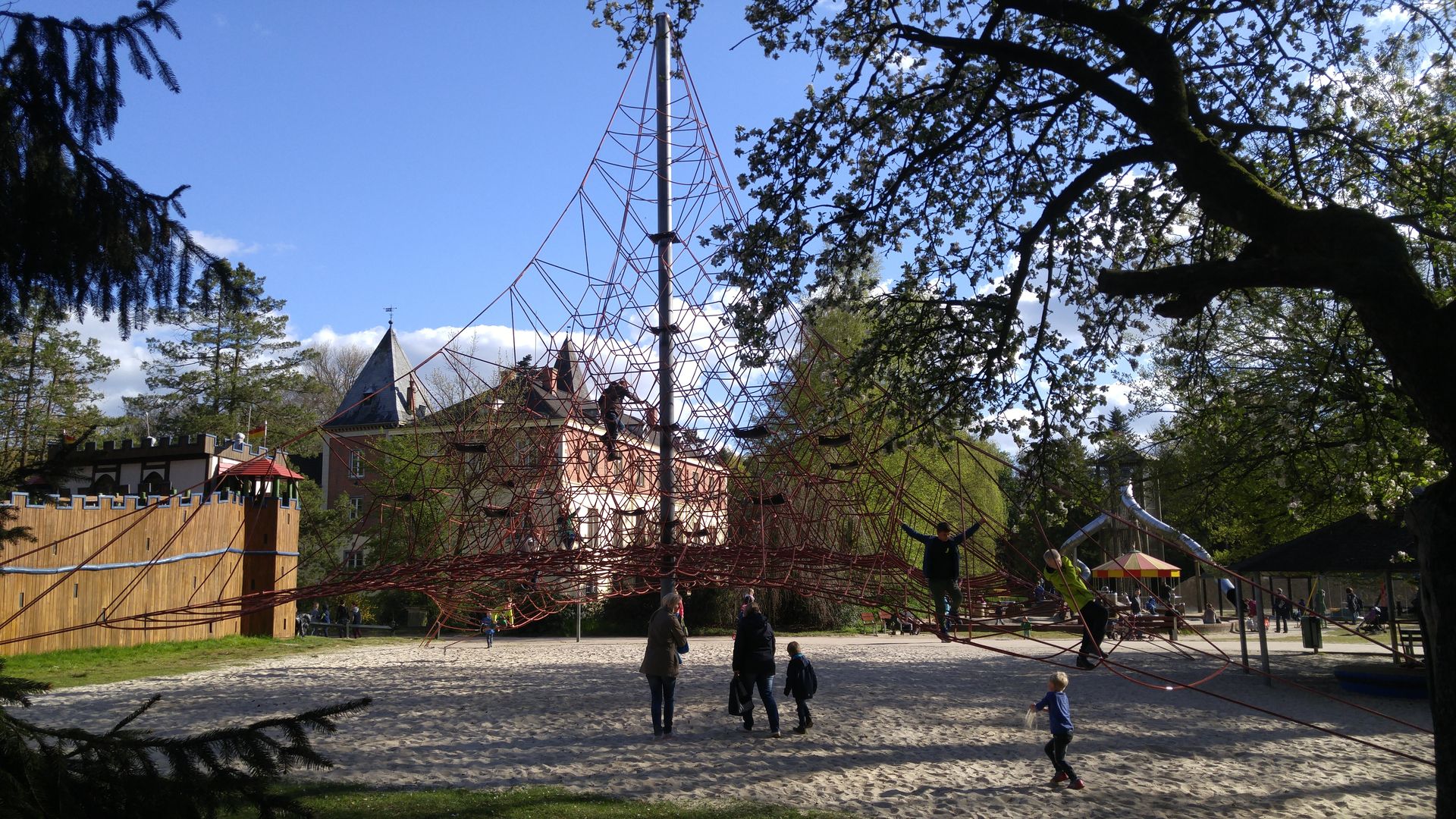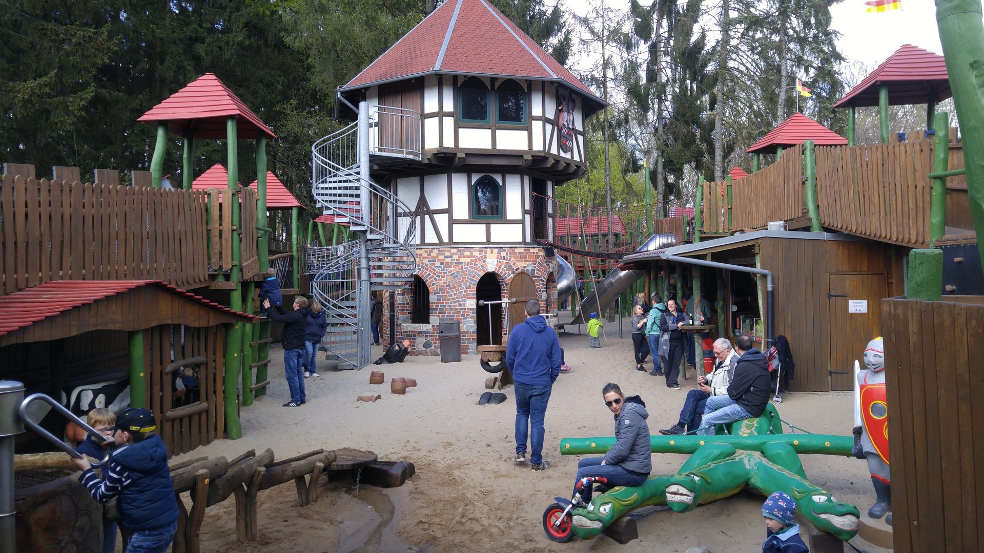Seitlich vom Schloss, einer Art Rundlauf folgend, befinden sich ein Freibad samt Wasserrutschen (war bei den Temperaturen noch nicht in Betrieb), eine klassische Bootsrutsche von Metallbau Emmeln und die wirklich fantastische Spielburg Drago, wo für größere und kleinere Kinder Spielen, Klettern und Rutschen möglich ist. Seitlich daneben ein wirklich opulentes Klettergerüst, nichts für Kleine oder Höhenängstler.