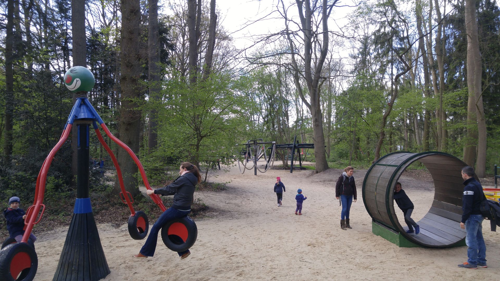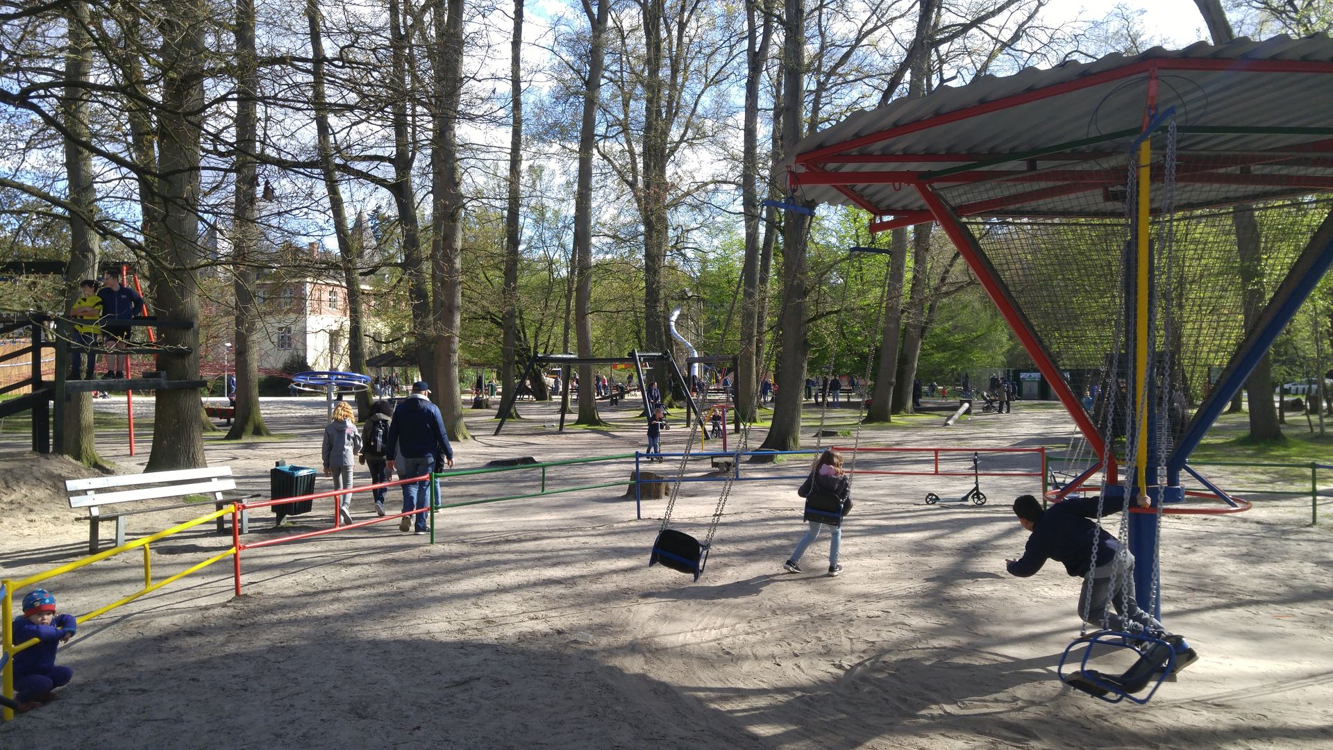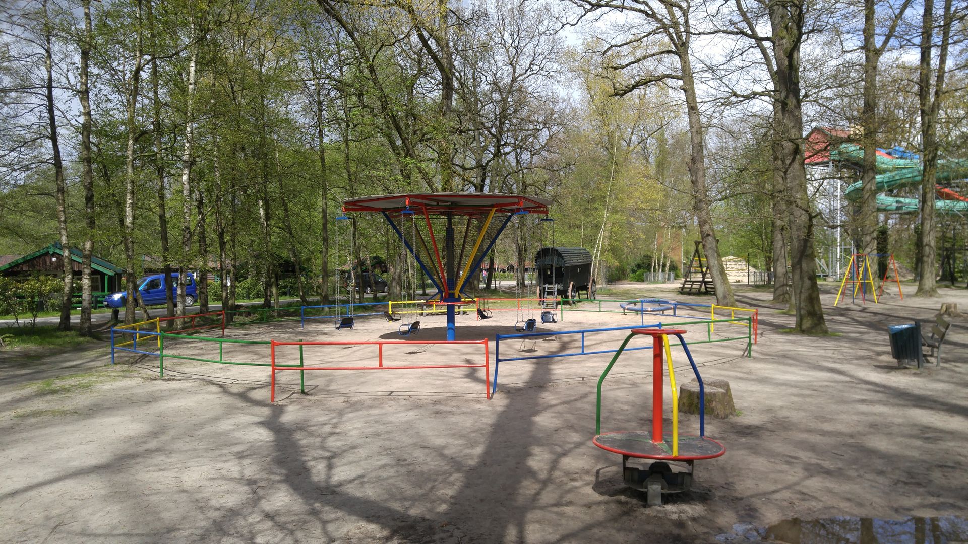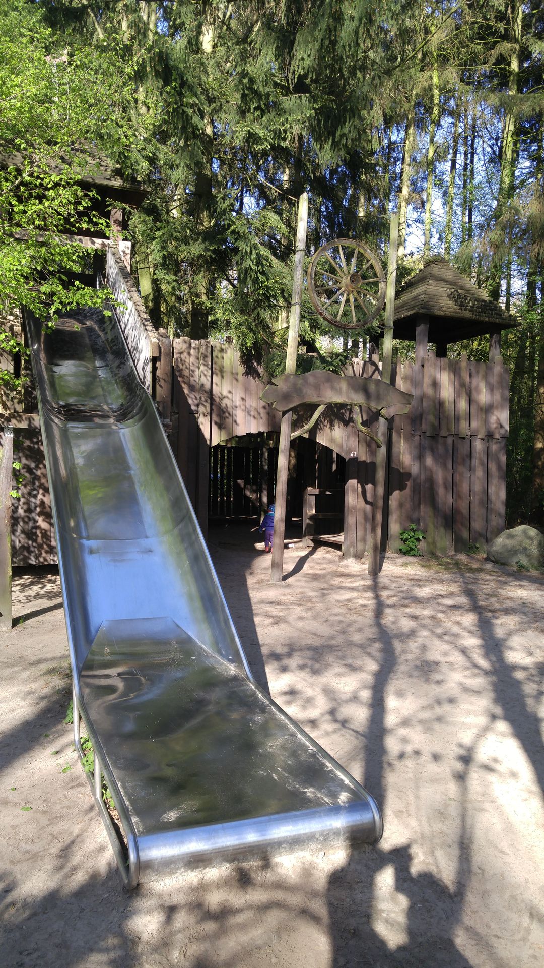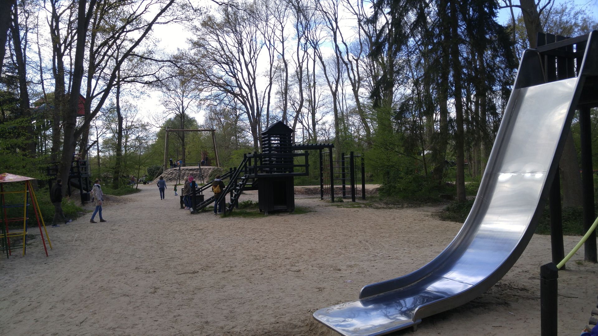 Auf dem Weg zurück in Richtung Haupteingang befinden sich noch etliche Spielgeräte, Rutschen, Schaukeln auf dem Weg. Und wenn man diesen verlässt und in die Nebenarme im Wald geht, befinden sich dort noch mehr. Und über die Straße noch deutlich mehr.