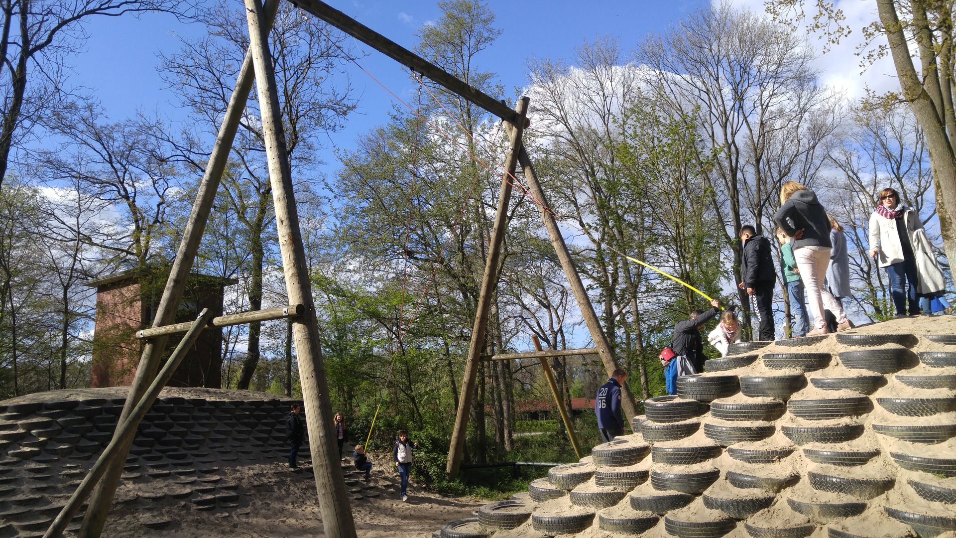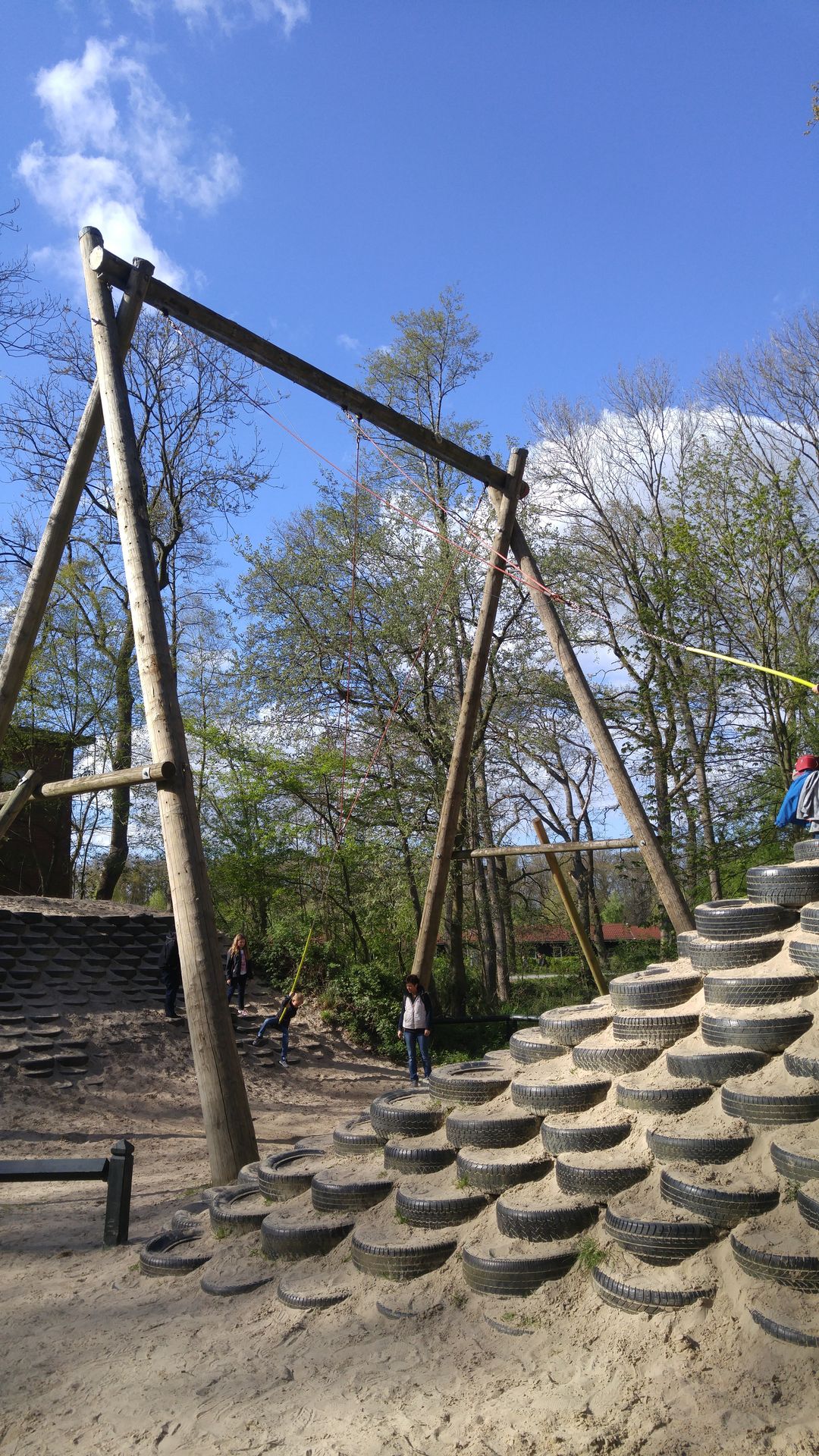 Zum einen gibt es Standardschaukeln, die aber durch eine äußerst opulente Höhe bestechen. Bei vollem Ausschwung erreicht man dort knapp drei Meter Höhe. Für Kinder ein Traum, für die Eltern leider nicht, ist das Kettenkarussell zum selber drehen. Es ist sehr massiv gebaut und erreicht etwa einen Flugradius von fünf Metern, was aber eben auch bedeutet, das enorm viel Masse in Schwung gebracht werden muss. Und jedes mal wenn man denkt, jetzt kann man pausieren, schreien die Kinder "Schneller". Auch die XXL-Schaukel mit Reifenstapeln sind äußerst beliebt.