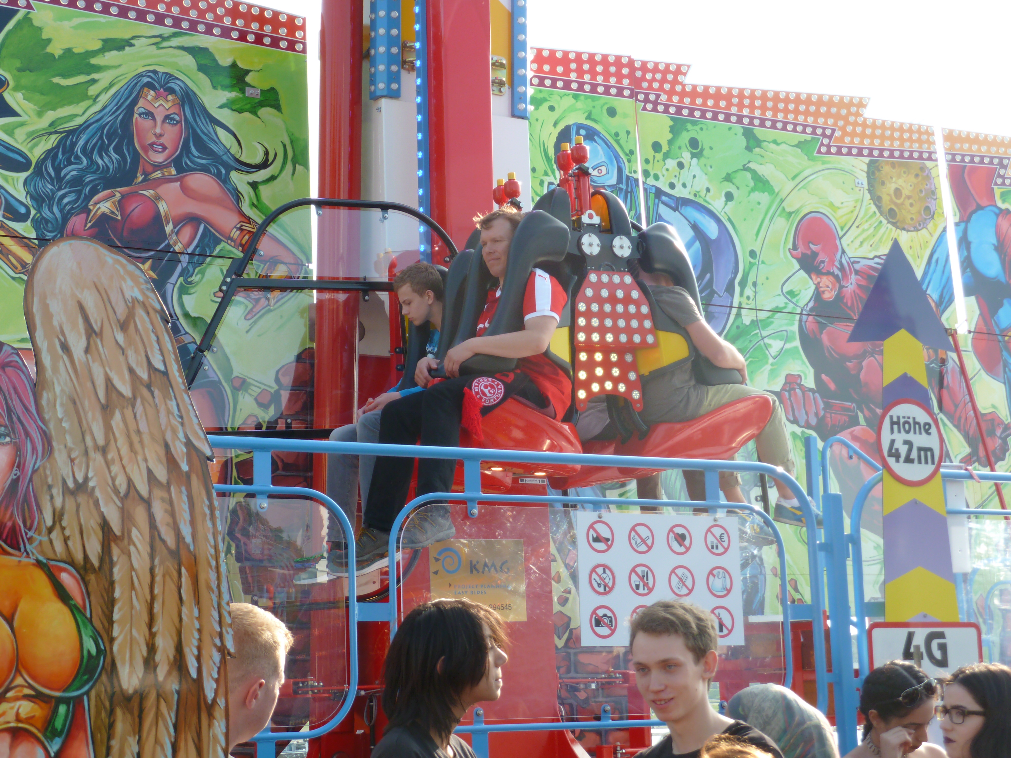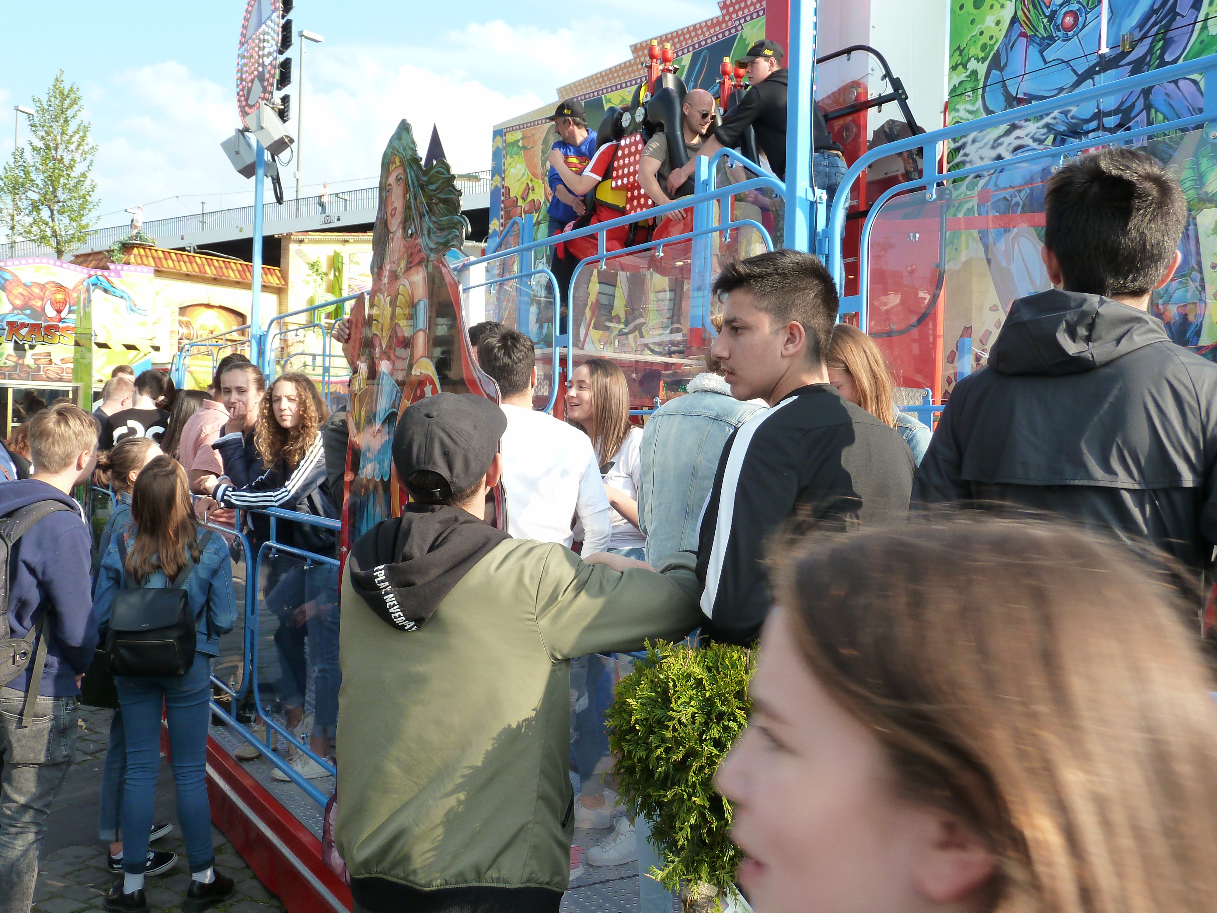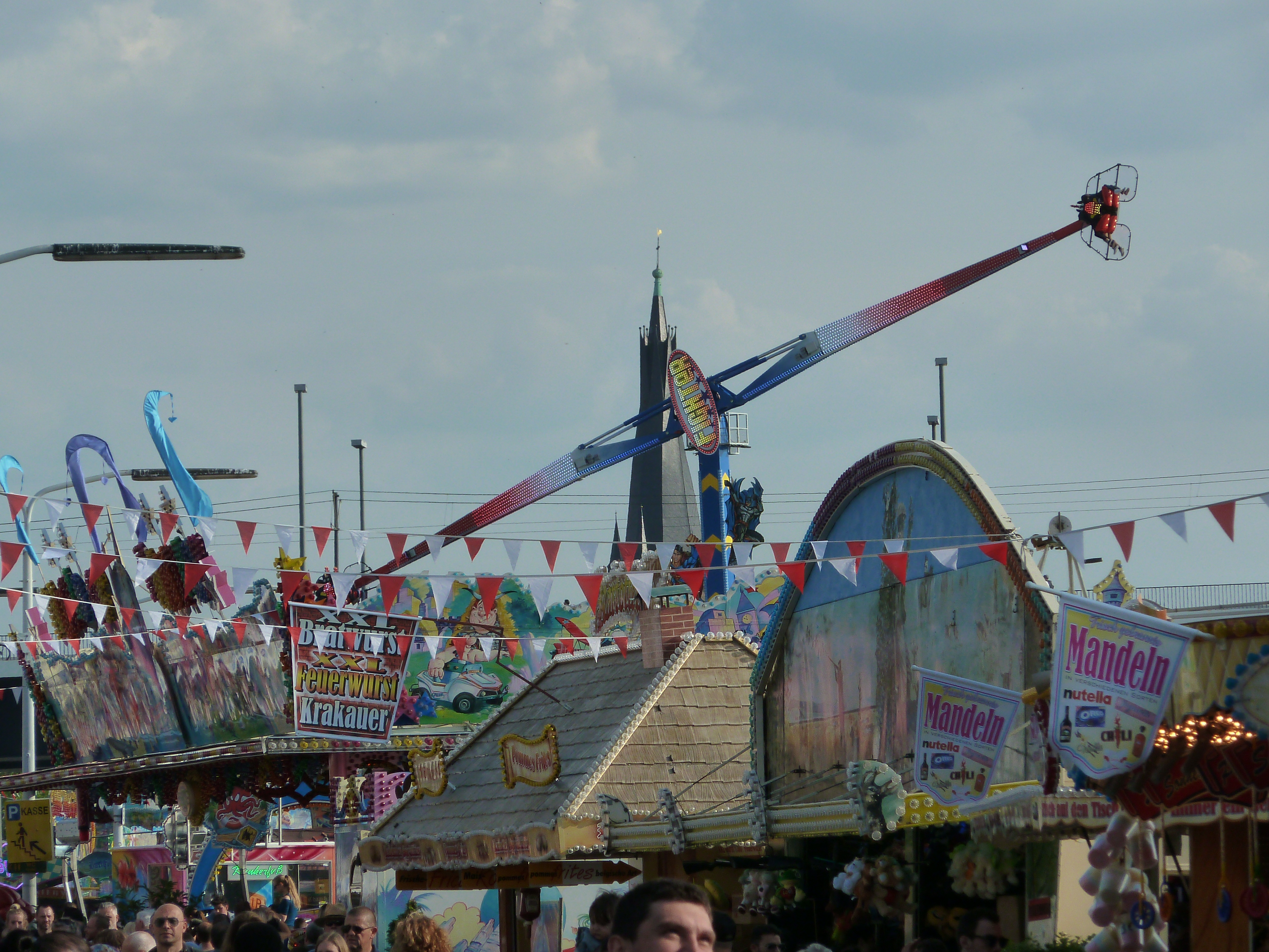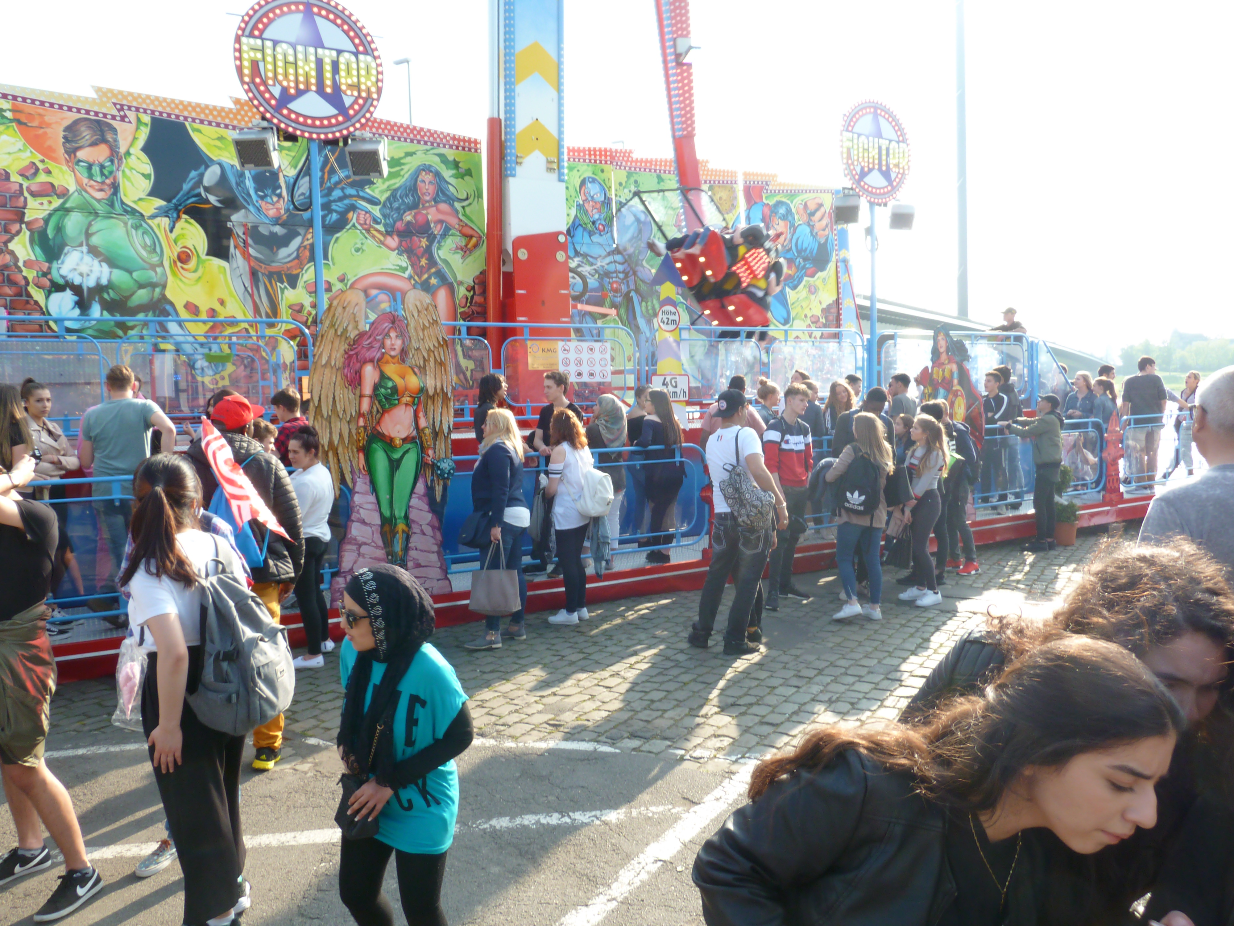 früher Samstag Abend in der Düsseldorfer Altstadt: Büchermeile, Shoppingzeit, Fuchs trinkende Fortuna-Fans, super Wetter, Sonne satt und eine gut bestückte Frühlingskirmes anne Tonhalle, das sorgte für eine prall gefüllte City und Altstadt. Ich wollte den Fighter counten, aber dieser war von der Zielgruppe der 14 - 16 jährigen komplett belagert gewesen bei 5 Euro Fahrpreis. Habe mir dann nur den Fahrchip für die Sammlung gekauft. Übrigens, Ehrenkarten für Deine Sammlung sind erst bei der nächsten Station des Fighters in Krefeld käuflich zu erwerben. Erkenntis: Propeller sind genau so wie die Launchcoaster ein Trend für die Ewigkeit. War auf jeden Fall mächtig was los gewesen, aber seht selbst: