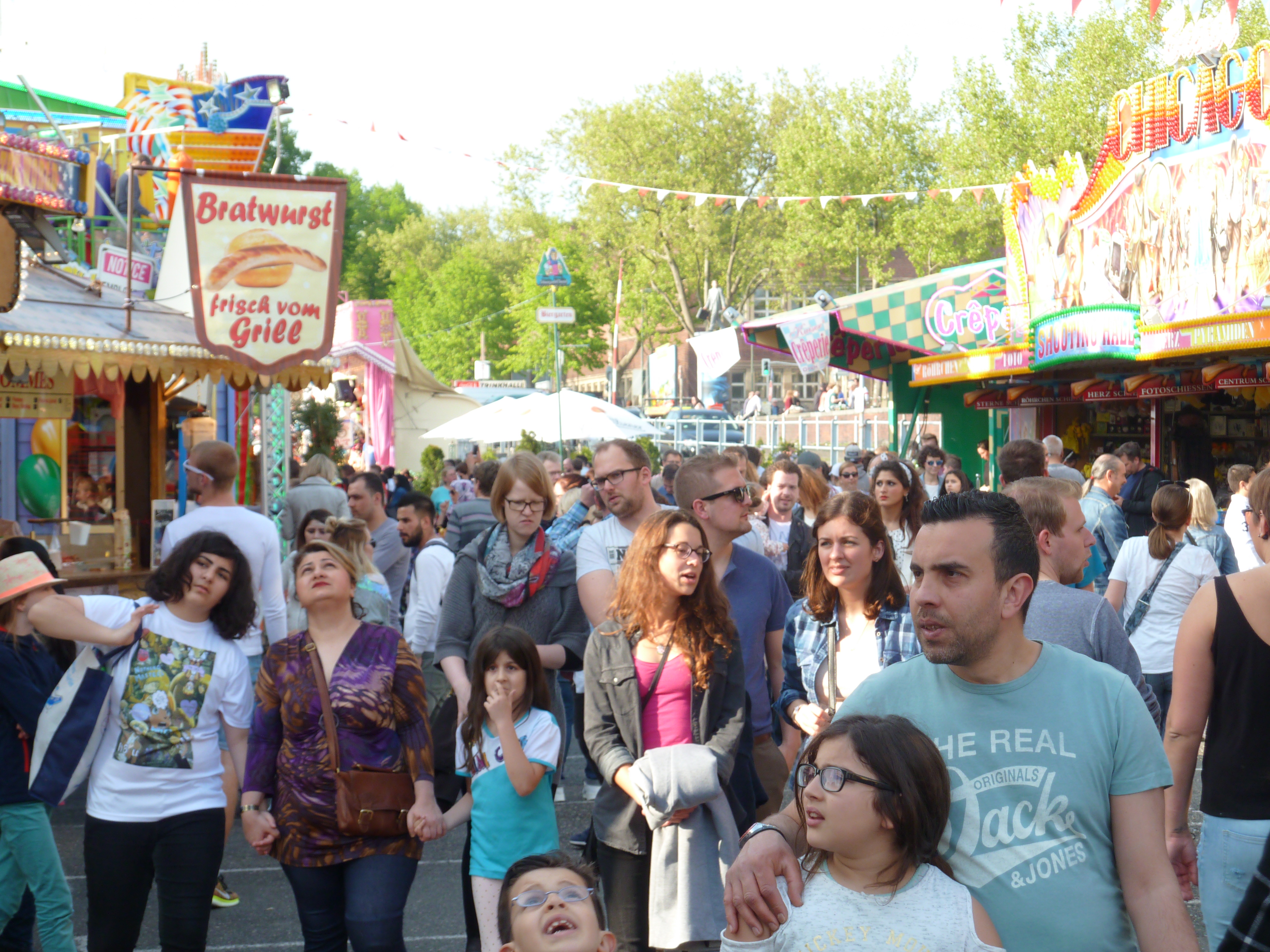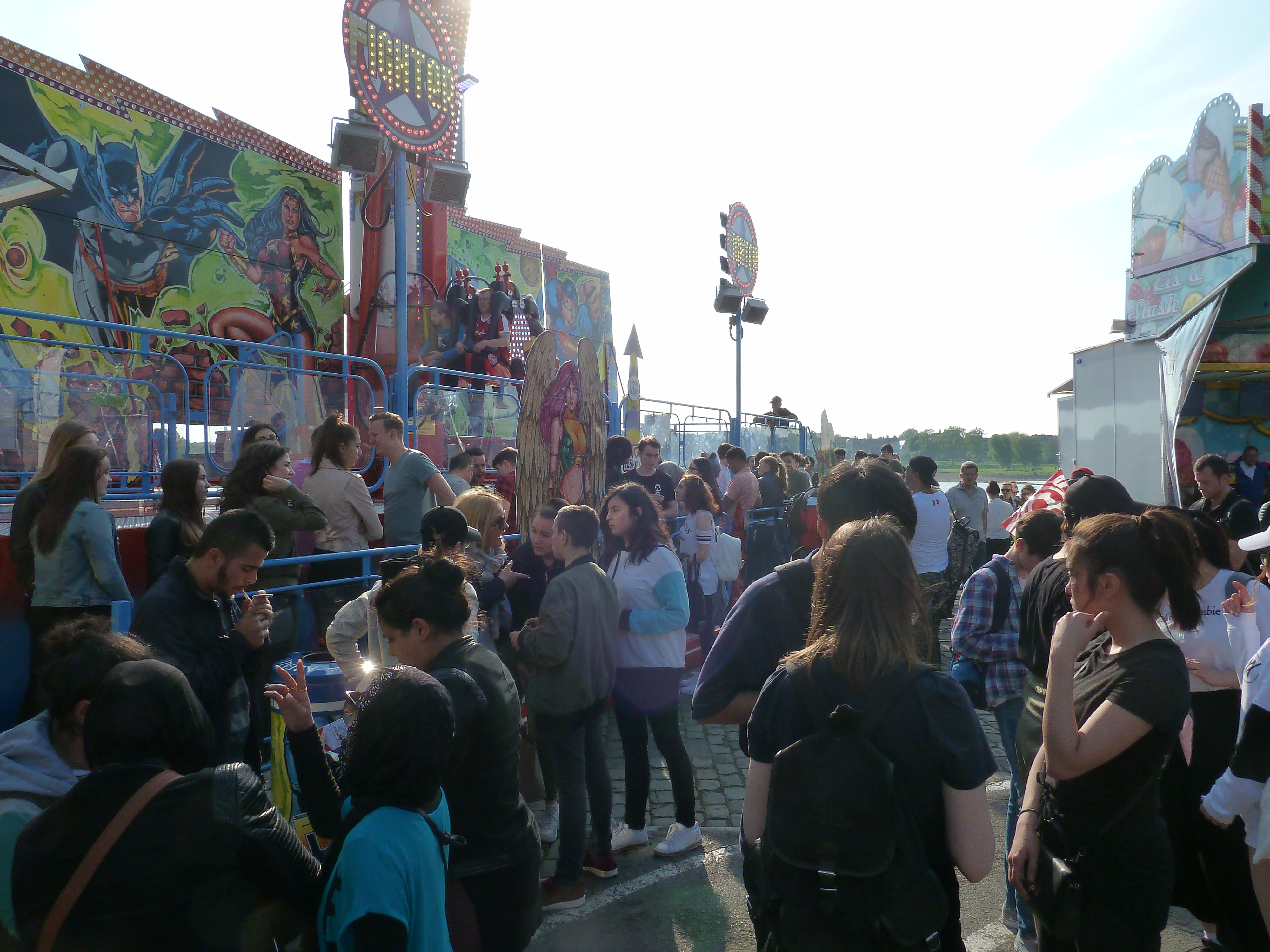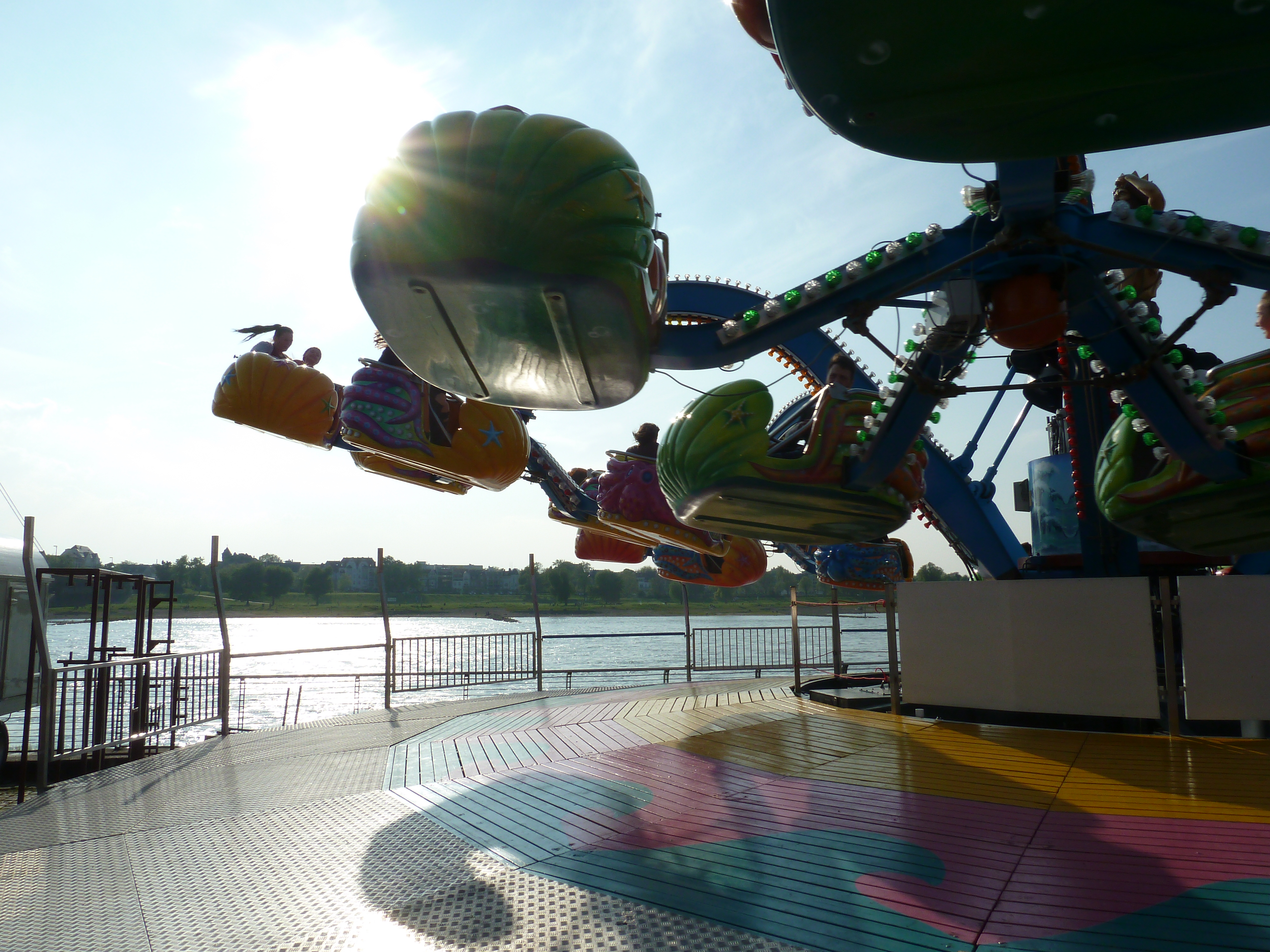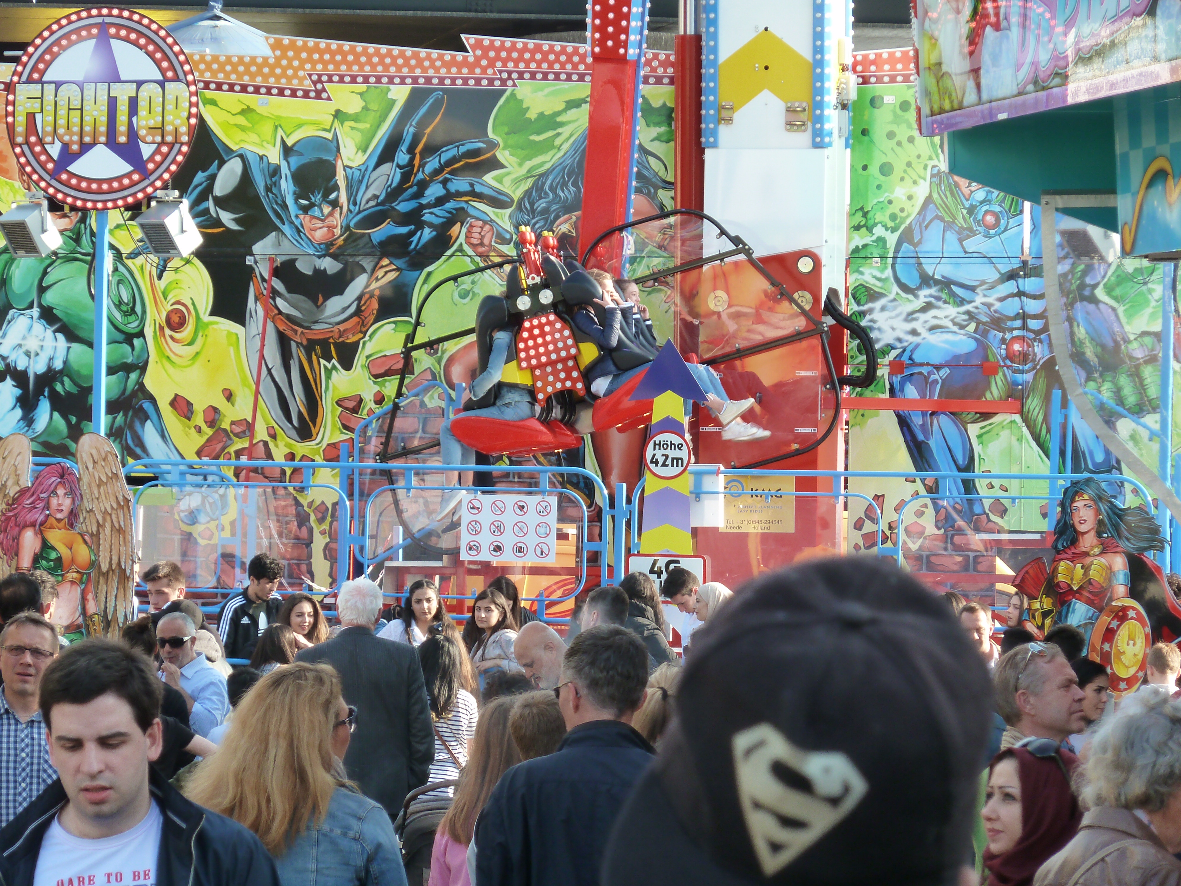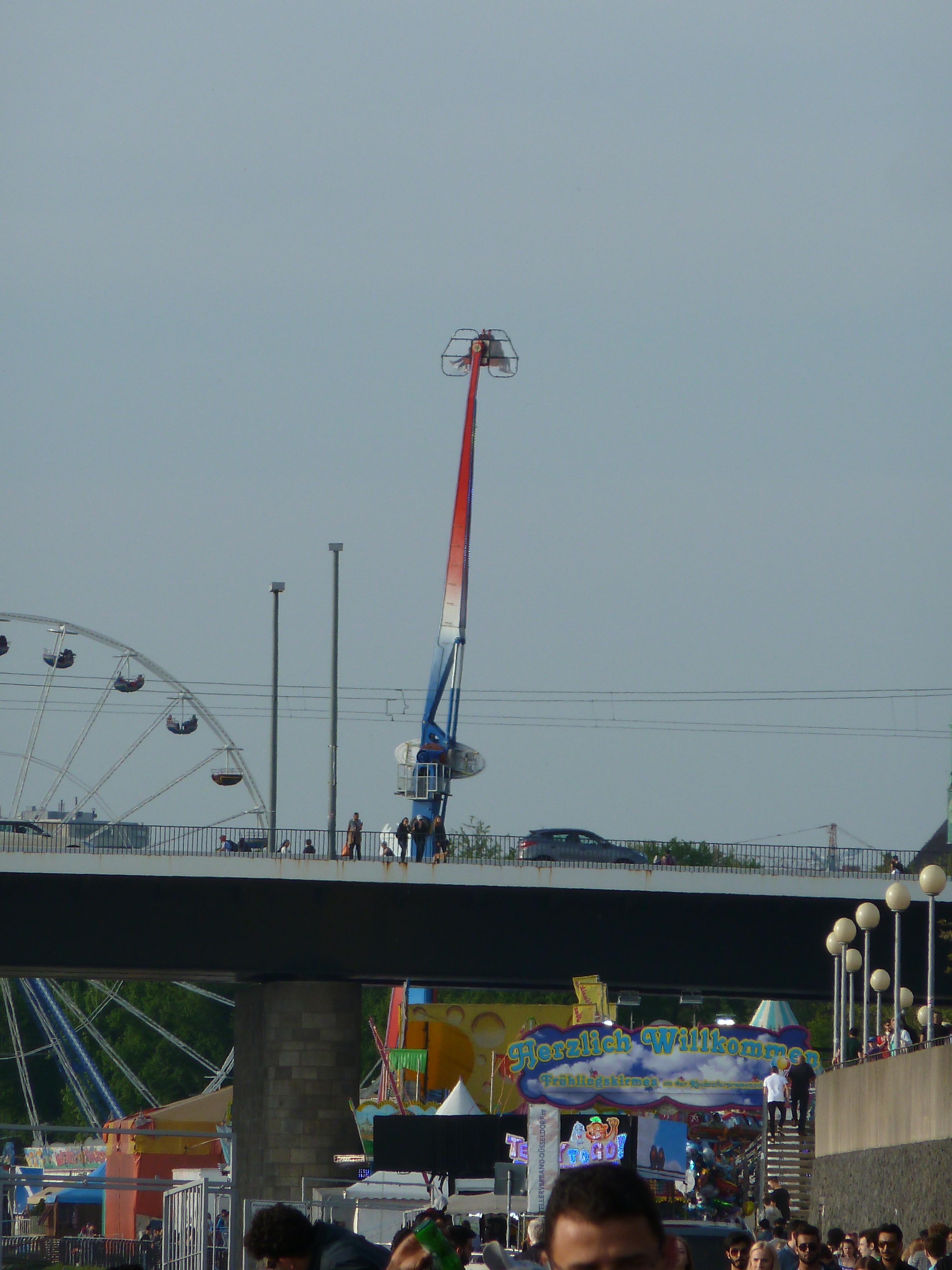 früher Samstag Abend in der Düsseldorfer Altstadt: Büchermeile, Shoppingzeit, Fuchs trinkende Fortuna-Fans, super Wetter, Sonne satt und eine gut bestückte Frühlingskirmes anne Tonhalle, das sorgte für eine prall gefüllte City und Altstadt. Ich wollte den Fighter counten, aber dieser war von der Zielgruppe der 14 - 16 jährigen komplett belagert gewesen bei 5 Euro Fahrpreis. Habe mir dann nur den Fahrchip für die Sammlung gekauft. Übrigens, Ehrenkarten für Deine Sammlung sind erst bei der nächsten Station des Fighters in Krefeld käuflich zu erwerben. Erkenntis: Propeller sind genau so wie die Launchcoaster ein Trend für die Ewigkeit. War auf jeden Fall mächtig was los gewesen, aber seht selbst: