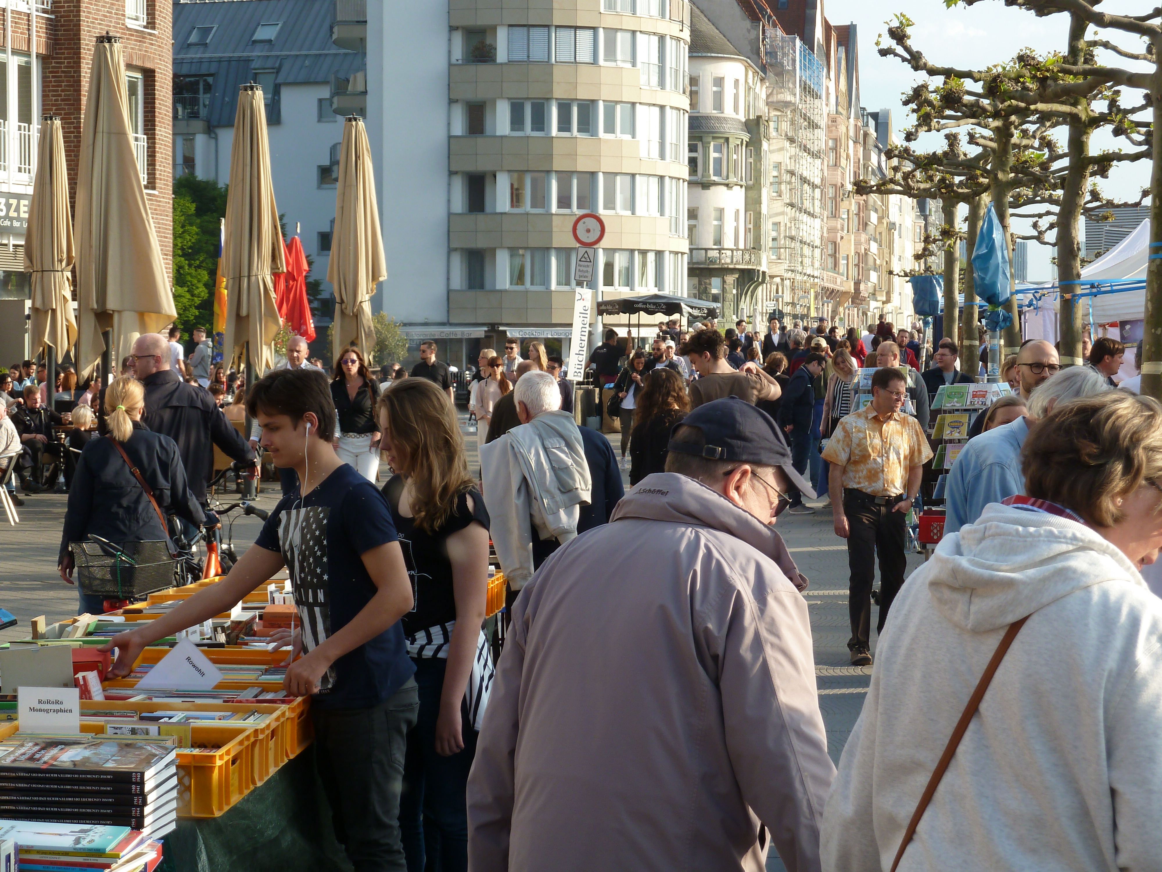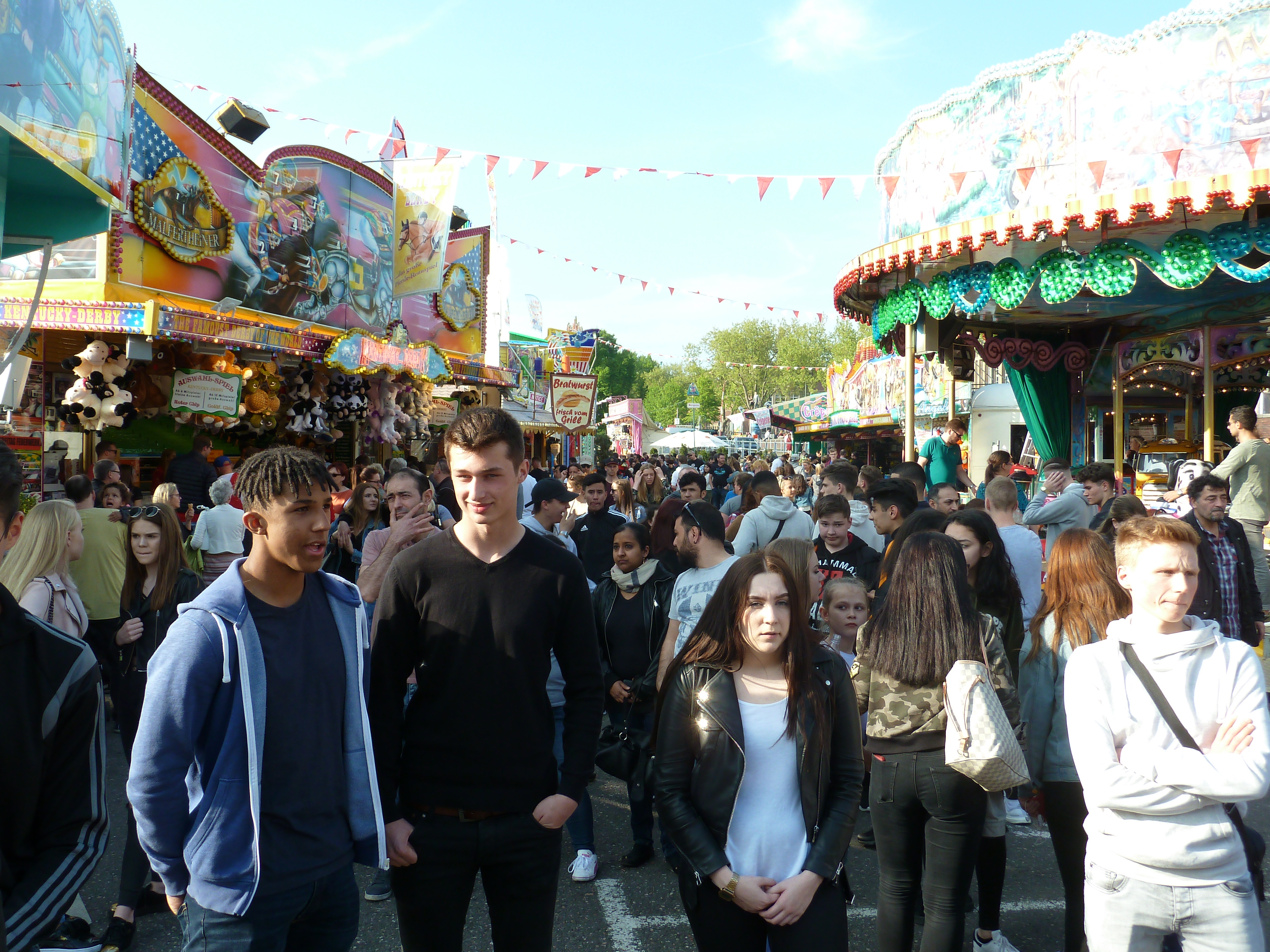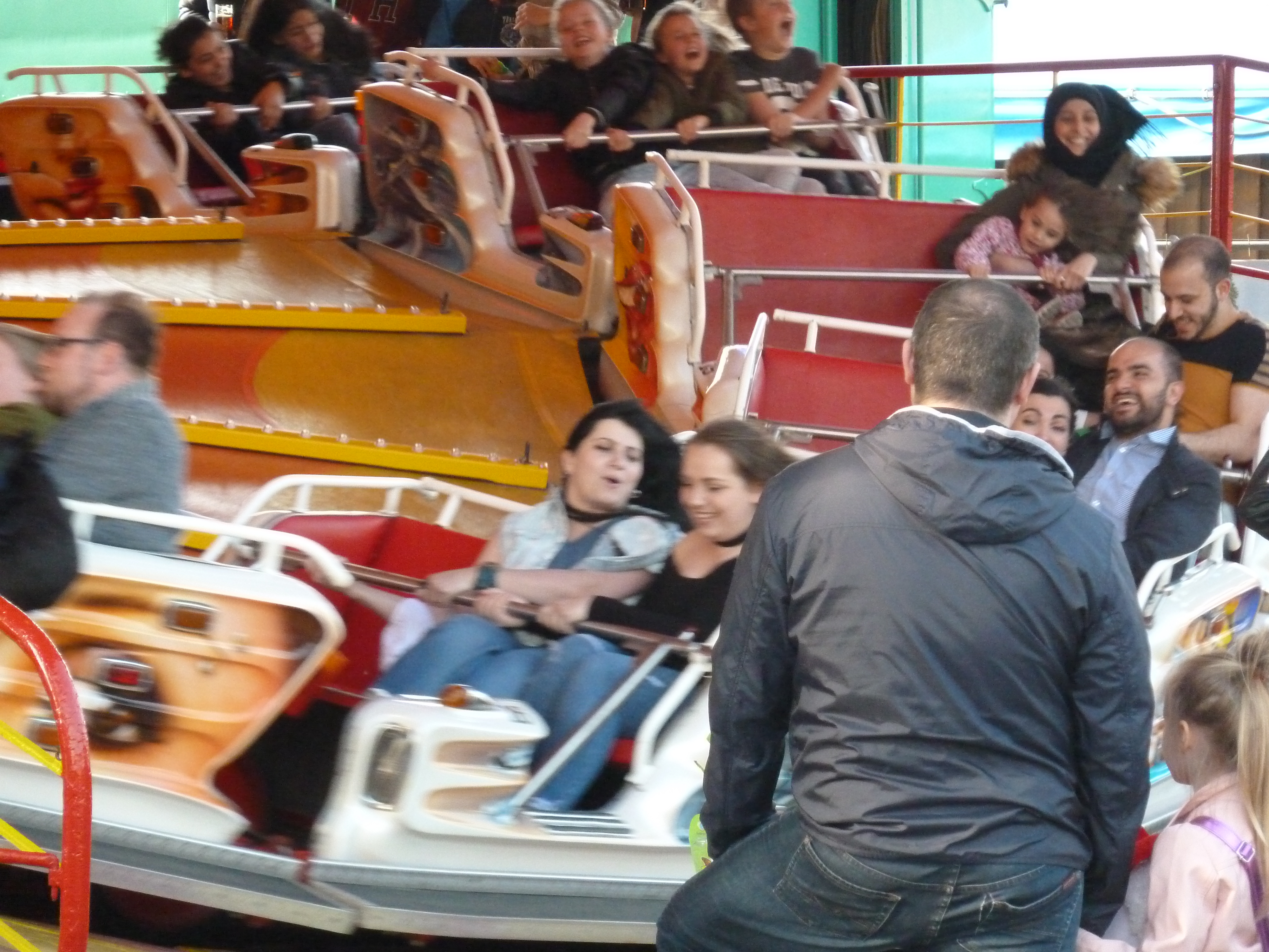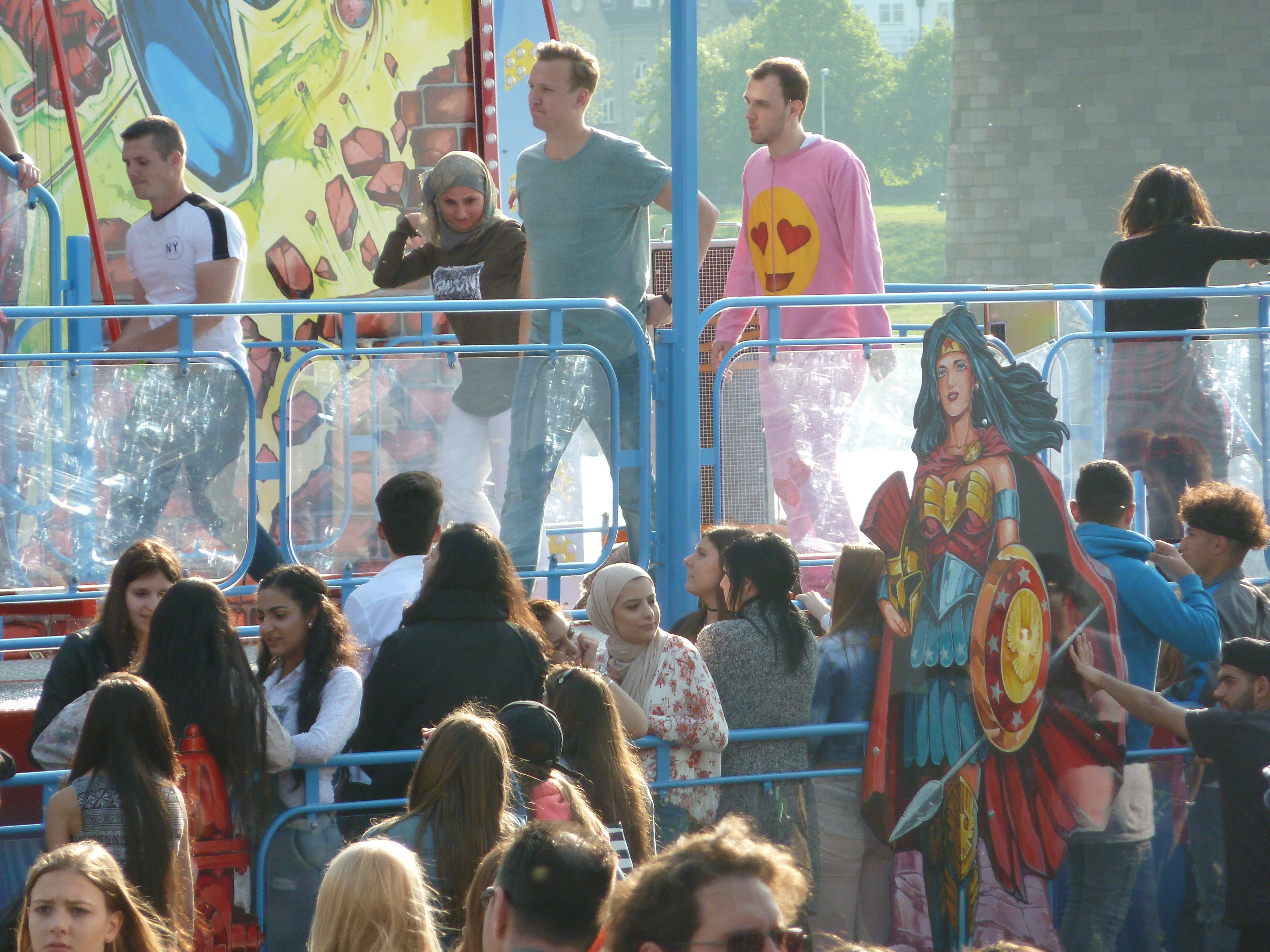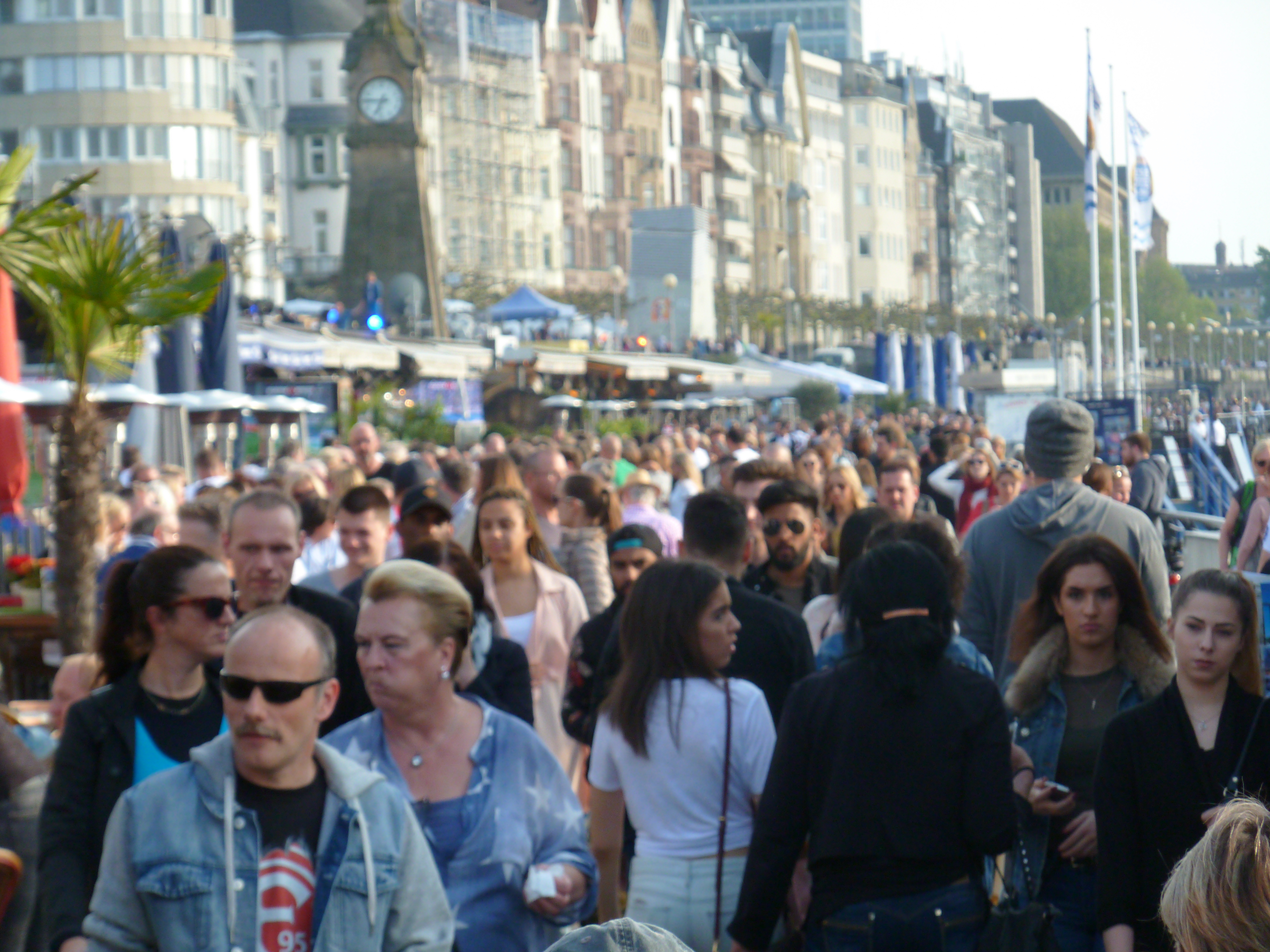 früher Samstag Abend in der Düsseldorfer Altstadt: Büchermeile, Shoppingzeit, Fuchs trinkende Fortuna-Fans, super Wetter, Sonne satt und eine gut bestückte Frühlingskirmes anne Tonhalle, das sorgte für eine prall gefüllte City und Altstadt. Ich wollte den Fighter counten, aber dieser war von der Zielgruppe der 14 - 16 jährigen komplett belagert gewesen bei 5 Euro Fahrpreis. Habe mir dann nur den Fahrchip für die Sammlung gekauft. Übrigens, Ehrenkarten für Deine Sammlung sind erst bei der nächsten Station des Fighters in Krefeld käuflich zu erwerben. Erkenntis: Propeller sind genau so wie die Launchcoaster ein Trend für die Ewigkeit. War auf jeden Fall mächtig was los gewesen, aber seht selbst: