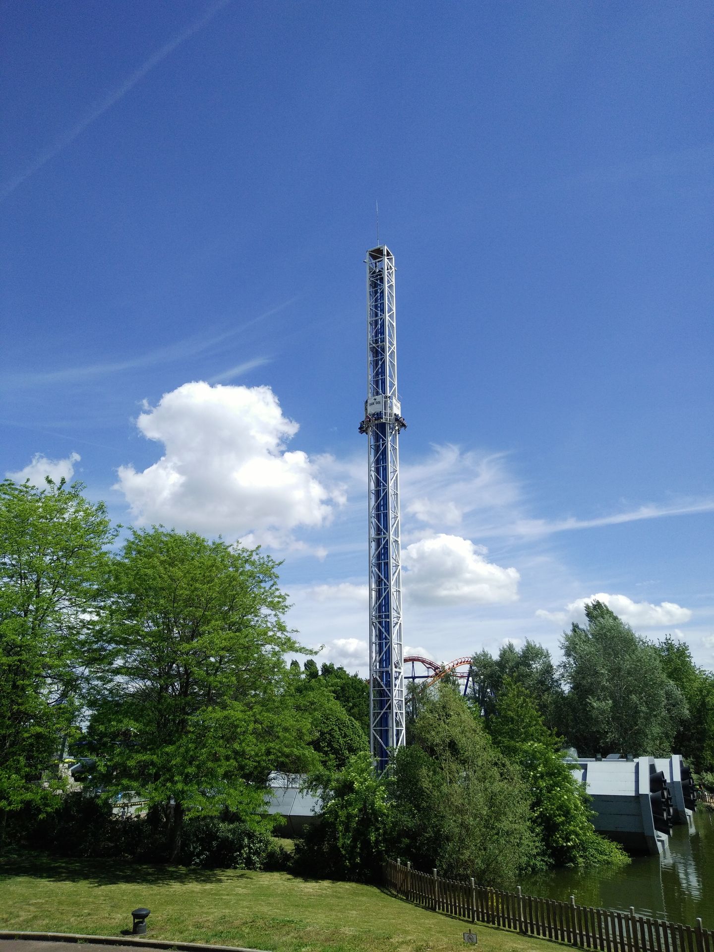 Im Space-bereich befindet sich auch noch dieses hübsche S&S Türmchen, welches uns mit seinem klangvollen Zischen anlockte. Hier konnte selbst ich als Freefall-Hasser nicht widerstehen und wagte Todesmutig eine Fahrt, um danach enttäuscht am Boden anzukommen. Das Ding konnte absolut gar nichts. Die Wende am oberen Punkt und der Fall wirkten irgendwie stark abgebremst, es gab keinerlei Magenkribbeln.
