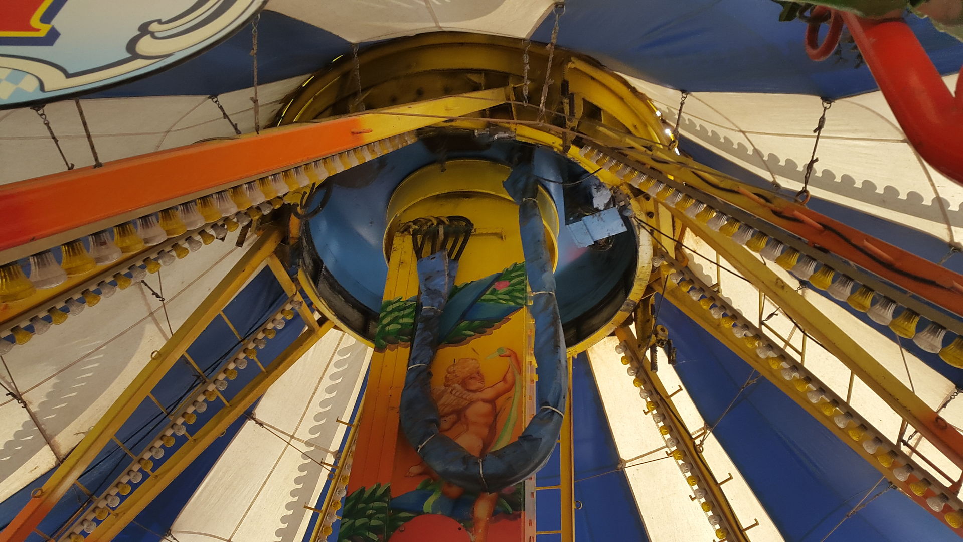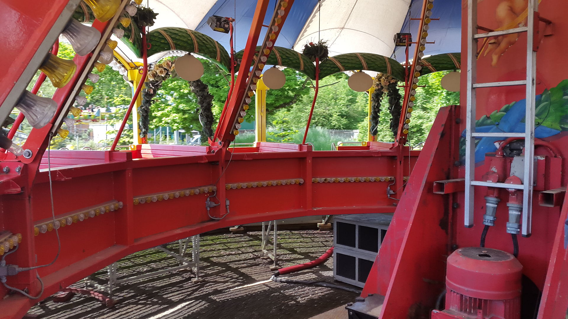Dort trifft man, vor dem Holzpanorama, auf eine Schiffschaukel. Das nebenliegende Automatiktheater wurde scheinbar vor kurzem geschlossen.