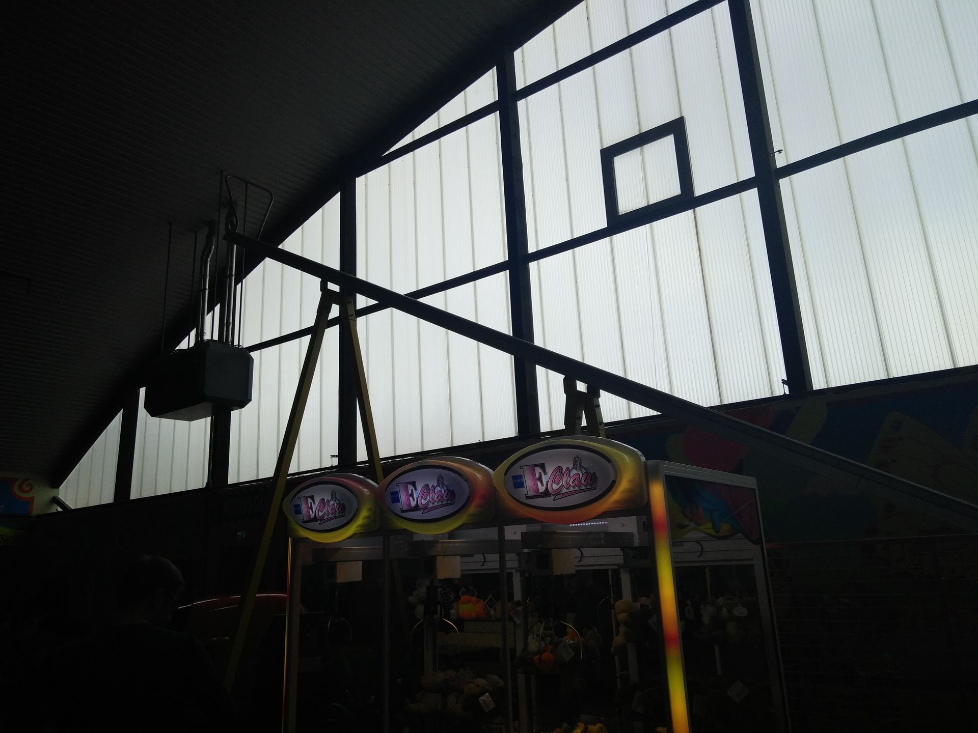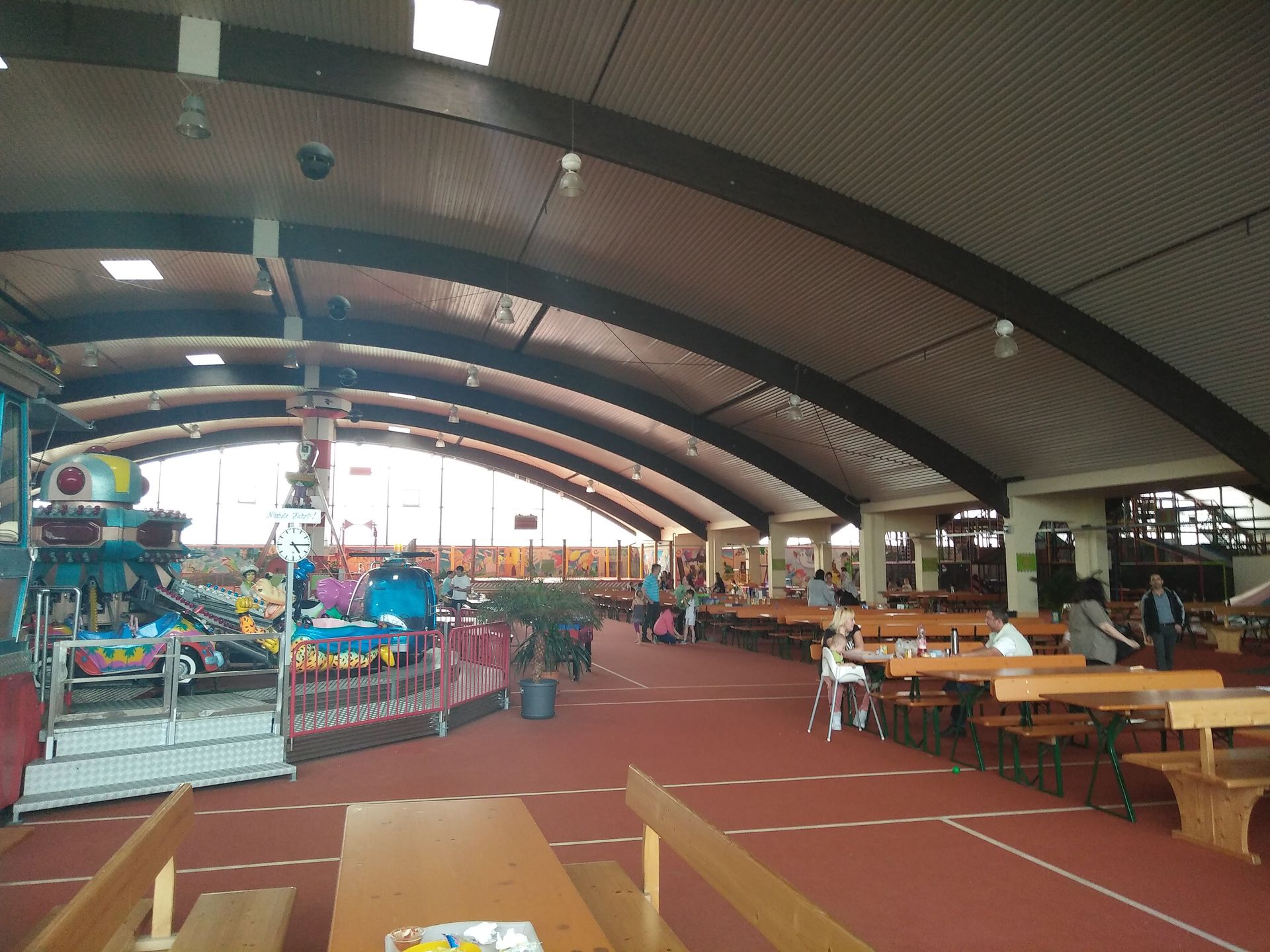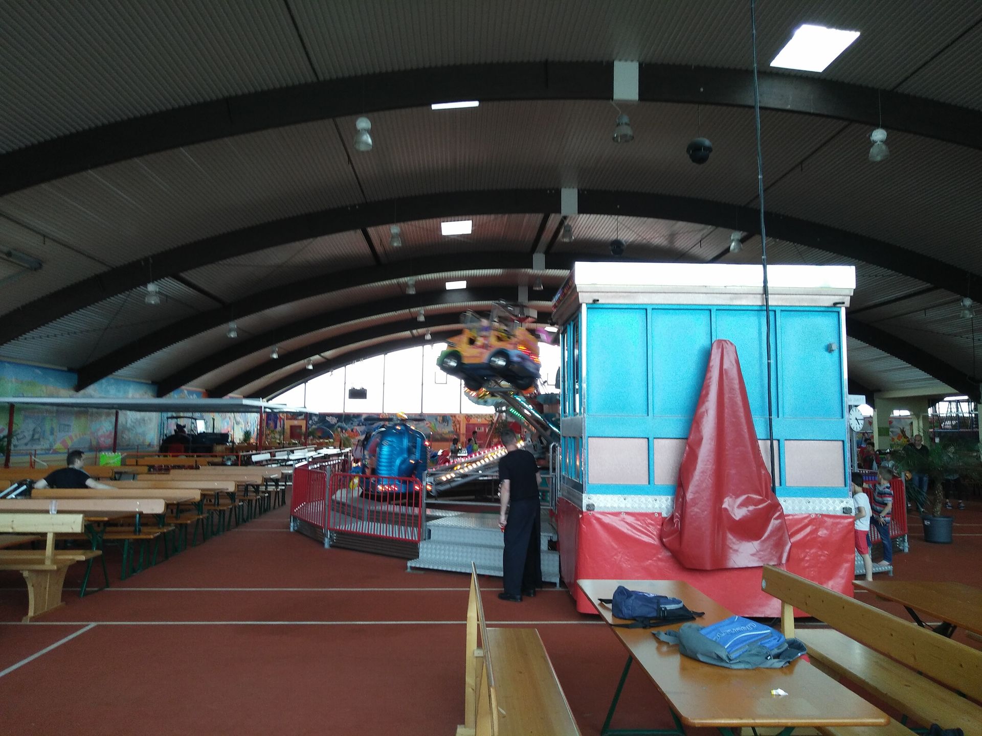 Die Halle wirkte auf mich irgendwie sehr leer und kahl. Dort, wo das Karussell steht, dürfte sonst wohl die Achterbahn stehen. Das diese aktuell in Freiburg steht hatte ich allerdings bereits im Vorfeld erfahren, da ich mich nach den Öffnungszeiten der Bahn erkundigen wollte. Im Sommer soll es aber wohl eine neue Achterbahn geben.