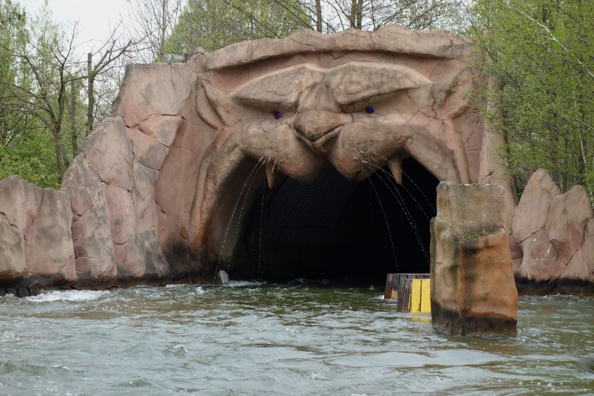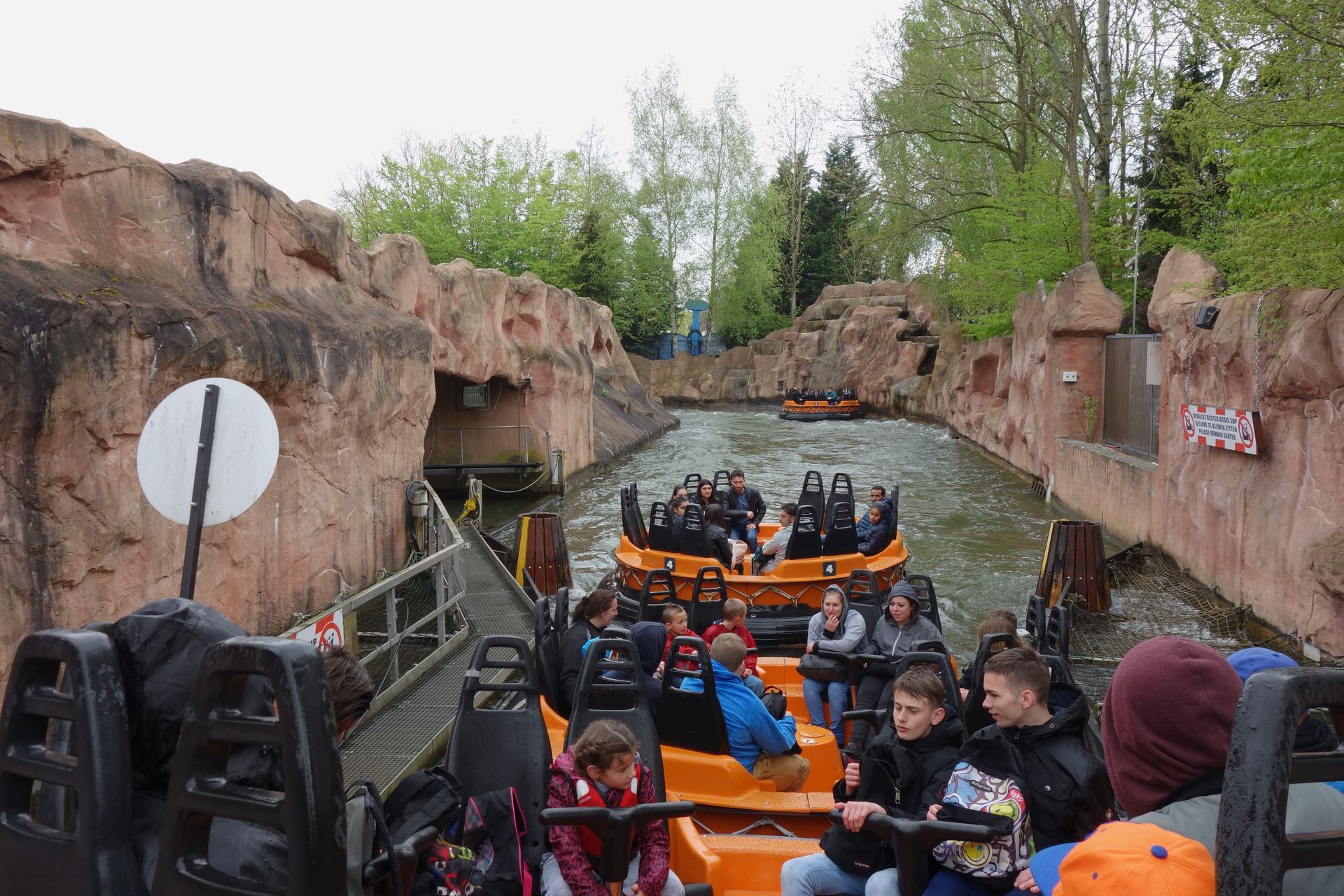 Nach kurzer Wartezeit konnten wir mit ein paar anderen Jugendlichen eines davon besteigen. 2014 hatte ich bei Nieselregen eines für mich alleine, aber auch so hat man mehr Beinfreiheit als auf jedem Floorless-Coaster. Mit mehreren Leuten im Boot kann man allerdings nicht mal eben so den Platz wechseln, wenn man auf eine Welle zufährt. Bei meiner Erstfahrt war es nämlich nur der Regen, der mich benässte, zumindest bis zum finalen Wassertunnel. Es stellte sich aber heraus, dass ich die Intensität einiger Wellen nicht mehr richtig in Erinnerung hatte. Der Radja River macht nämlich doch der ein oder anderen amerikanischen Anlage Konkurrenz. Einige Wellen sehen zwar harmlos aus, setzten aber ohne Vorwarnung mal eben das halbe Boot unter Wasser. Und der kleine Wasserfall prasselt nicht nur einfach an der Seite hinunter, nein. Wer auf der richtigen Seite des Bootes sitzt, fährt da mal eben mitten durch!