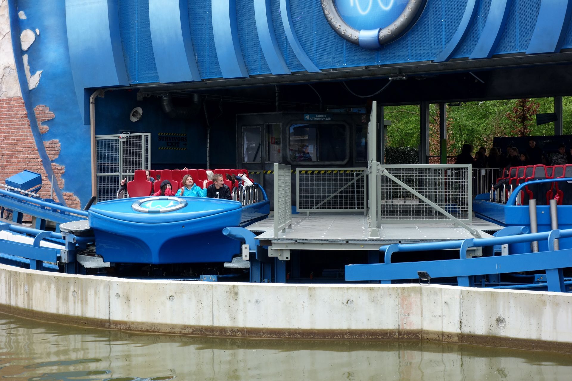 Weil ich bei der ersten Runde durch den Park die Kamera im Rucksack gelassen hatte (daher keine Garantie für die chronologische Korrektheit meines Berichts...), mussten wir nun noch einmal durch den laaangen Wartebereich von Pulsar hindurch, damit ich die weiter oben gezeigten Aufnahmen machen konnte. Diesmal setzte man uns in Reihe zwei, wobei ich schon einen der Außensitze nehmen musste. So bekam ich an der Seite doch ein wenig mehr ab, als bei der Fahrt zuvor, aber es war trotzdem noch ziemlich harmlos. So kürzten wir über die deutlich kürzere Single Rider Line gleich nochmal ab, in der Hoffnung, weiterhin Glück zu haben. Doch Nicolas musste direkt mal in die erste Reihe. Und ich im nächsten Boot ebenfalls. Mit dem Schlimmsten rechnend war ich im Nachhinein aber sehr froh darüber. Freie Sicht, Fahrtwind, und der Nässegrad ist auch absolut im Rahmen. Man bekommt durchaus seine Erfrischung, aber die einfache Regenjacke erfüllte weitestgehend ihre Pflicht. Ergo: Je weiter hinten, desto Splash.