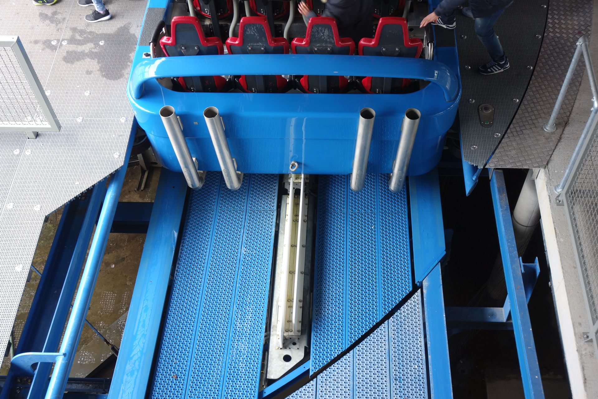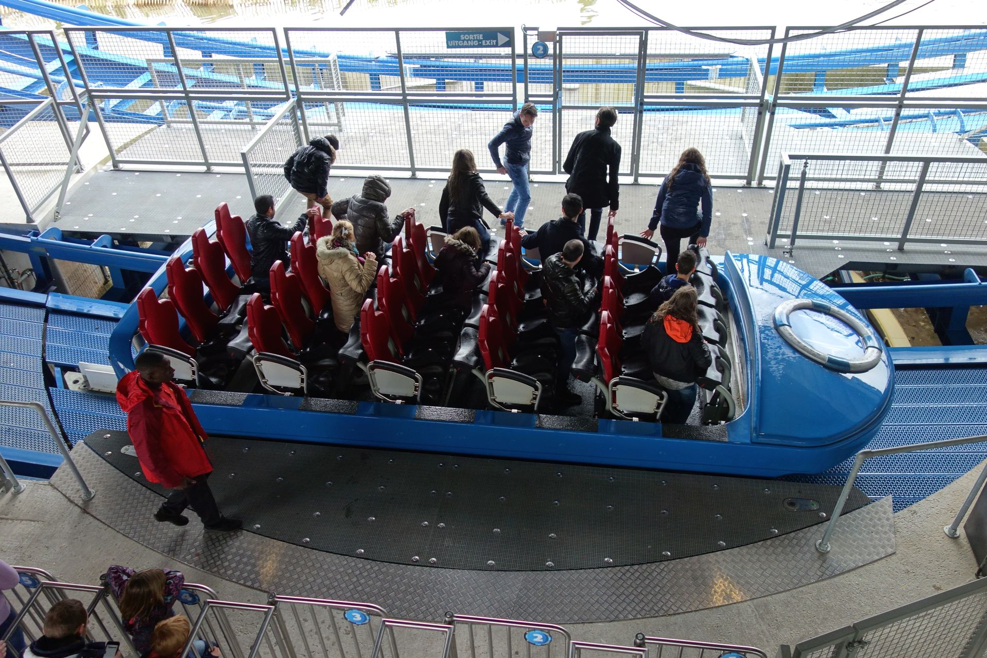 Kommt man dann endlich wieder die Treppe herunter, steht man auch quasi schon vor dem Drehkreuz. Wir kamen genau richtig, um der gerade laufenden Zuweisungsrunde beizuwohnen. Der Mitarbeiter am Drehkreuz teilt die Wartenden nämlich auf die fünf Reihen auf. Uns beide schickte er - wenn ich mich korrekt erinnere - in Reihe drei. Die Taschen werden in eine Ablage, wie man sie von Blue Fire kennt, verstaut, dann kann das Boot bestiegen werden. Dank fehlender Mitfahrer in unserer Reihe wählten wir die beiden mittleren Plätze. Sitze und Bügel ähneln ebenfalls jenen von Blue Fire, sind also gewohnt bequem. Allerdings schließen die Bügel hier automatisch, sobald alle Passagiere eingestiegen sind.