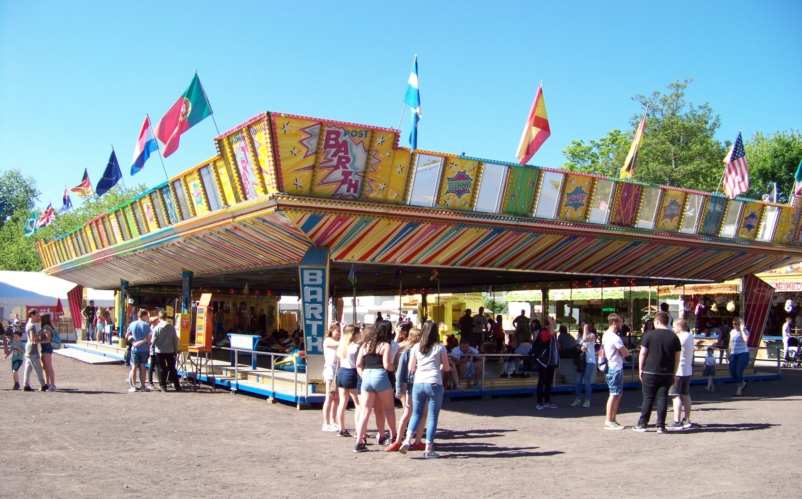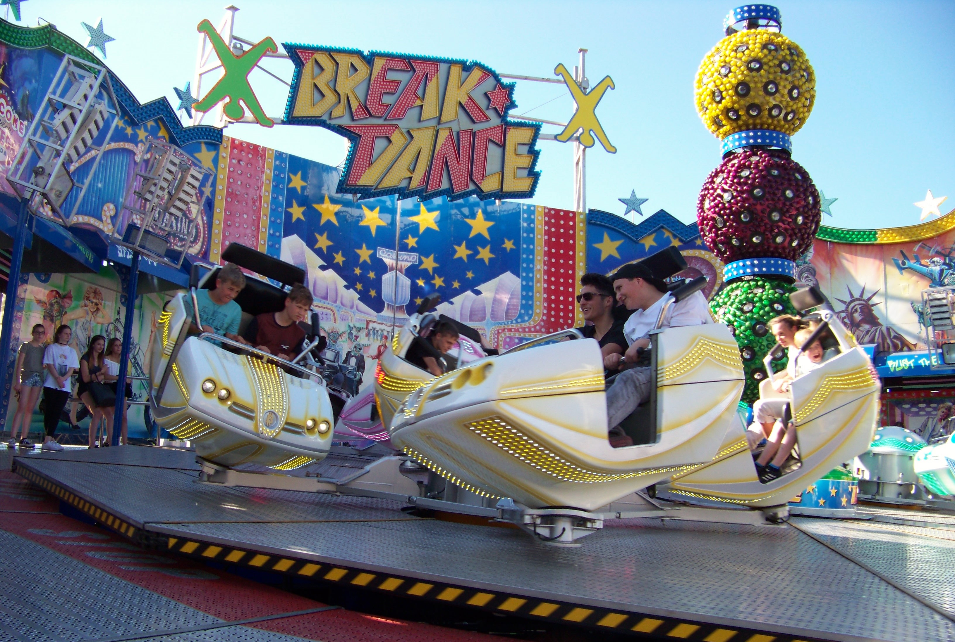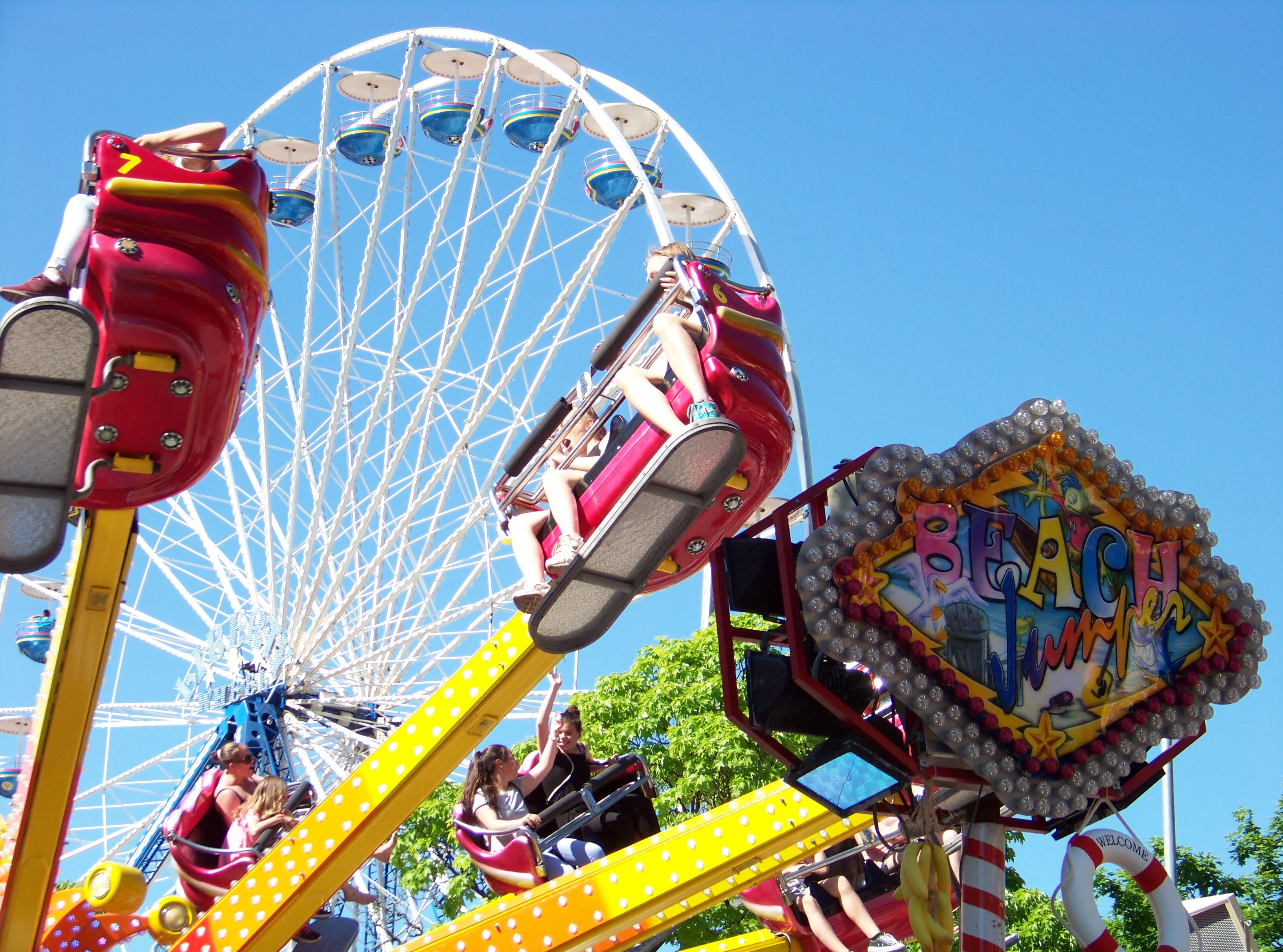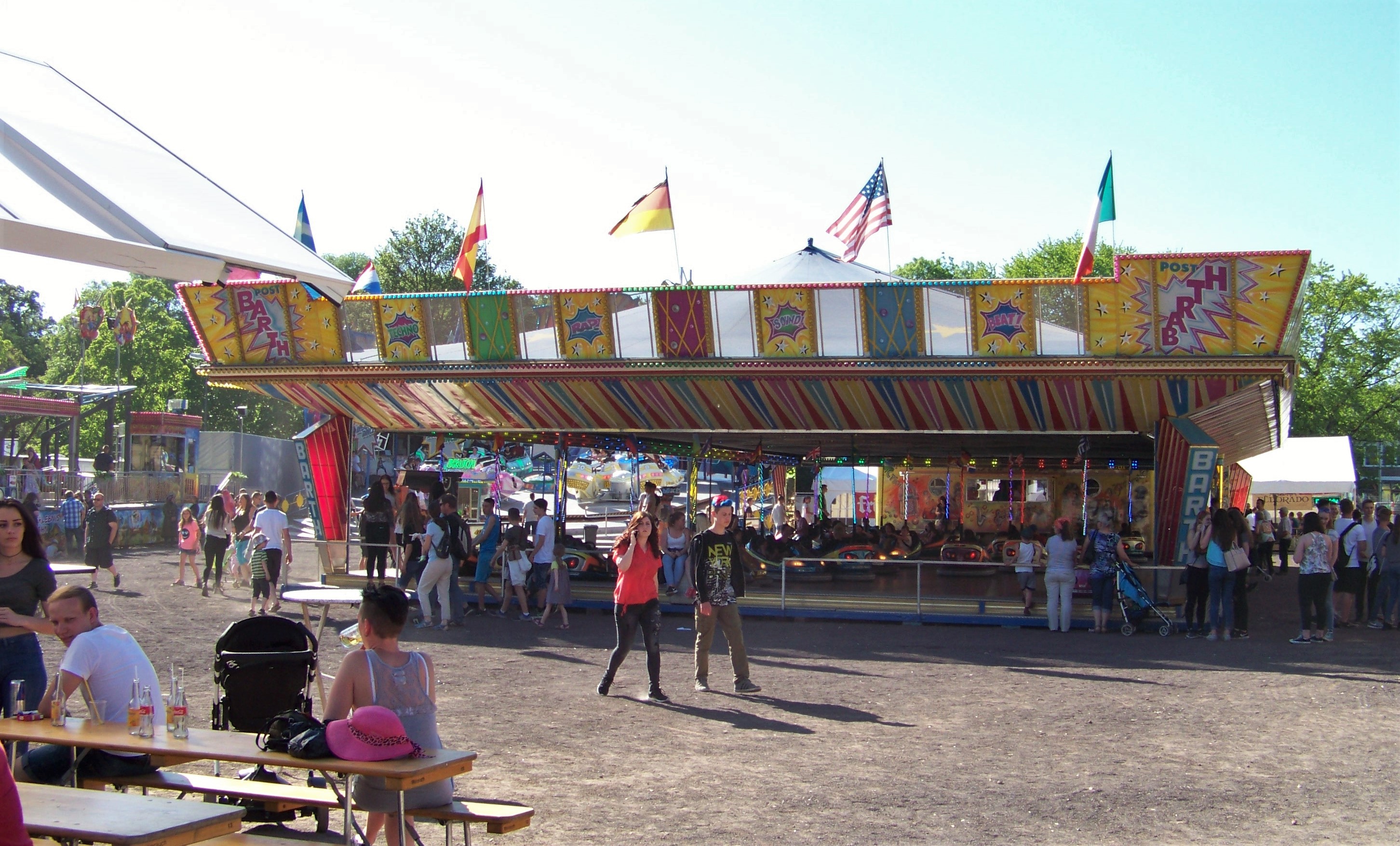 Auf der Ecke am Schwimmbad, wo der Weg in Richtung des alten Festgeländes abbiegt, stand das erste von insgesamt drei Rundfahrgeschäften, die dieses Jahr auf dem Maimarkt gastierten: der Beach Jumper von Wegener, der bei heißen Temperaturen am Samstagnachmittag bei allen Fahrten voll fuhr und eine tolle Show bot (dank Becherspiel).