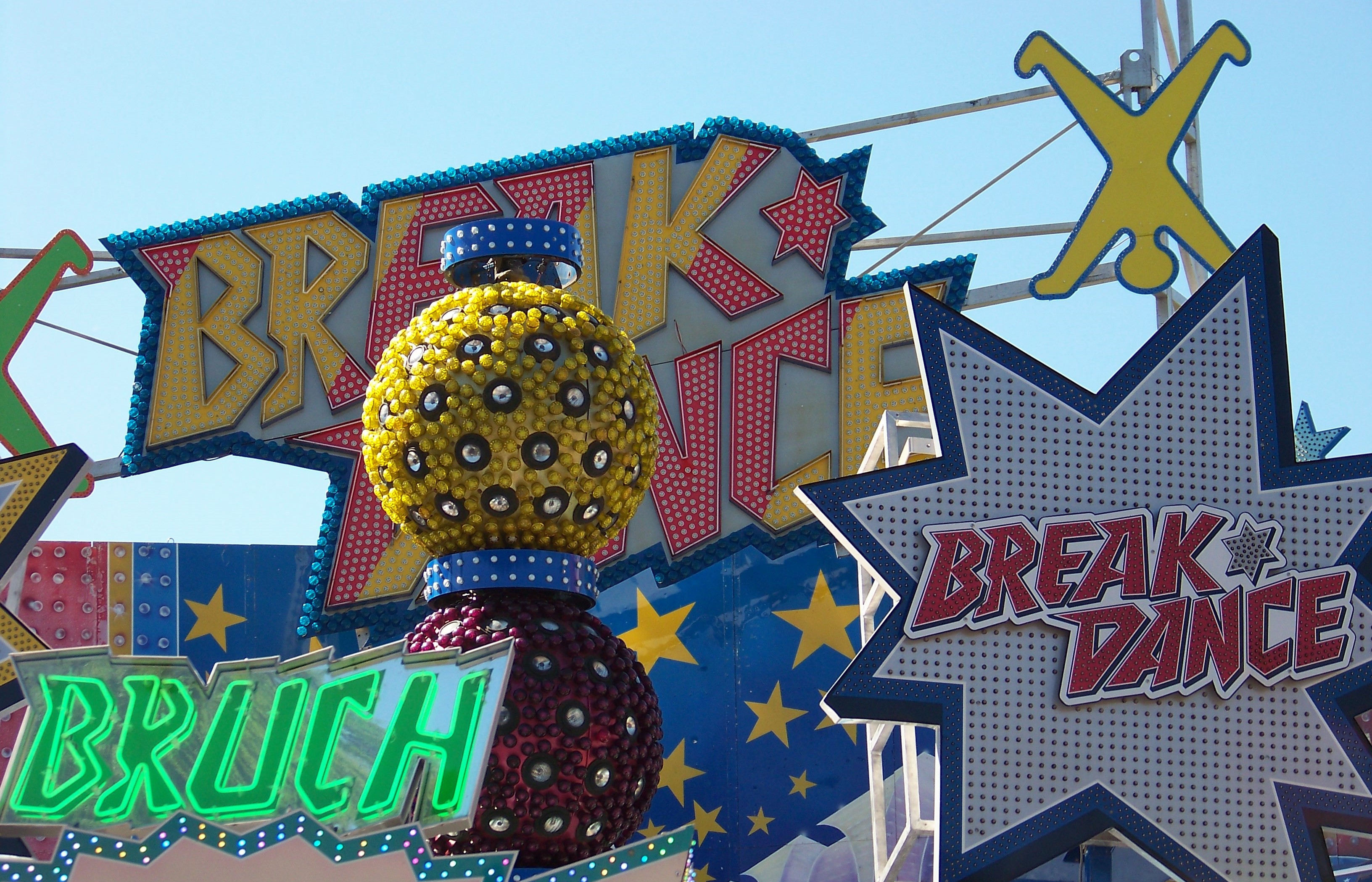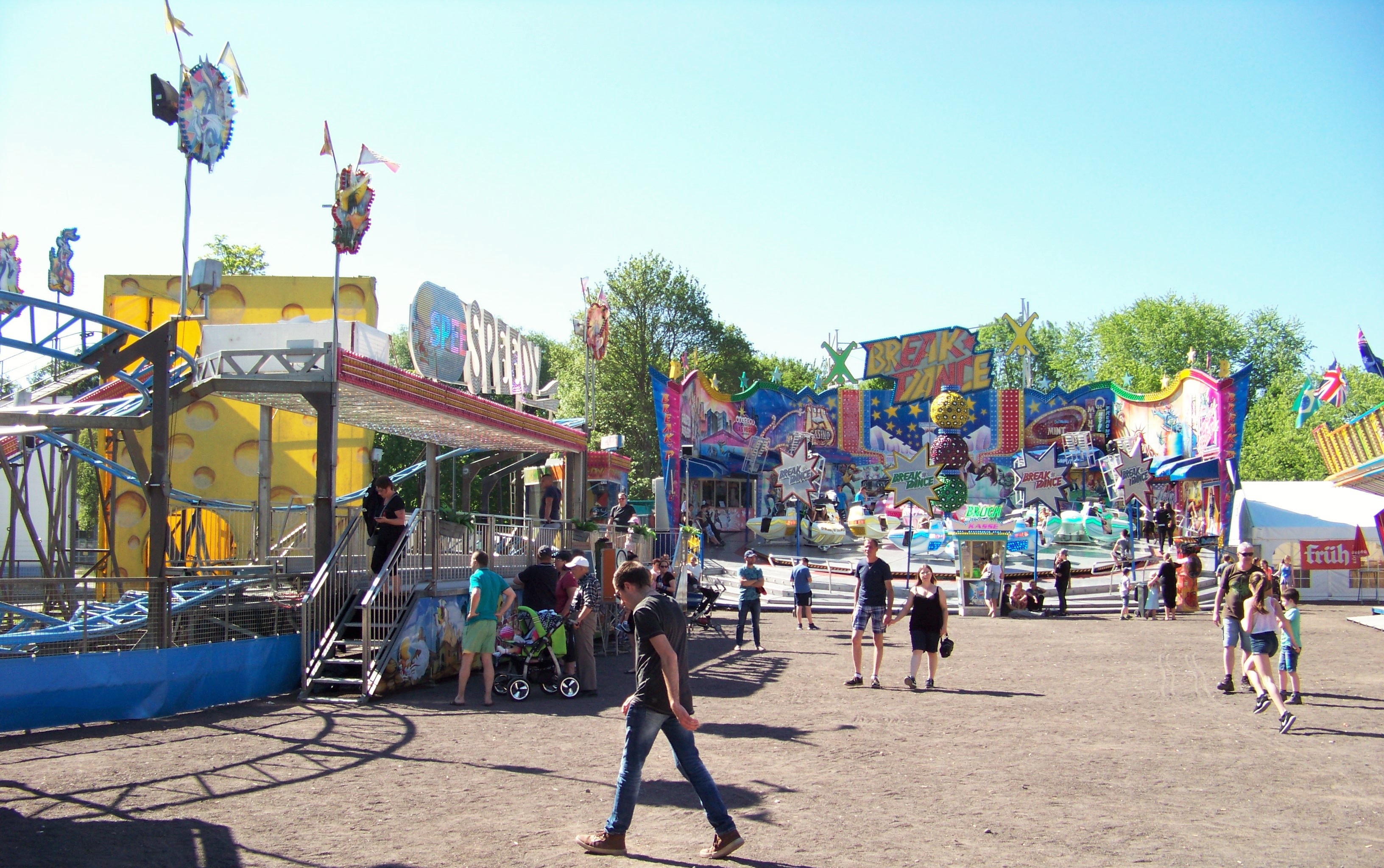 Auf dem in diesem Jahr wahrscheinlich zum letzten Mal für den Maimarkt zur Verfügung stehenden Schotterplatz standen der Autoscooter von Herzberger, die Achterbahn Speedy von Welte und Bruchs Break Dance.