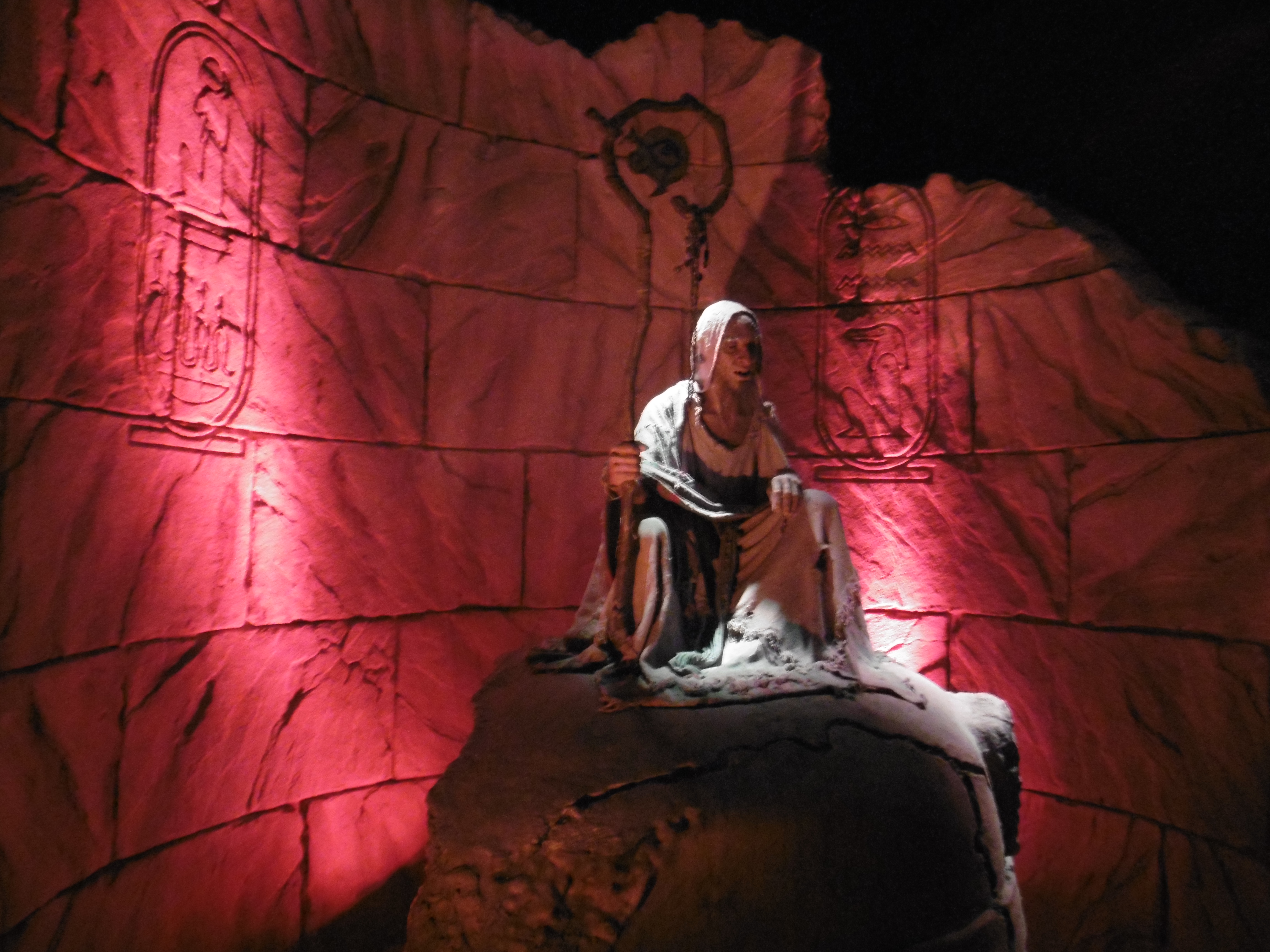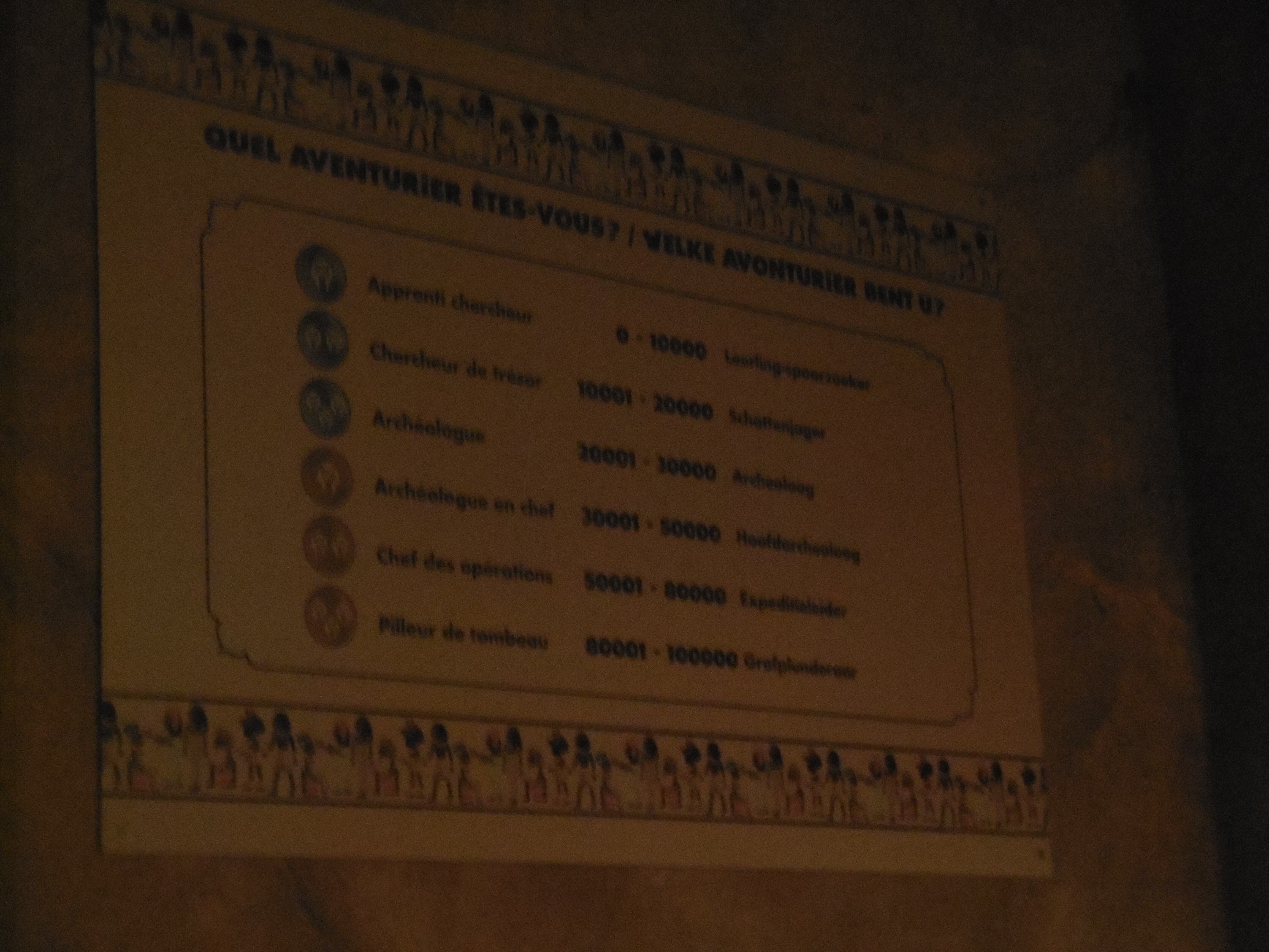 Denn das Fahrsystem von ETF erlaubt durch die Magnetschleifen eine nicht spurgeführte Fahrstrecke, wodurch das Erkundungsfahrzeug direkt in die Station abbiegen kann. Leider gab es bei unserer ersten Fahrt einen Defekt, weswegen wir auf einen Wagen in der Kampfarena gegen Seth aufliefen. Ein Mitarbeiter drückte dann den Wagen zurück und wir bogen in die Station ab. In der Schatzkammer wartete derweil ein Wagen auf seine Weiterfahrt. Bei einer späteren Wiederholungsfahrt schafften wir es erneut zu Seth, den wir auch erfolgreich erledigten. Nur blieb mir die Schatzkammer verwehrt, da wohl dieser Fahrweg zur Vermeidung einer erneuten Fehlermeldung ausgeschaltet wurde. Trotz alledem ist dieser von Sally Corp. gestaltete interaktive Darkride mit seinen 215 Metern Länge auch nach 14 Jahren Betrieb ein Kracher. Für den absoluten Flash fehlt aber leider eine mitgestaltete Decke.