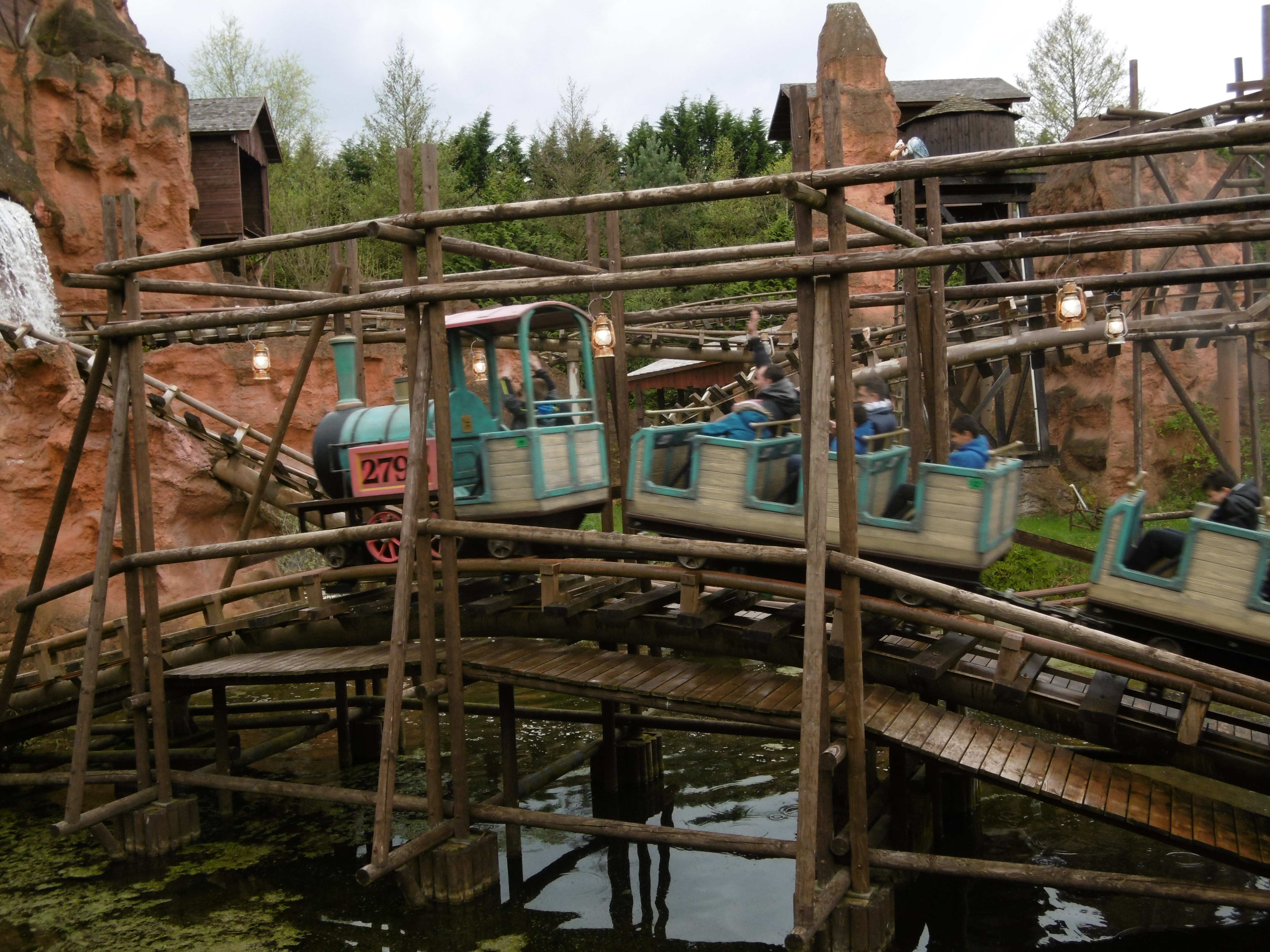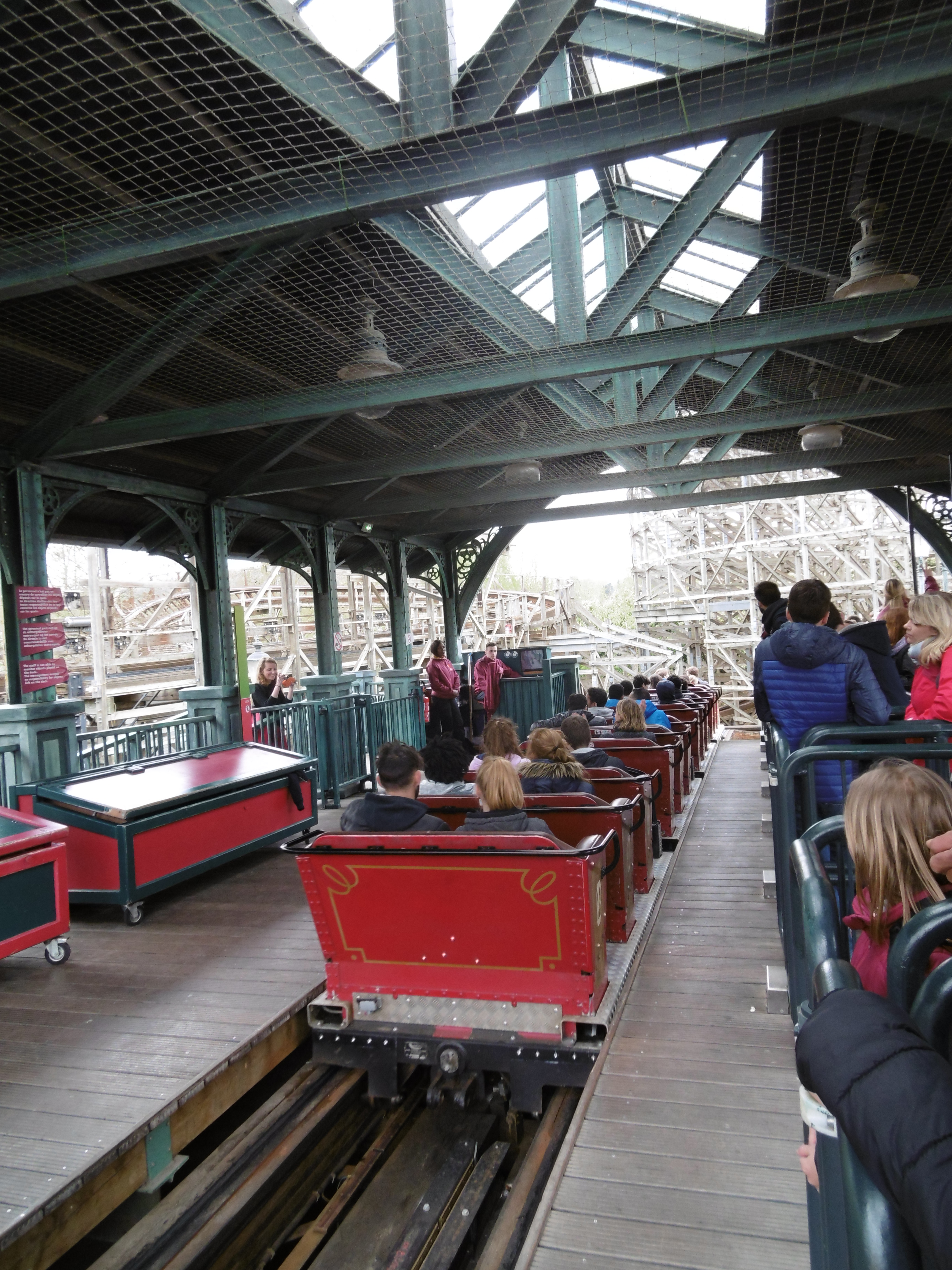 Da irgendwo in der Mitte des Zuges eine Reihe frei war konnten wir auch ohne weitere Wartezeit im Zug Platz nehmen. Schade, dass im Phantasialand nicht die gleichen Holzbänke verwendet wurden wie bei diesem Prototyp. Durch die ergonomischere Form steigen die Minenarbeiter nicht mit einem unwohlen Gefühl im Rückenbereich ein. Die Bahn selbst ist, wie auf dem ersten Bild zu sehen, wunderschön gestaltet (mal abgesehen vom Teil nach dem zweiten Lifthill).