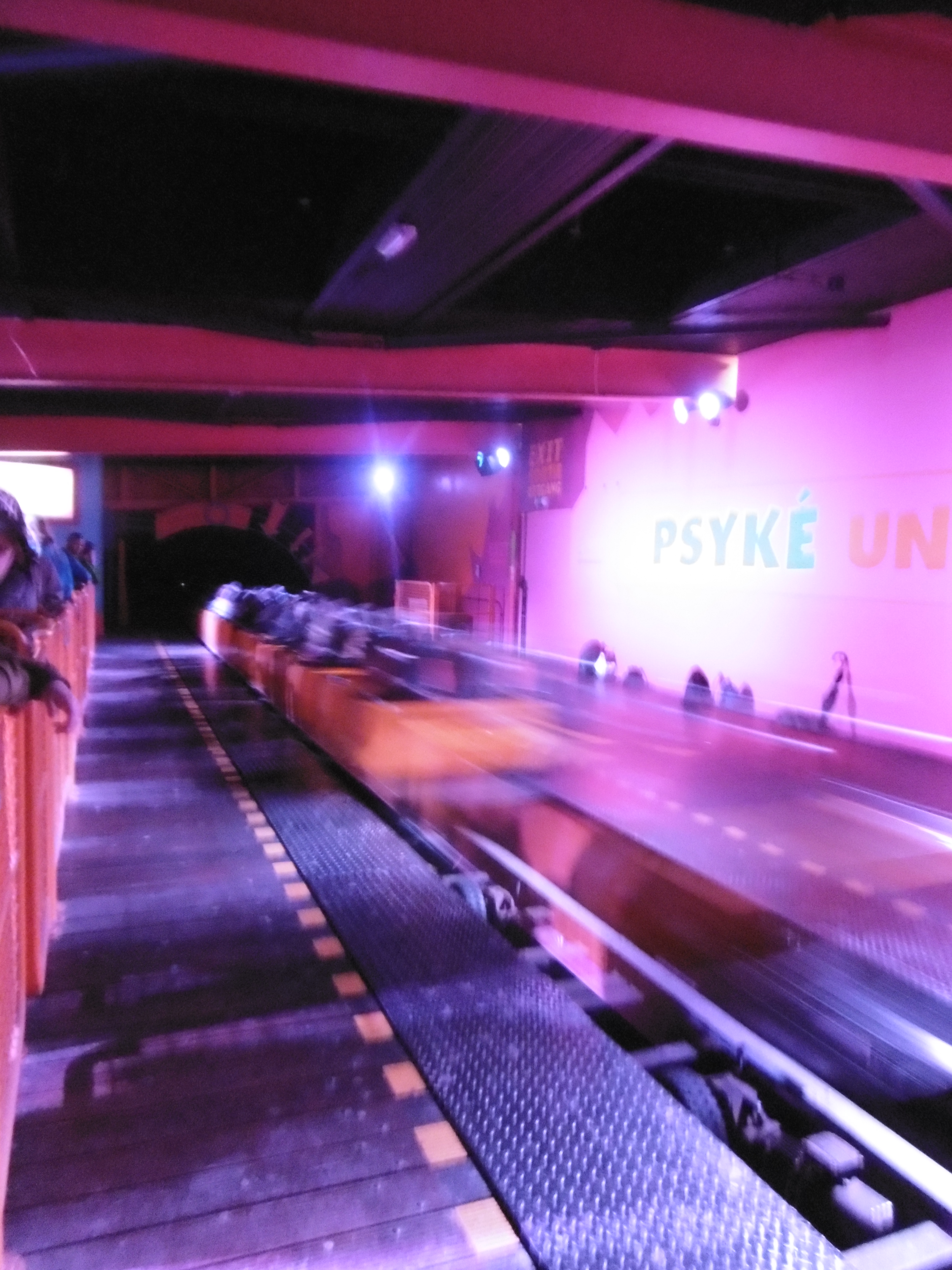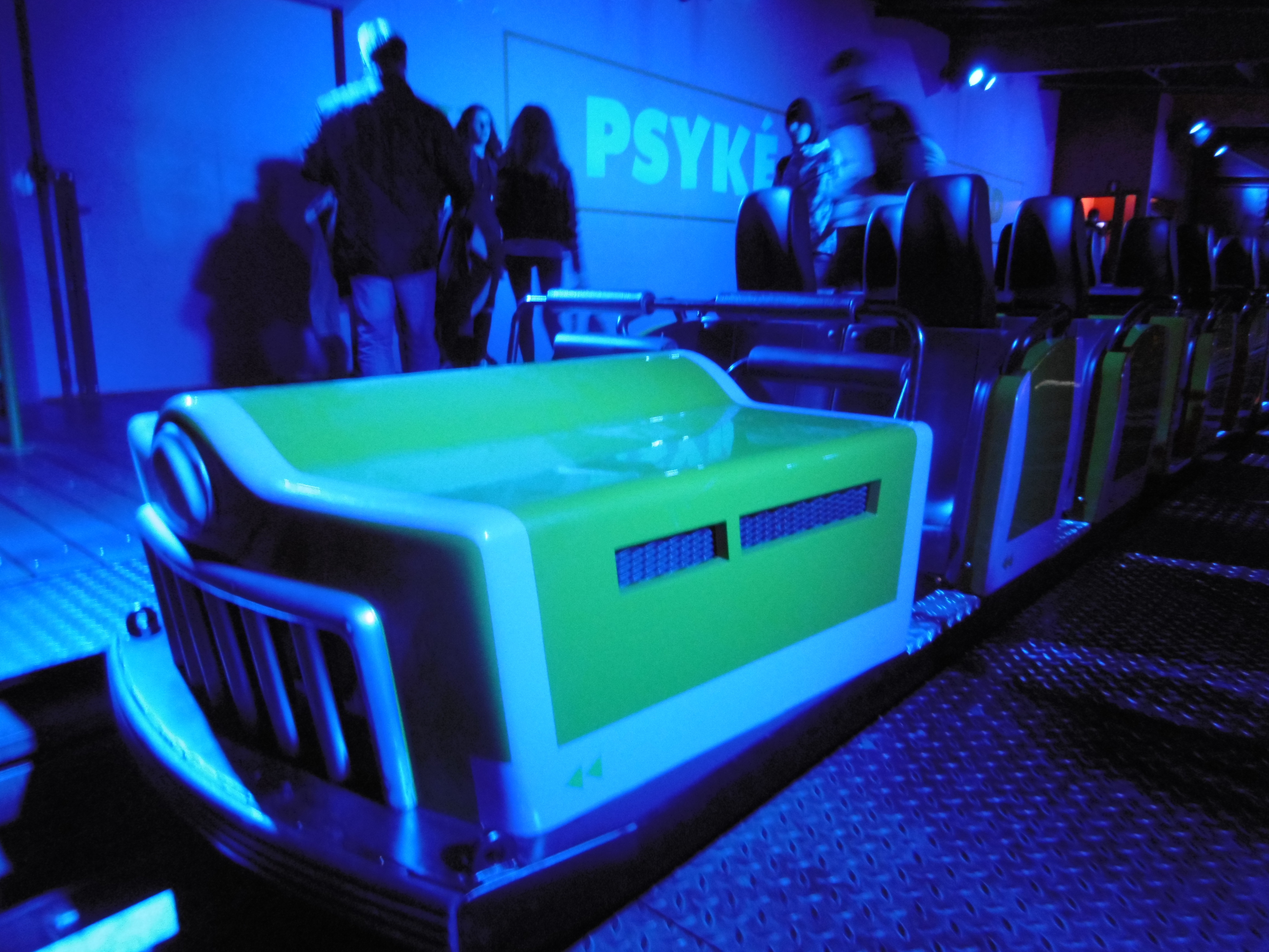 Die eigentliche Warteschlange bietet dann außer einer überdachten Wellblechwand wenig. Dafür aber einige Technolieder mit starken Beats, die auf den eigentlichen Soundtrack, der kurz vor der Station zu hören ist, einstimmt. Auf einem Fernseher bereitet eine Comicfigur die Gäste auf die Fahrt vor, worauf der Soundtrack einsetzte, der mir bis heute nicht mehr aus dem Kopf geht. Wir hatten Glück und konnten nach etwas Wartezeit (am Morgen hat es noch öfters geregnet und da Psyké nun gänzlich Indoor ist, wollen das mehr Leute fahren) die erste Fahrt des Tages in der 1. Reihe antreten.