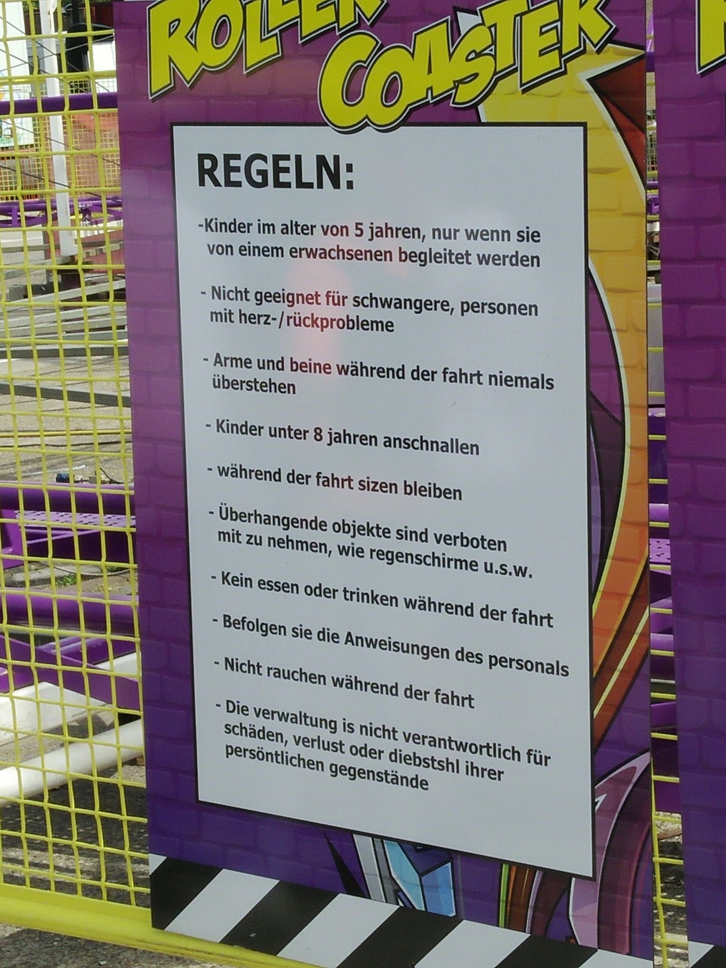 Hmm, da stimmt doch was nicht... Für 4 Euro und eine Ghettofaust-Begrüßung mit dem Kassierer seitens Daniel (WTF?) durften wir nach einiger Wartezeit in die kleinen Züge einsteigen. Zwischenzeitlich landete eine Abdeckung der Beleuchtung direkt neben uns. Vertrauenserweckend. Aber immernoch besser als die Schraube, die mal an einem anderen Coaster neben uns gelandet ist...