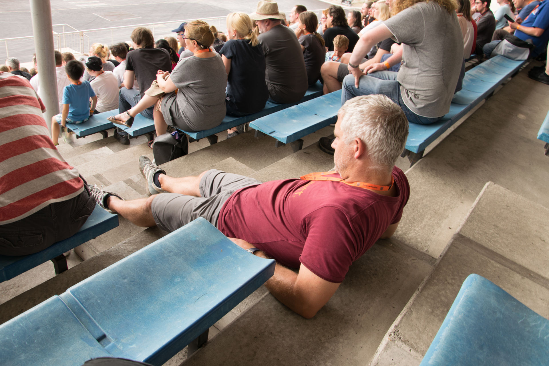 Die anschließende Gesprächsrunde mit dem Showleiter und der Chefpyrotechnikerin nutzt der ein oder andere, um ein wenig auf der Treppe zu entspannen.