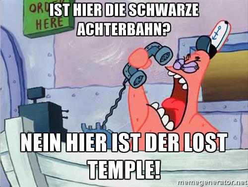 Wobei wir folgende Überlegung hatten: Der Eingang ist ja von hier aus gesehen quer durch den Park bis hinter die Bahn, was sicher nicht jedem Besucher zunächst klar sein wird. Was also passiert nun, wenn an besonders Besuchsstarken Tagen wie dem VRR Tag, wo schon vor Parköffnung die Besuchermassen vor den Toren des Parks warten, diese geöffnet werden? Eine lustige Vorstellung, dass dann ein Großteil der Massen mit einem lauten "Achterbaaaahn!" erstmal die Wartezeit des Lost Tempel in Unendliche Weiten treibt, um ein bis zwei Stunden später verwirrt und genervt denselben Fehler beim Bermuda Dreieck zu wiederholen.