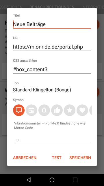 Anschließend können Benachrichtigungen erstellt werden. Dies geschieht mittels Web-Monotors, sprich die App ruft die Seite im Interval auf und prüft, ob sich in vorgegebenen Bereichen seit der letzten Prüfung etwas getan hat. Bei mir arbeiten die Benachrichtigungen trotz 5 Minuten Frequenz nicht 100% sauber, vermutlich wird die Änderung erst bei der zweiten Prüfung erkannt, da die Boxen ja immer erst auftauchen, wenn Neuerungen kommen.