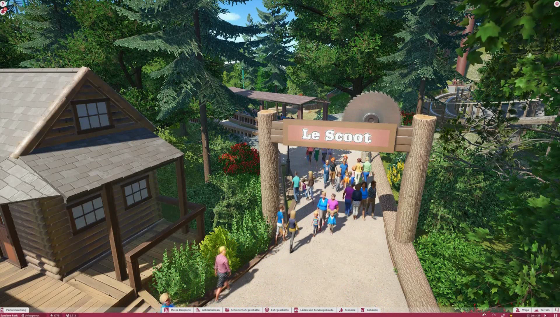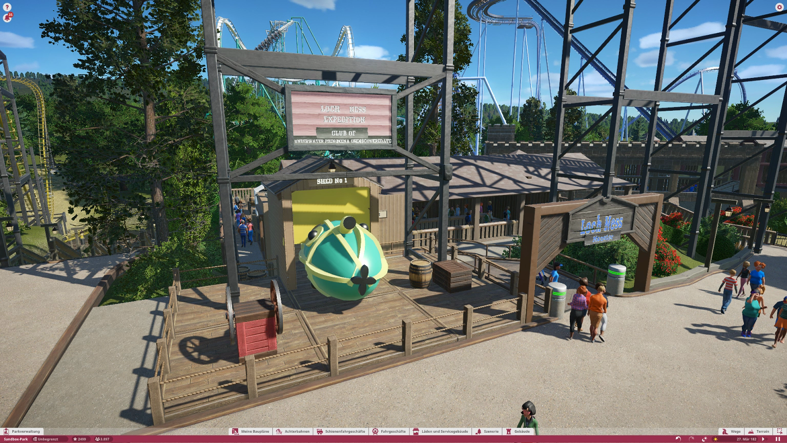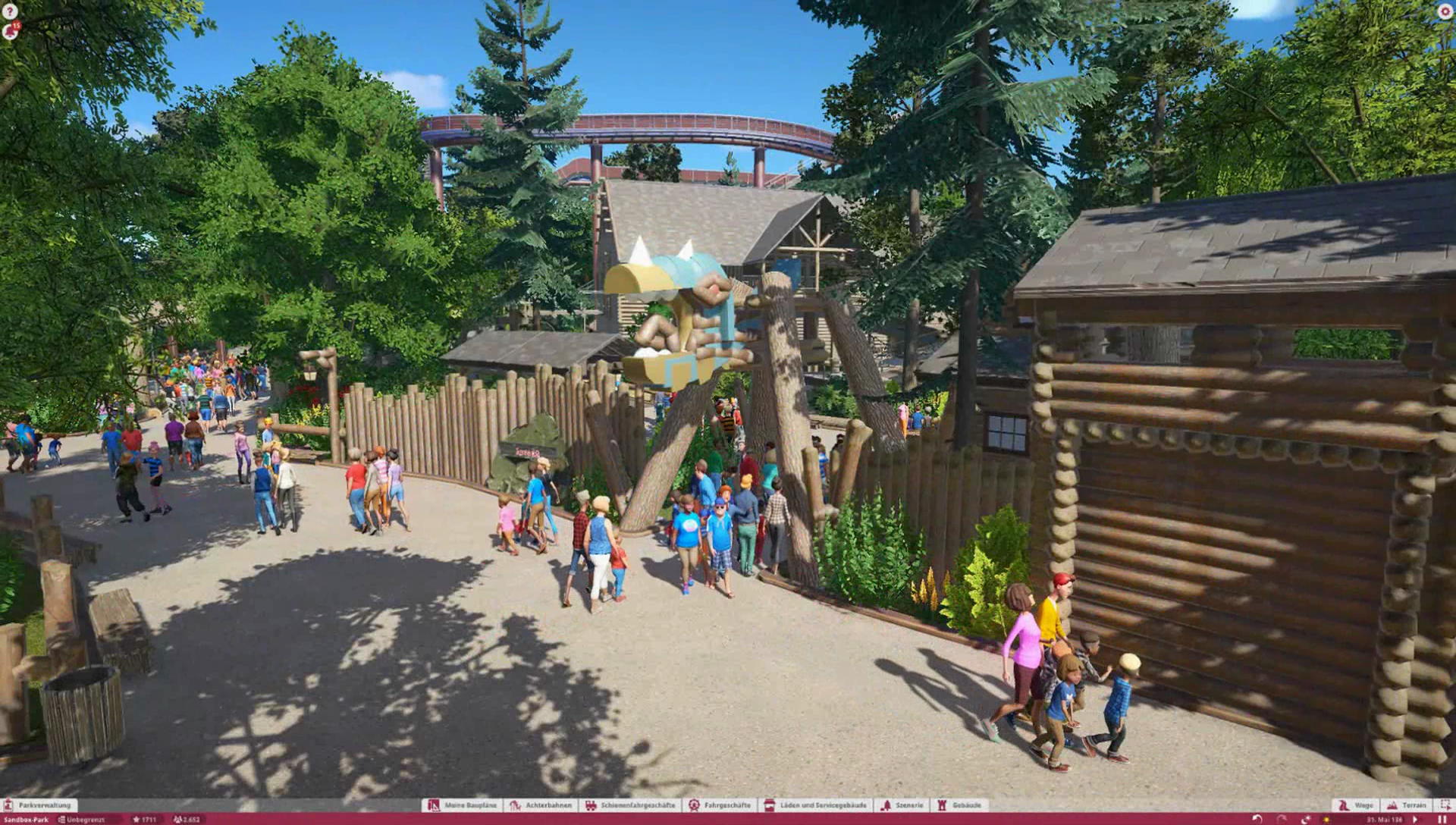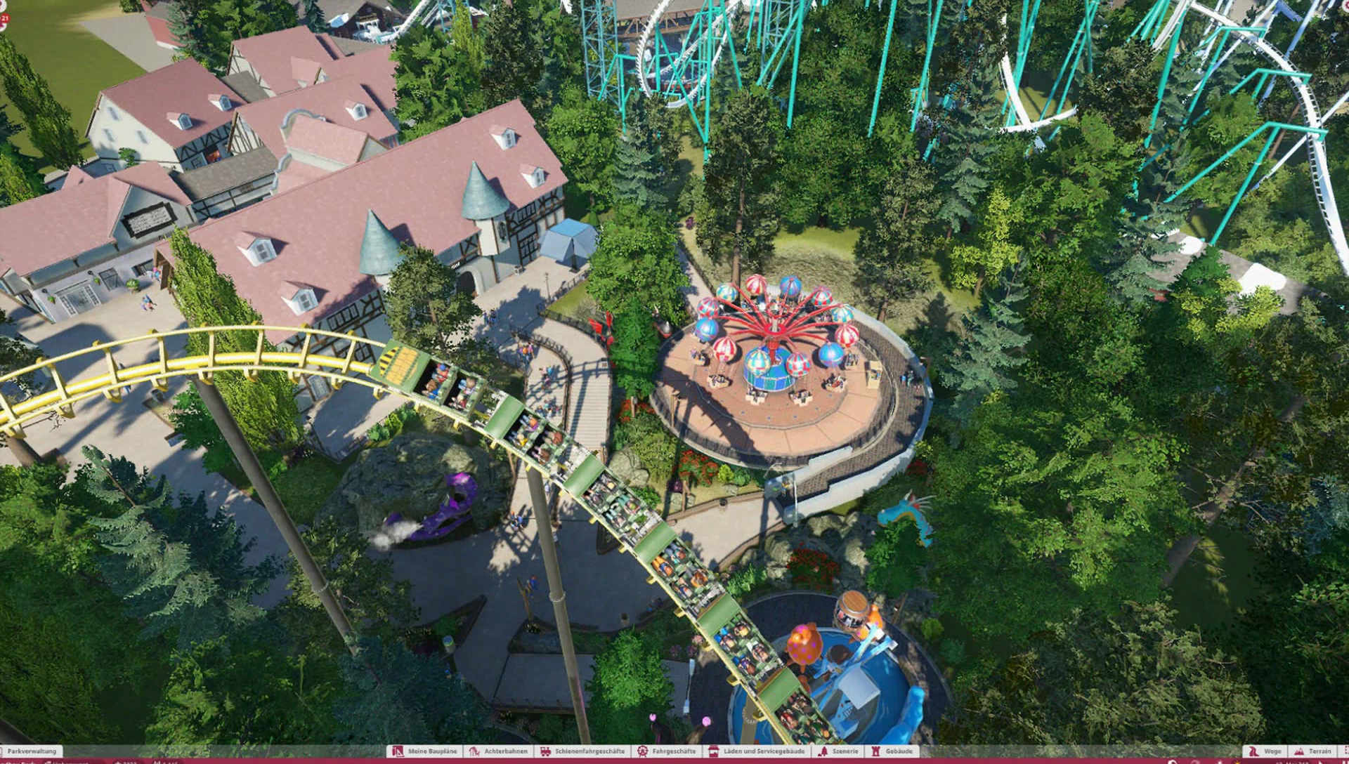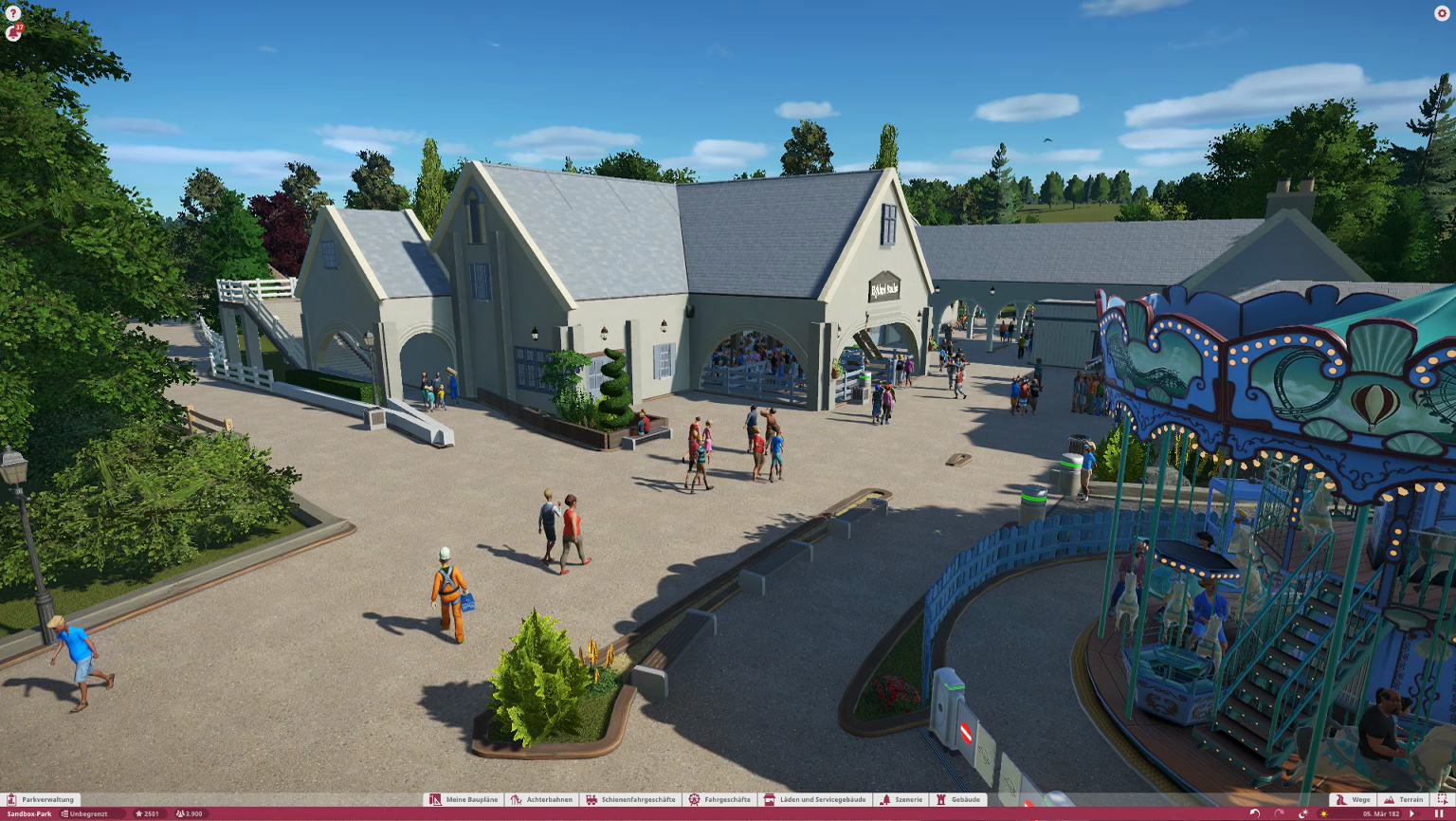 Im Themenbereich gibt es im Original ein Ponygehege, Problem ist nur, es gibt keine Tiere in Planet Coaster, also habe ich mich dazu entschieden einen kleinen Family Ride auf dieses Gelände zu platzieren. Wäre ja sonst verschwendeter Platz