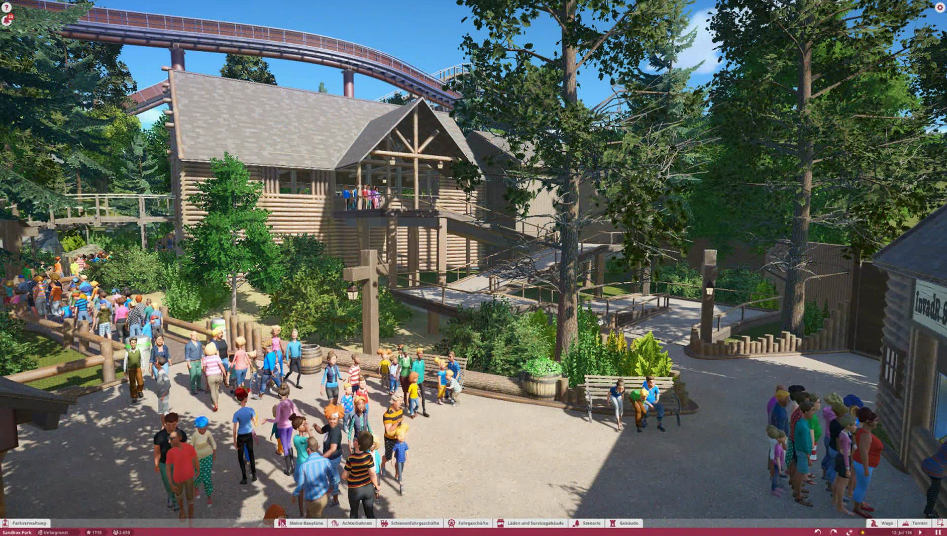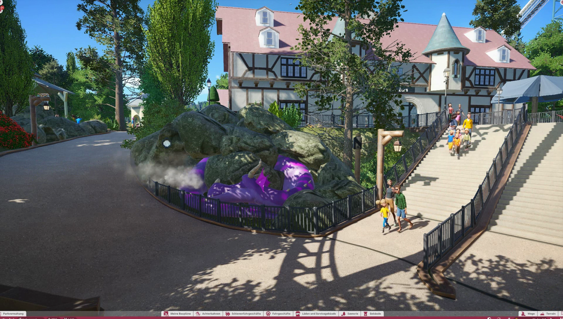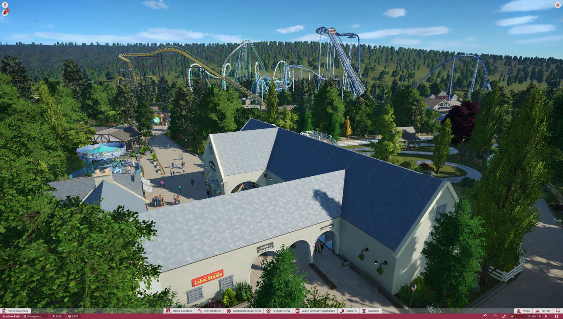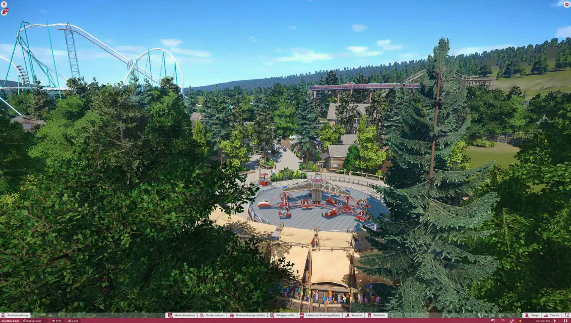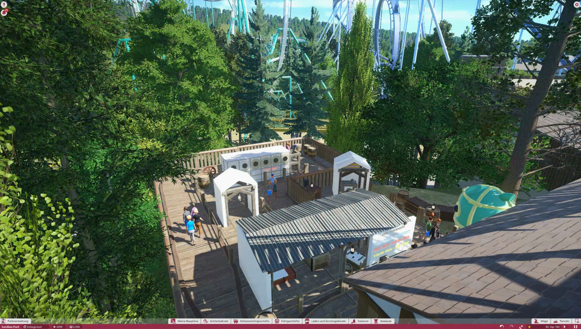 Im Themenbereich gibt es im Original ein Ponygehege, Problem ist nur, es gibt keine Tiere in Planet Coaster, also habe ich mich dazu entschieden einen kleinen Family Ride auf dieses Gelände zu platzieren. Wäre ja sonst verschwendeter Platz