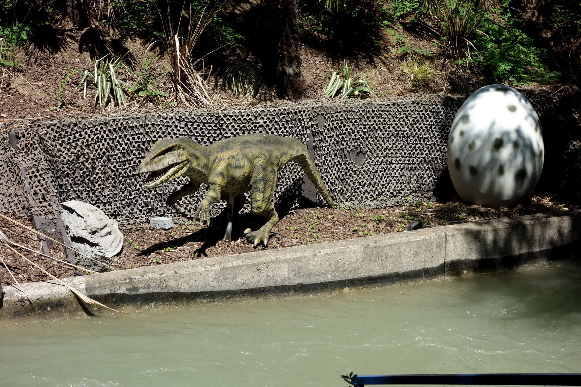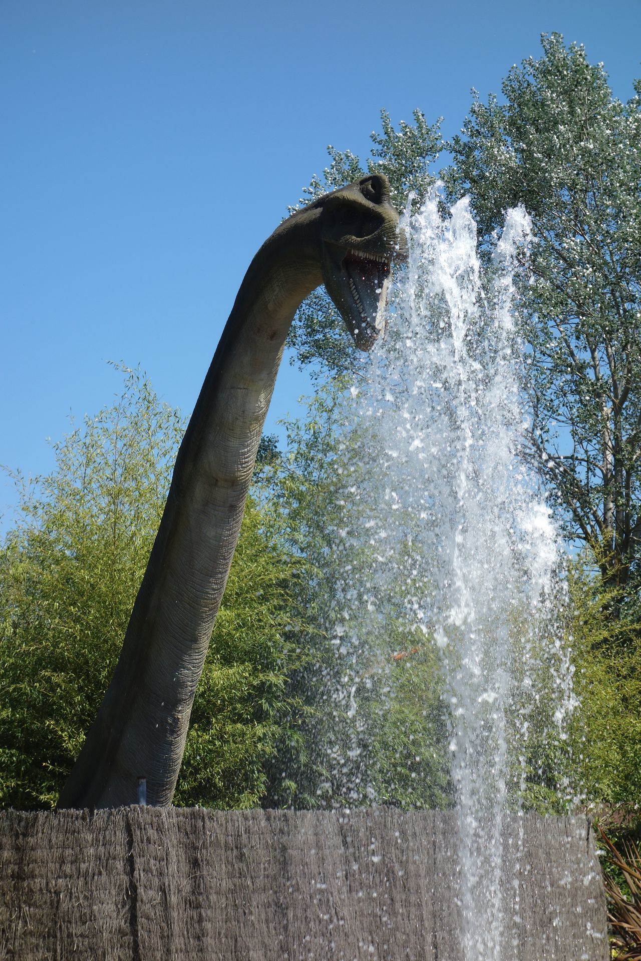 Die Fontänen sind geblieben und aus der richtigen Perspektive kann der Dino daran trinken.