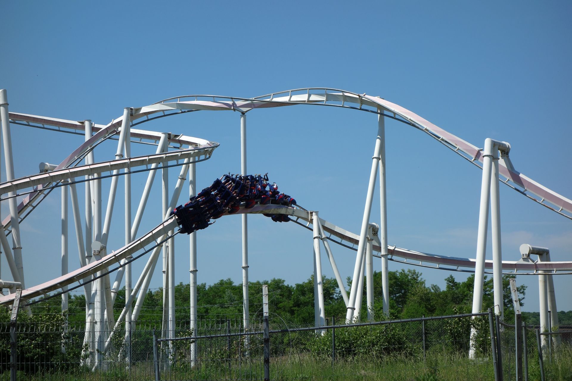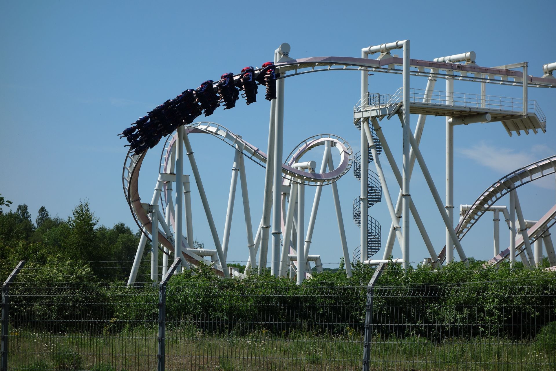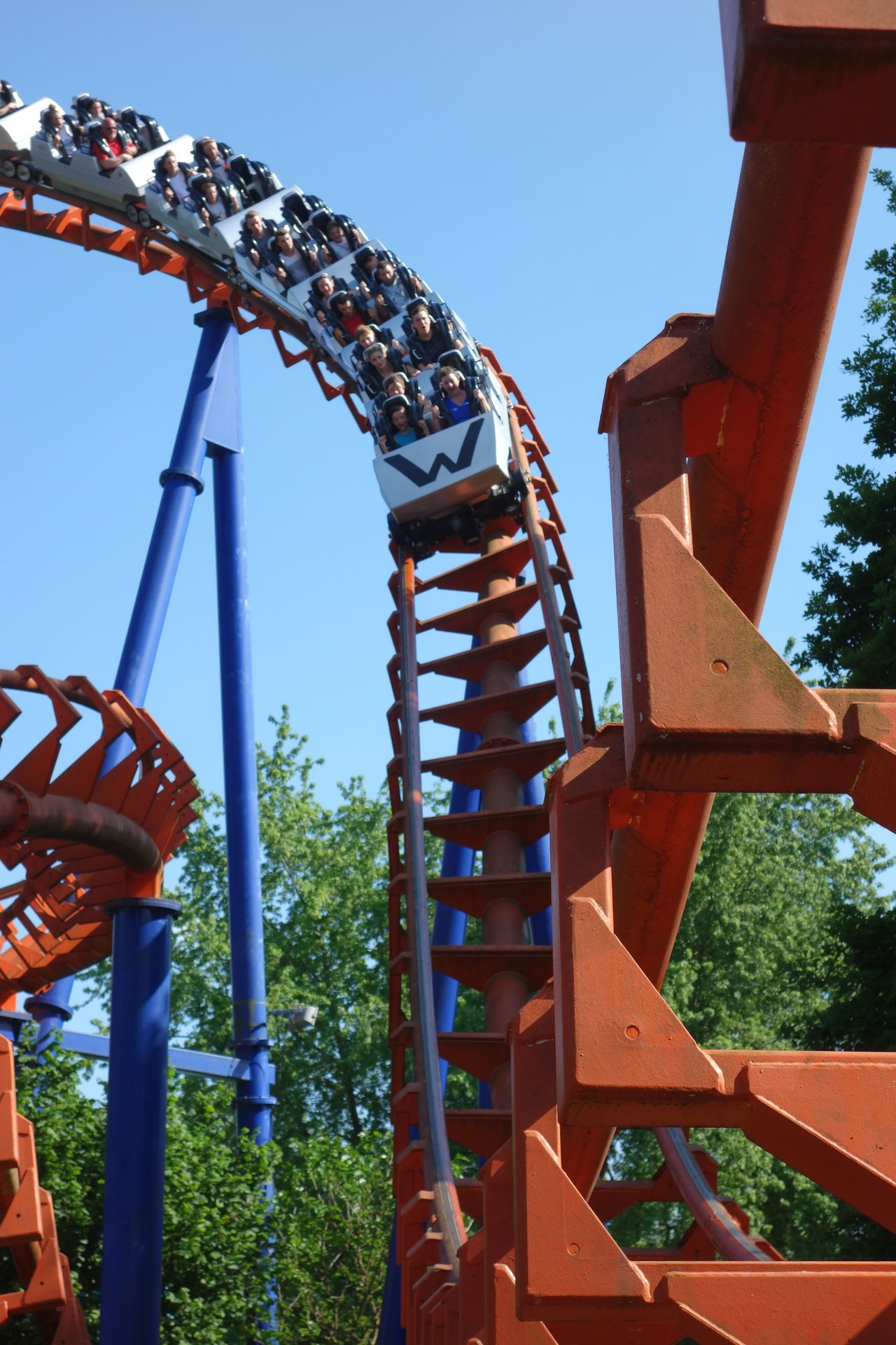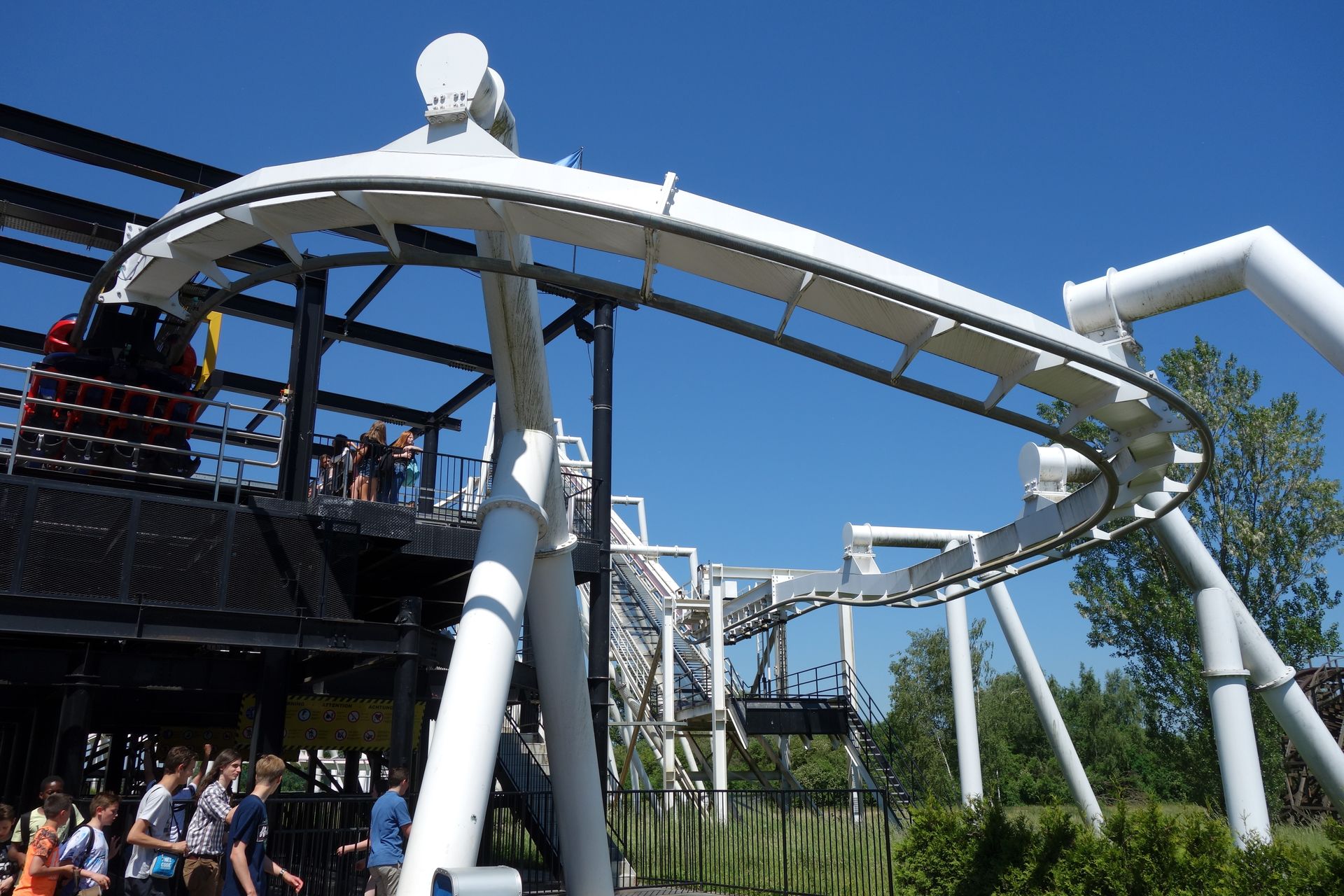 Sind die 40 Höhenmeter erklommen, stürzt sich der Zug in die Tiefe, hinein in den Looping und anschließend durch eine Zero-G Roll.
