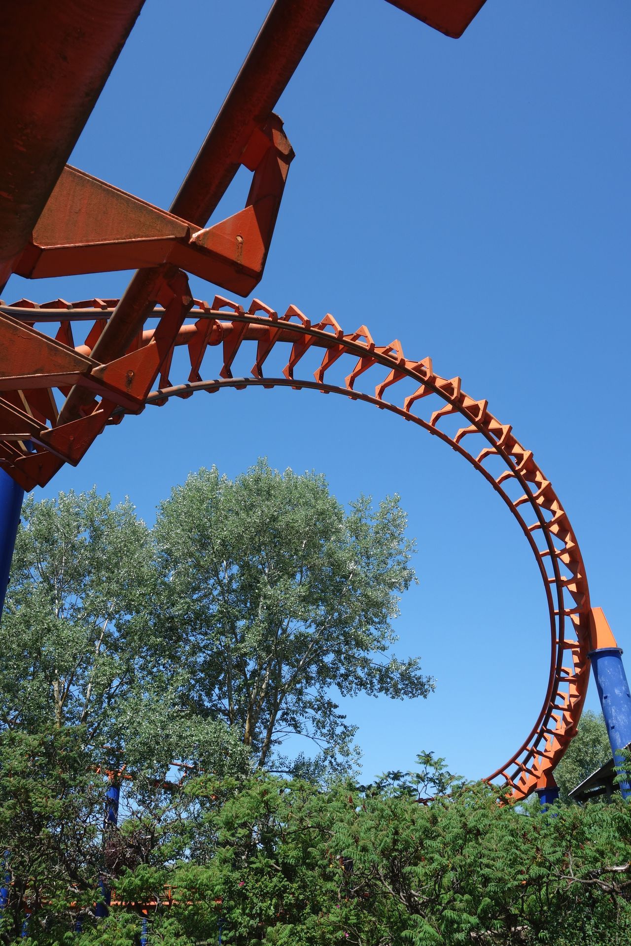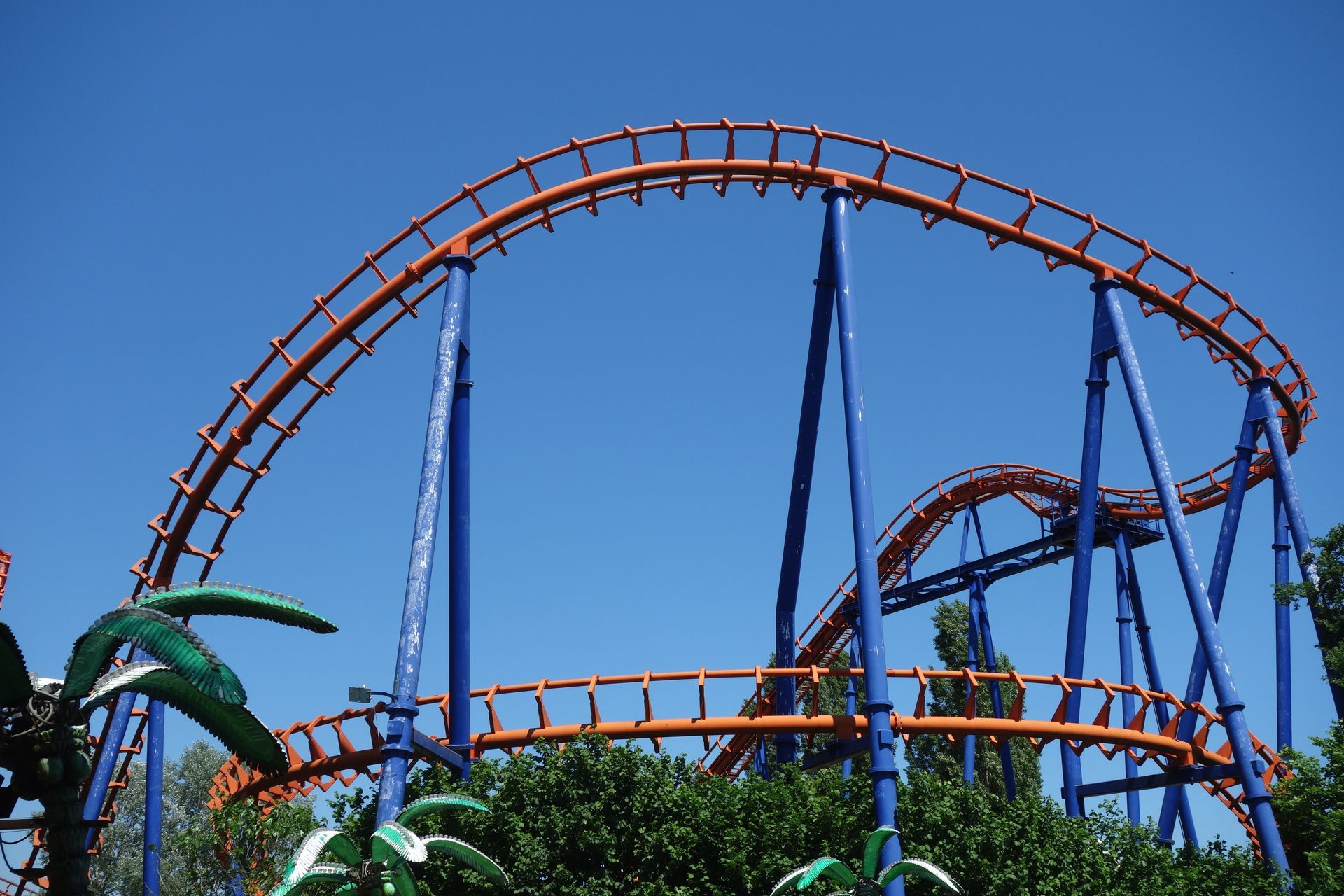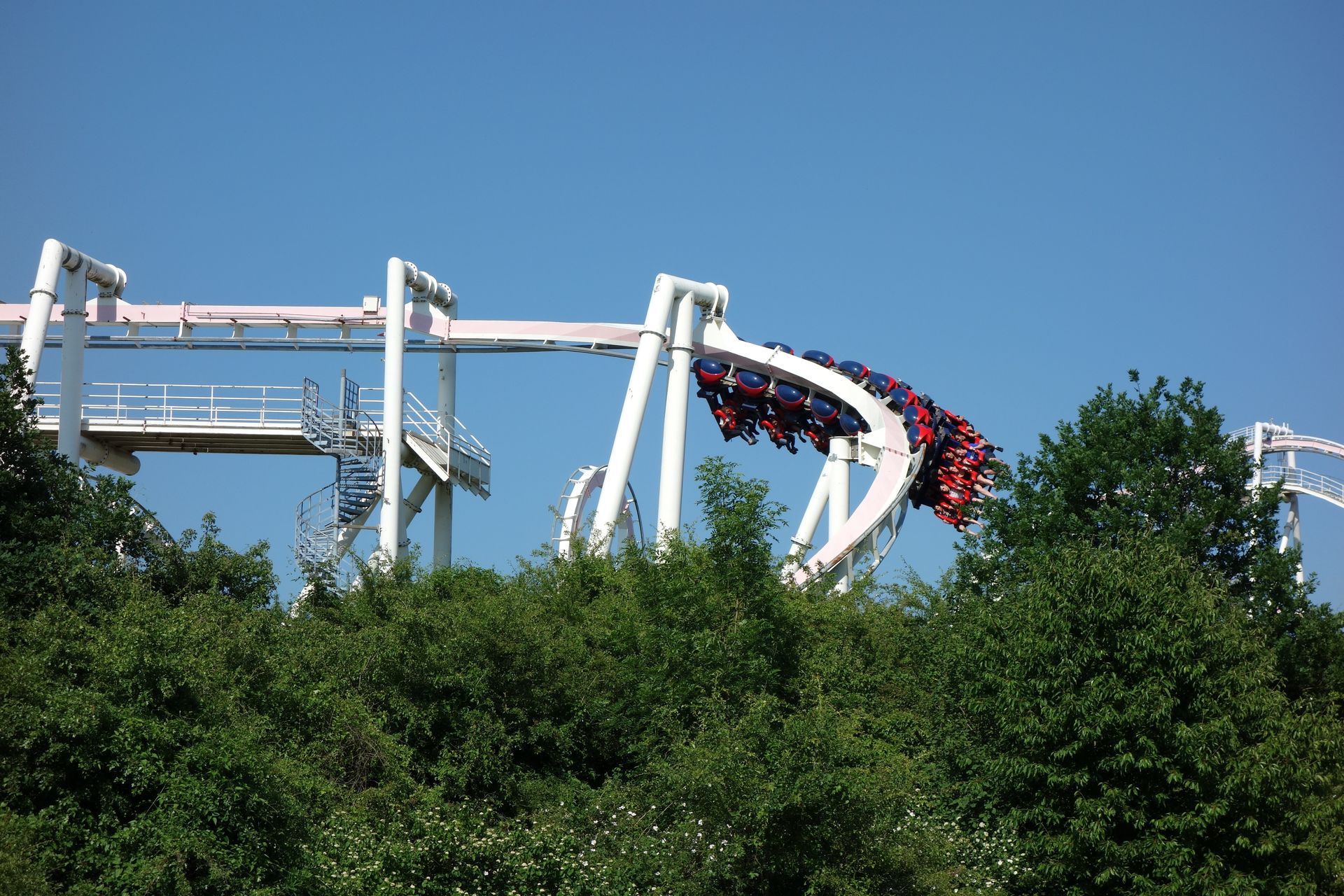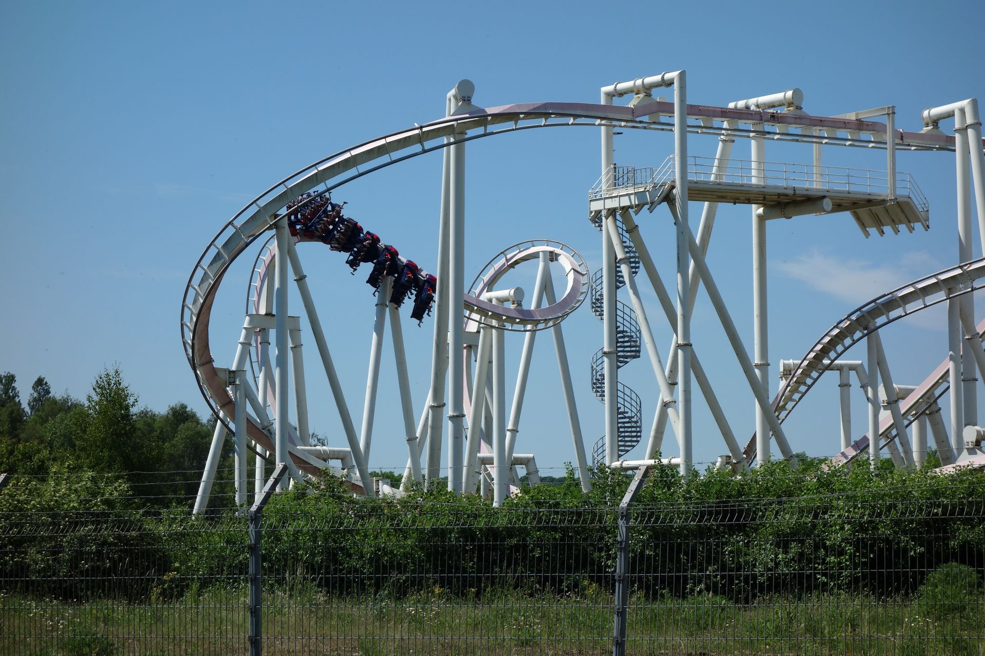 Sind die 40 Höhenmeter erklommen, stürzt sich der Zug in die Tiefe, hinein in den Looping und anschließend durch eine Zero-G Roll.