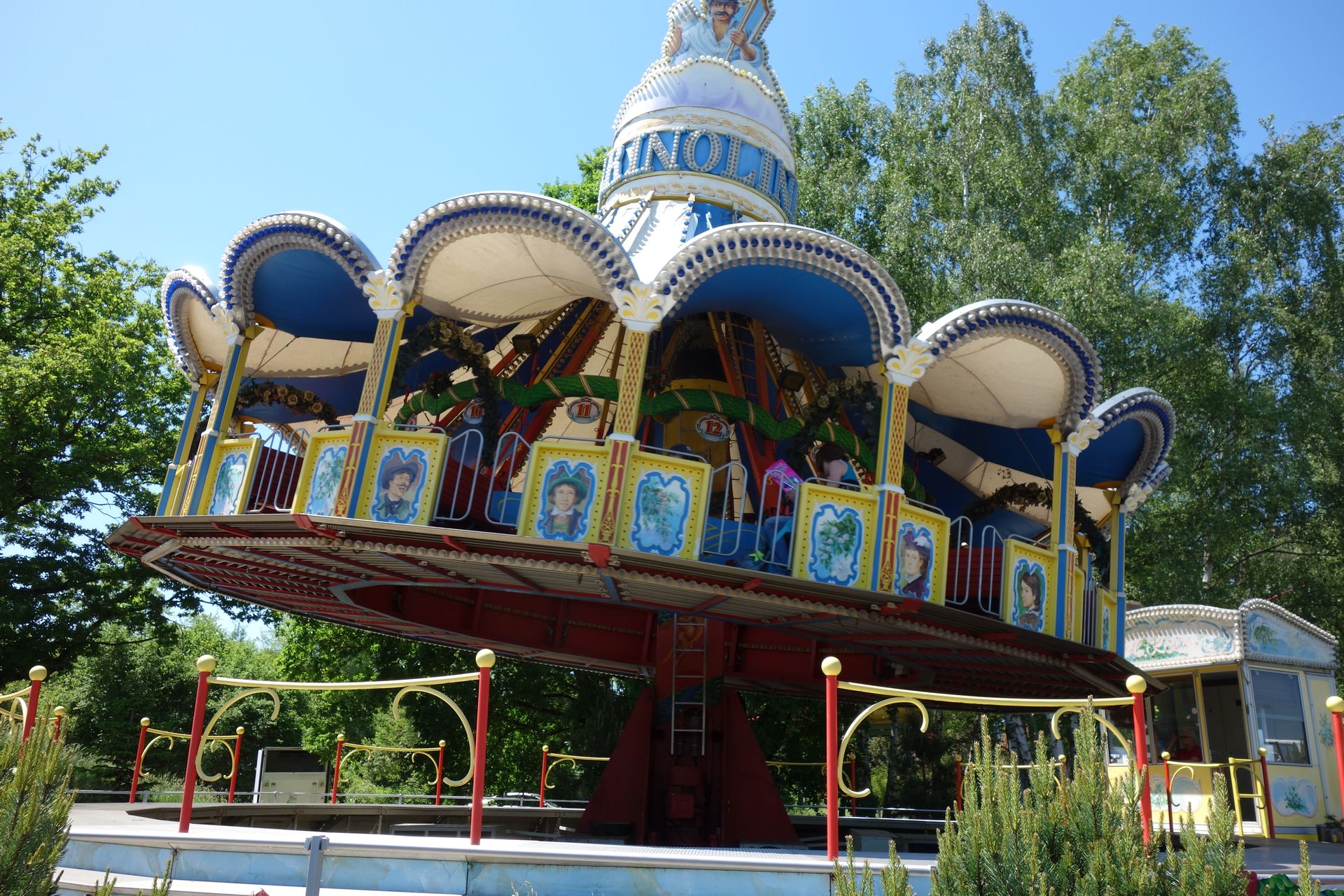 Am Ufer des großen Sees drehen zwei Karussells ihre Runden. Ein klassisches und eines mit Musikinstrumenten.