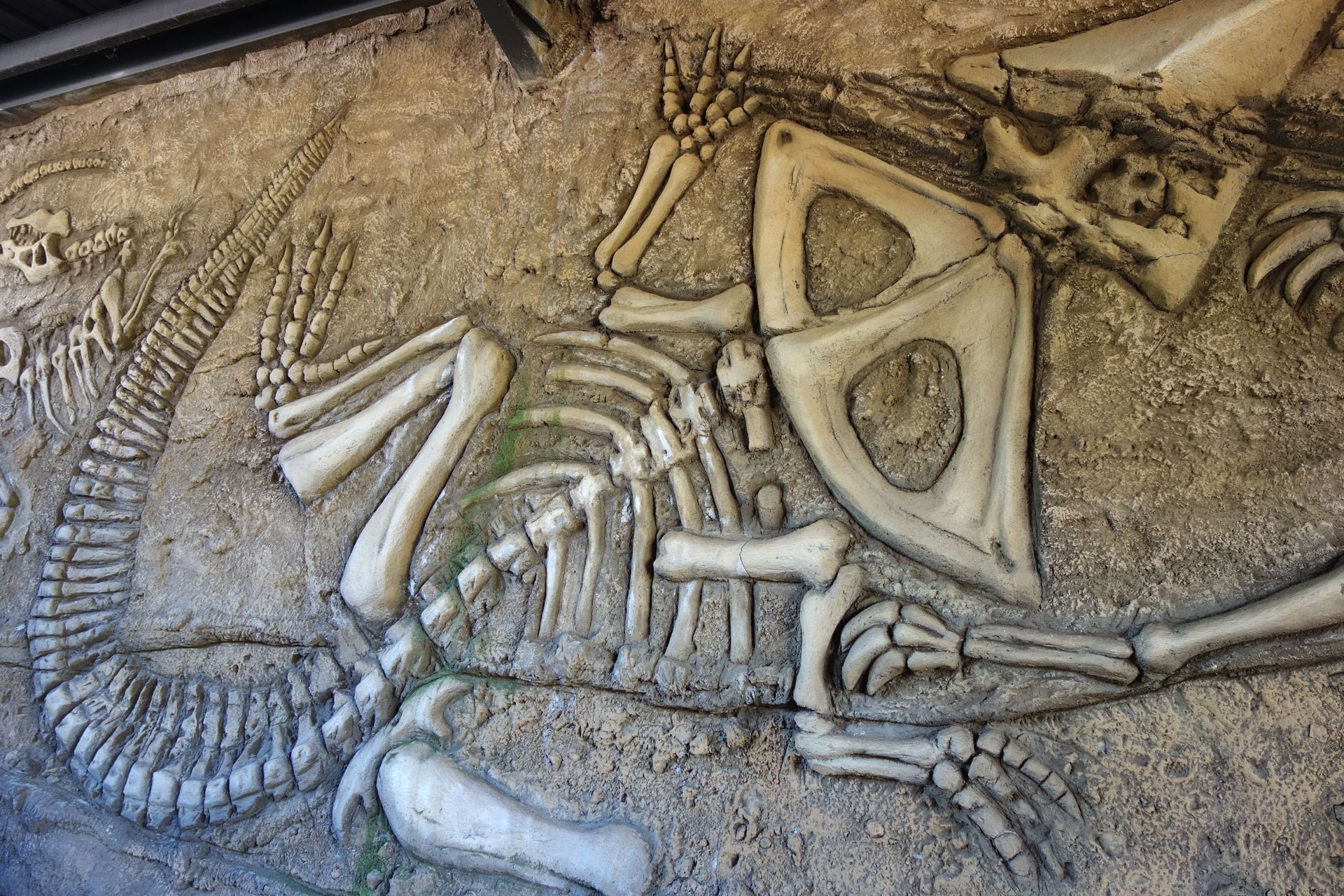 In die Wände wurden ein paar Fossilien modelliert, das Dach besteht aus schwarzem Wellblech.