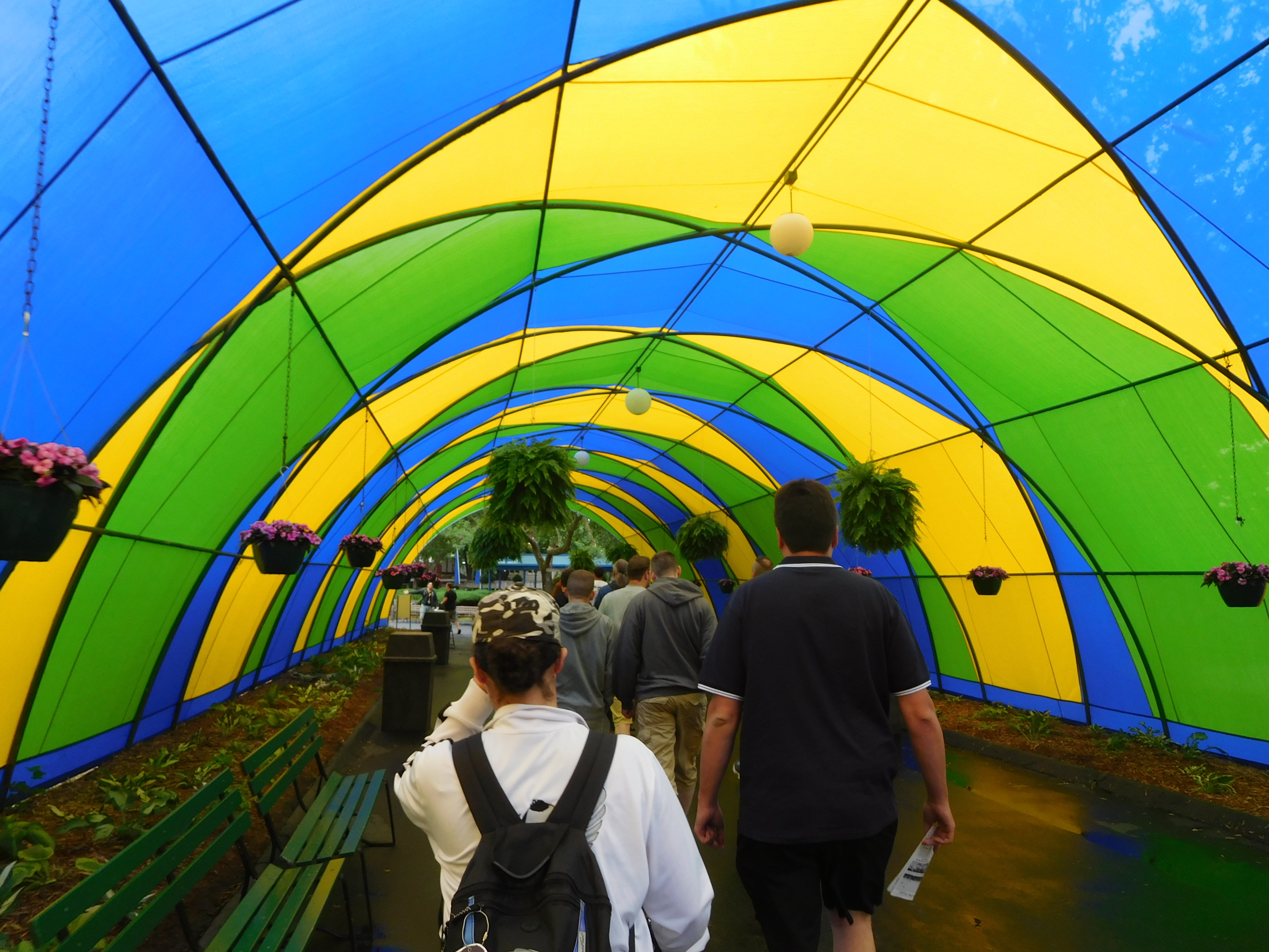 Durch eine Art Pavillon-Tunnel machten wir uns auf den Weg zur ersten Achterbahn, die wahrscheinlich die schwächste Kapazität haben würde.