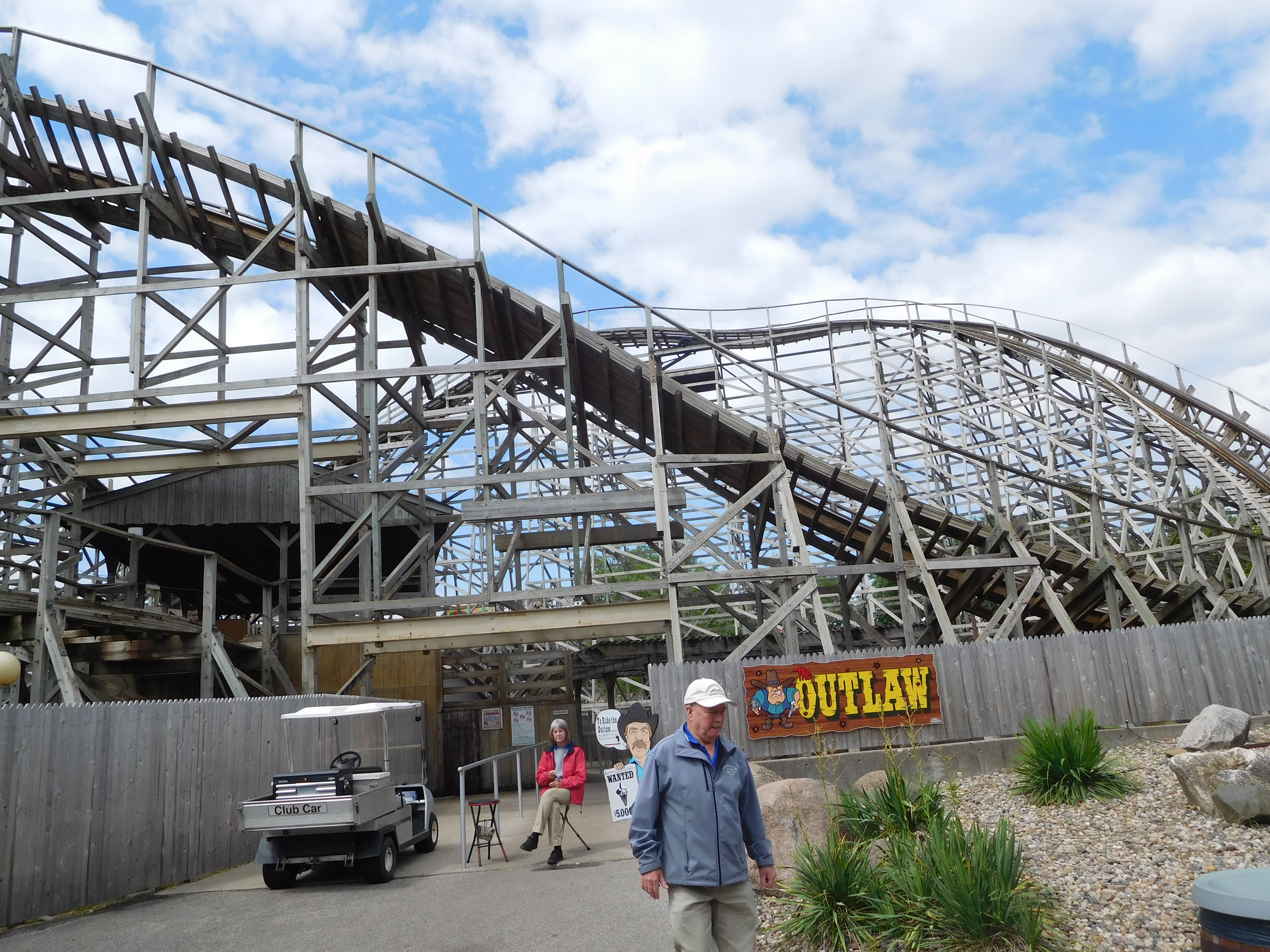 Das konnte doch echt nicht wahr sein! The Underground herausgenommen, waren alle bisherigen 4 Holzachterbahnen auf der Tour zu Beginn geschlossen. Uns war irgendwie nicht so das Glück hold bezüglich der Woodies. Immerhin öffnete in Worlds of Fun ja noch der Timber Wolf, aber hier sah es schlecht aus: Sie prognostizierte eine eventuelle Öffnung irgendwann nachmittags, allerdings war die Abreise für bereits 14 Uhr geplant. Die Aussichten waren also nicht sehr rosig und daher machten wir uns wieder auf den Rückweg vom hinteren Parkbereich. Nach ein paar 100m kam uns Dirk entgegen und wir schilderten ihm die Situation bei Outlaw. Er schaute uns entgeistert an und antwortete, dass ihm von der Parkchefin bzw. einer Mitarbeiterin die Öffnung der Bahn zugesagt wurde. Schulterzuckend folgten wir Dirk wieder zurück zu Outlaw und setzten uns zu ein paar anderen FKFlern, die sich auf den Bänken im Western-Bereich niedergelassen hatten.