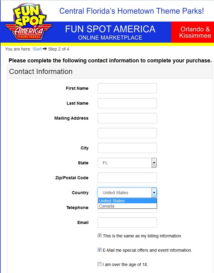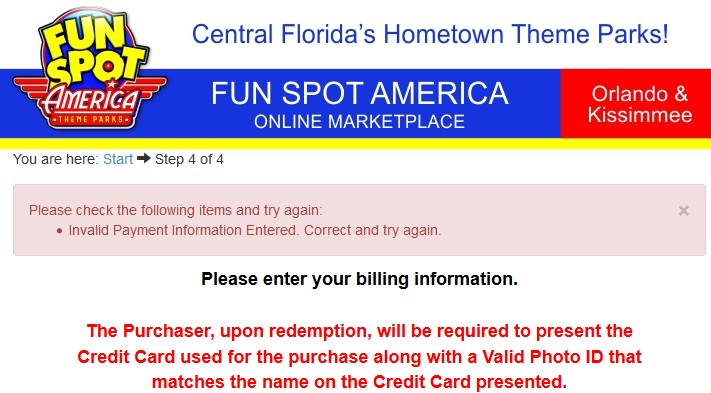 ich habe versucht auf der Homepage von "Fun Spot America" im Online-Shop Tagespässe und einen Souvenir-Trinkbecher zu erwerben. Leider bekomme ich immer gegen Ende des Bezahlvorgang die folgende Fehlermeldung: