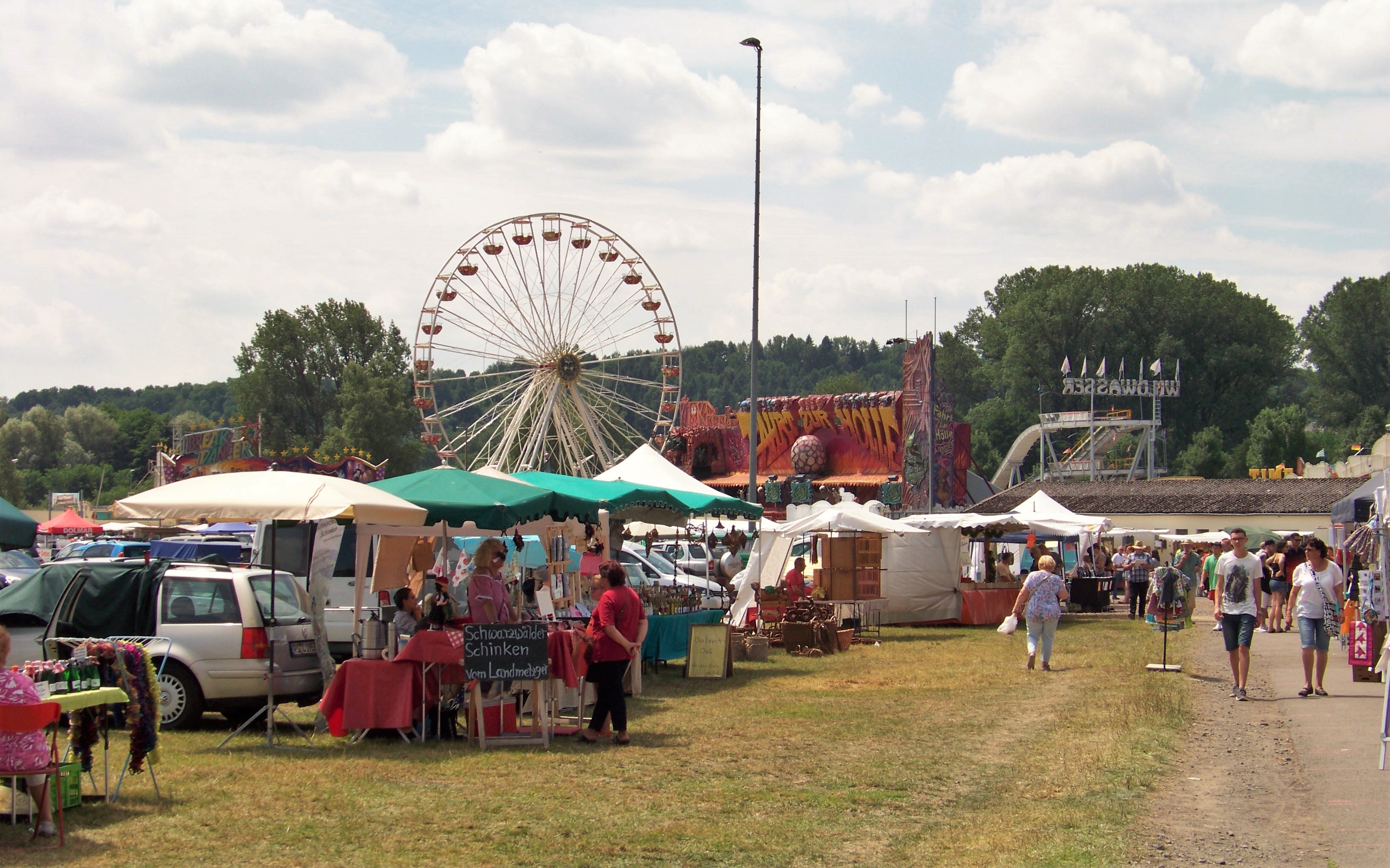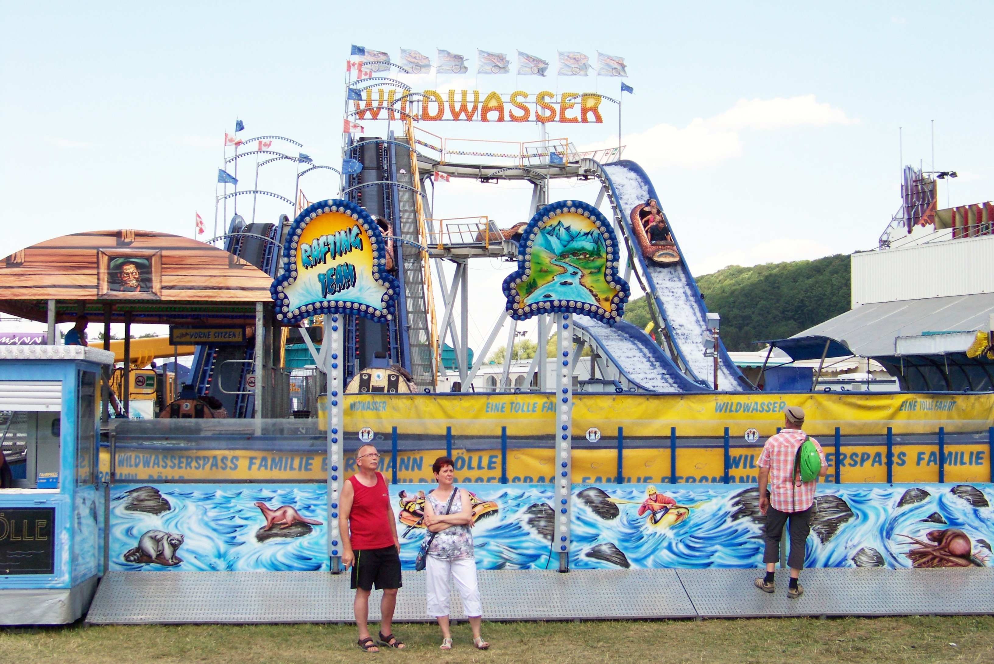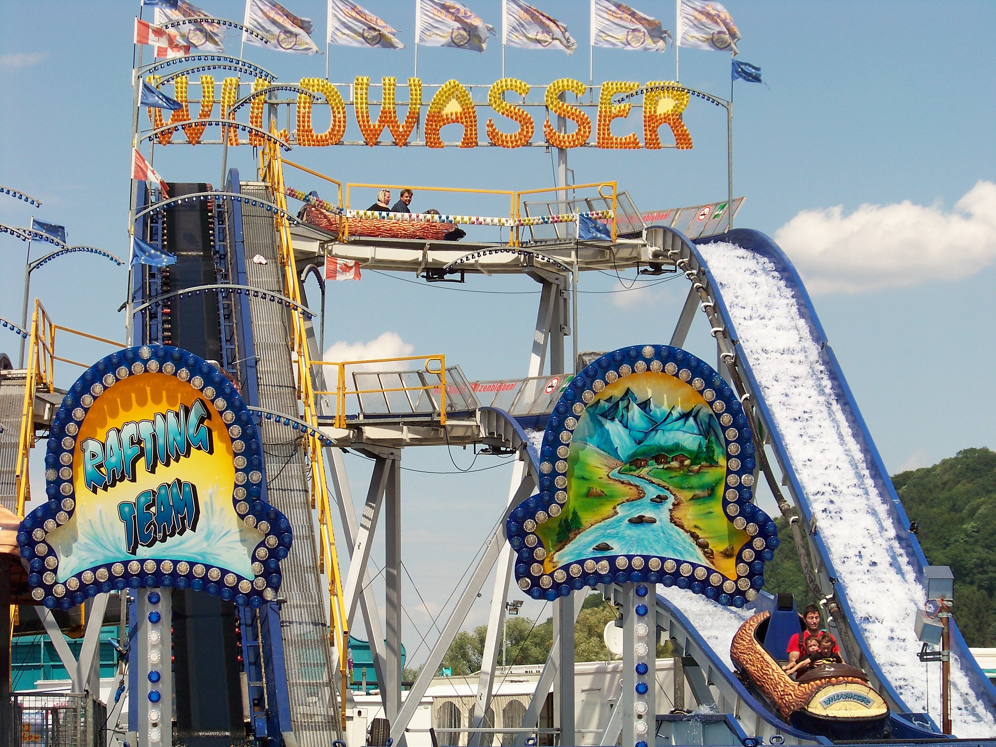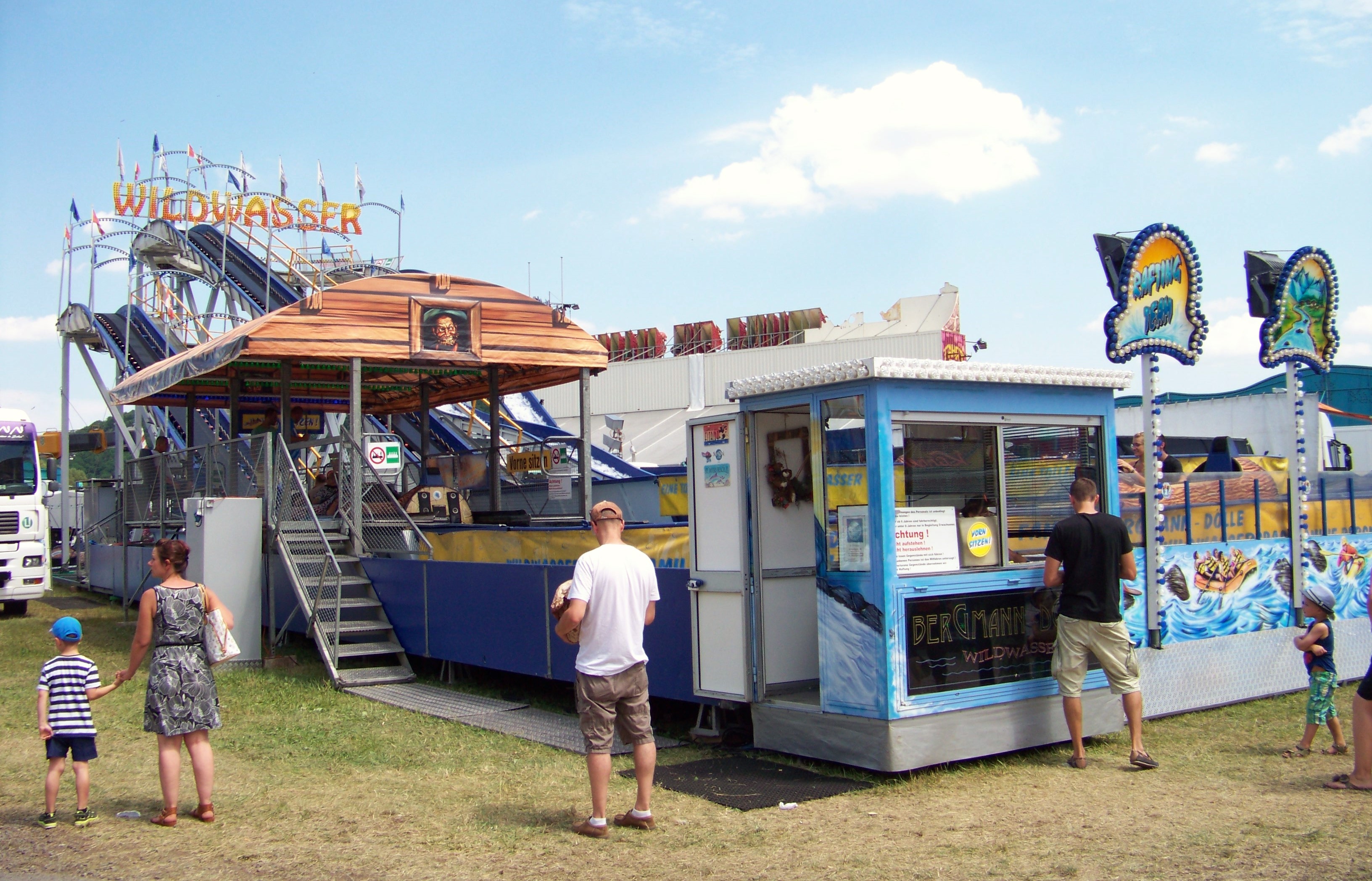 Auf der den Rundlauf abschließenden Ecke des Festplatzes standen der Take Off von Ruppert, das Colossus-Riesenrad von Göbel und gegenüber davon die Wildwasserbahn von Bergmann-Dölle, welche bei den hohen Temperaturen am Samstagnachmittag die meisten Fahrgäste von allen Fahrgeschäften vor Ort anzog.