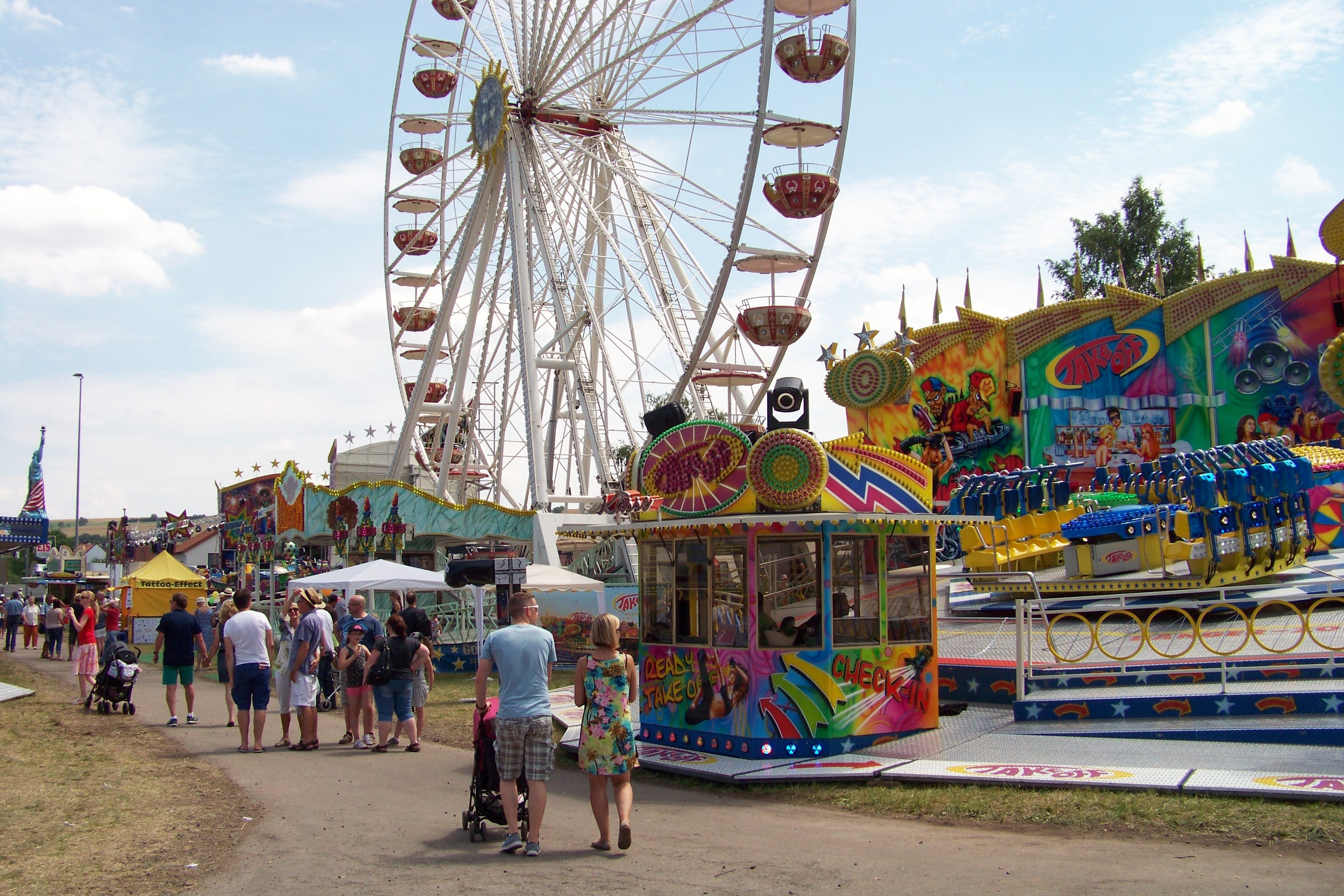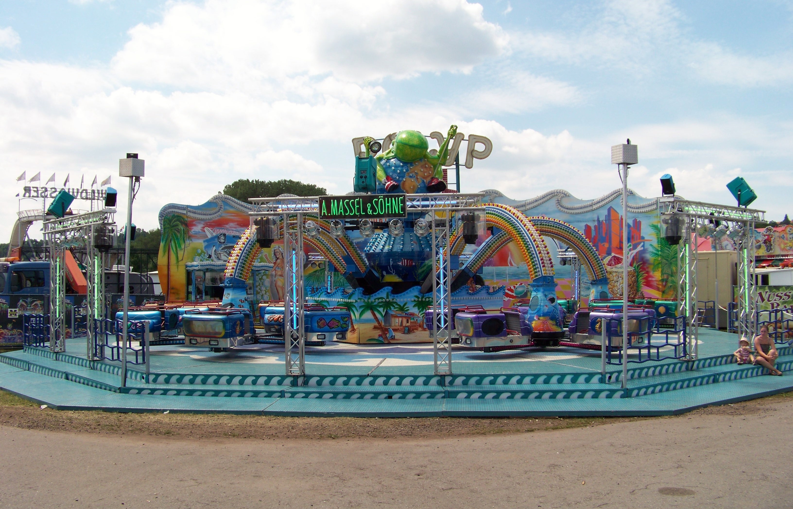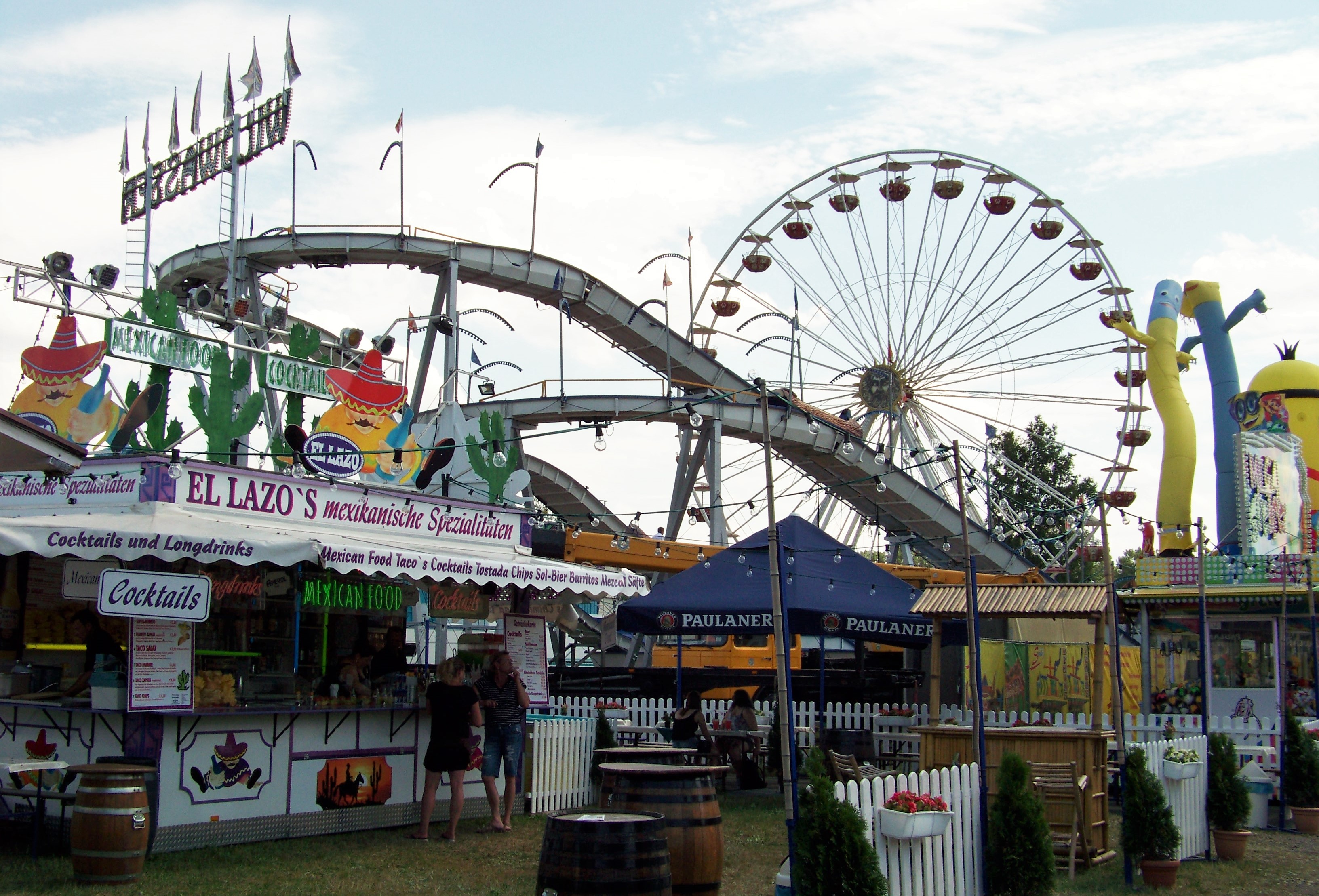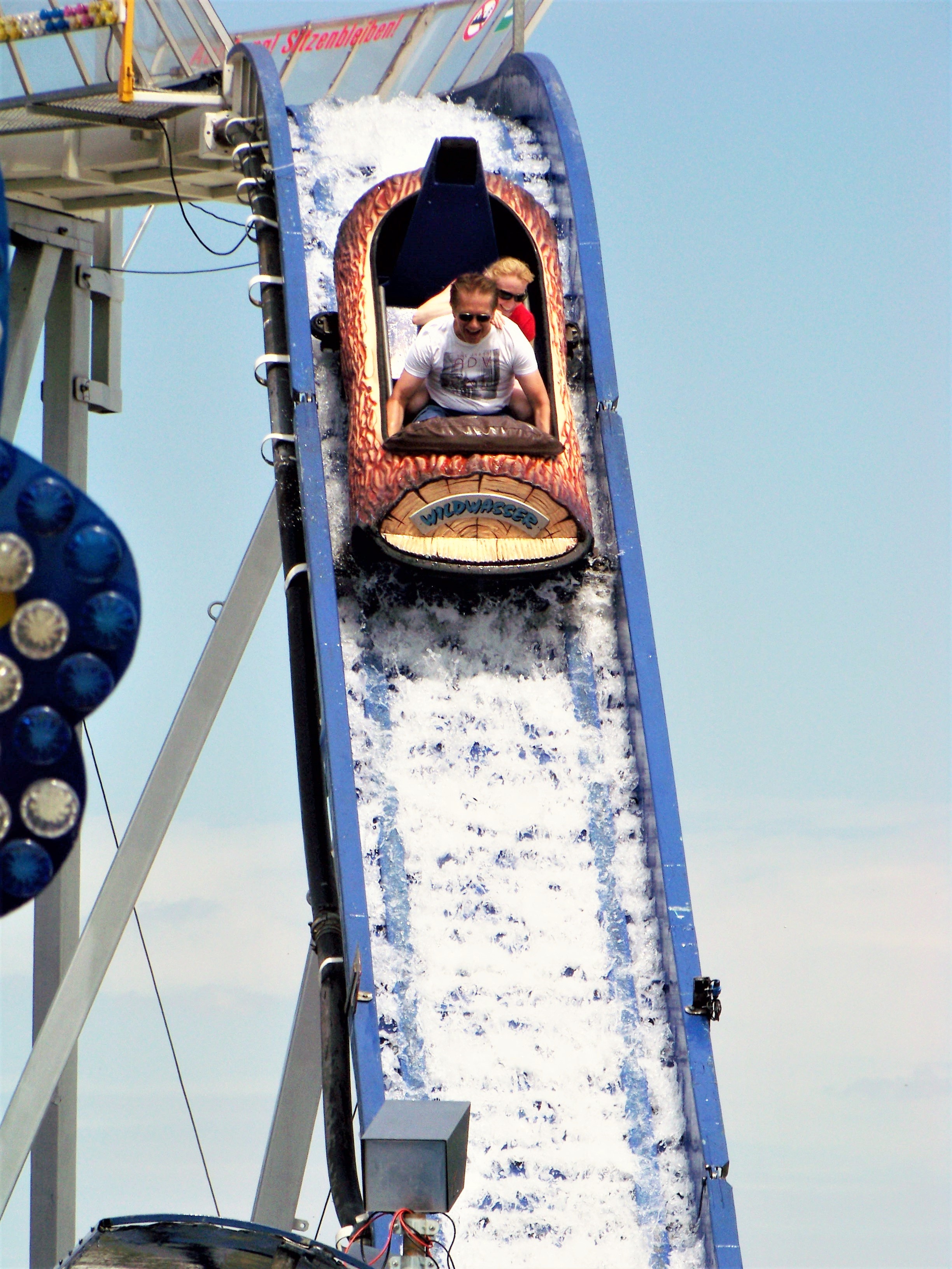 Auf der den Rundlauf abschließenden Ecke des Festplatzes standen der Take Off von Ruppert, das Colossus-Riesenrad von Göbel und gegenüber davon die Wildwasserbahn von Bergmann-Dölle, welche bei den hohen Temperaturen am Samstagnachmittag die meisten Fahrgäste von allen Fahrgeschäften vor Ort anzog.