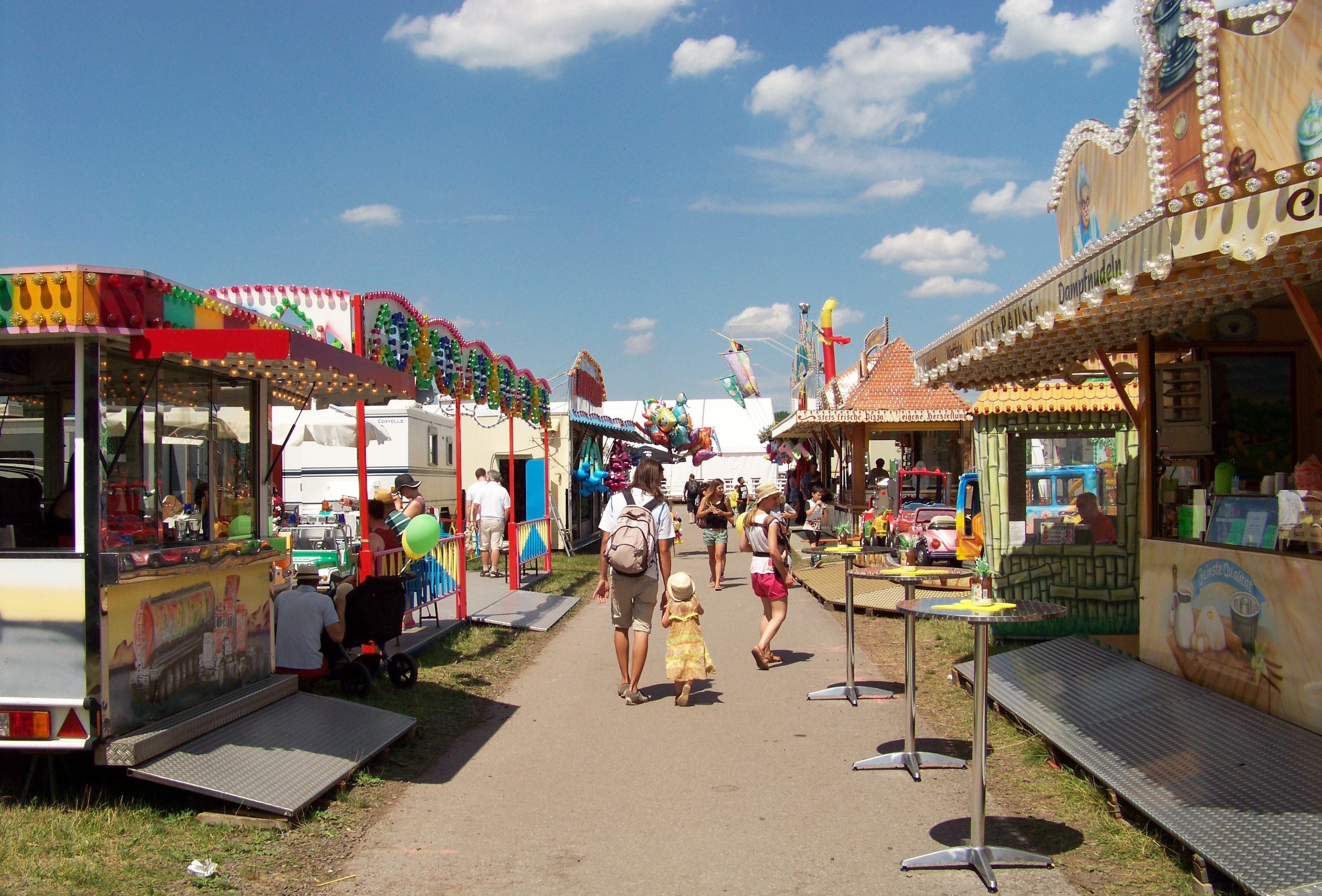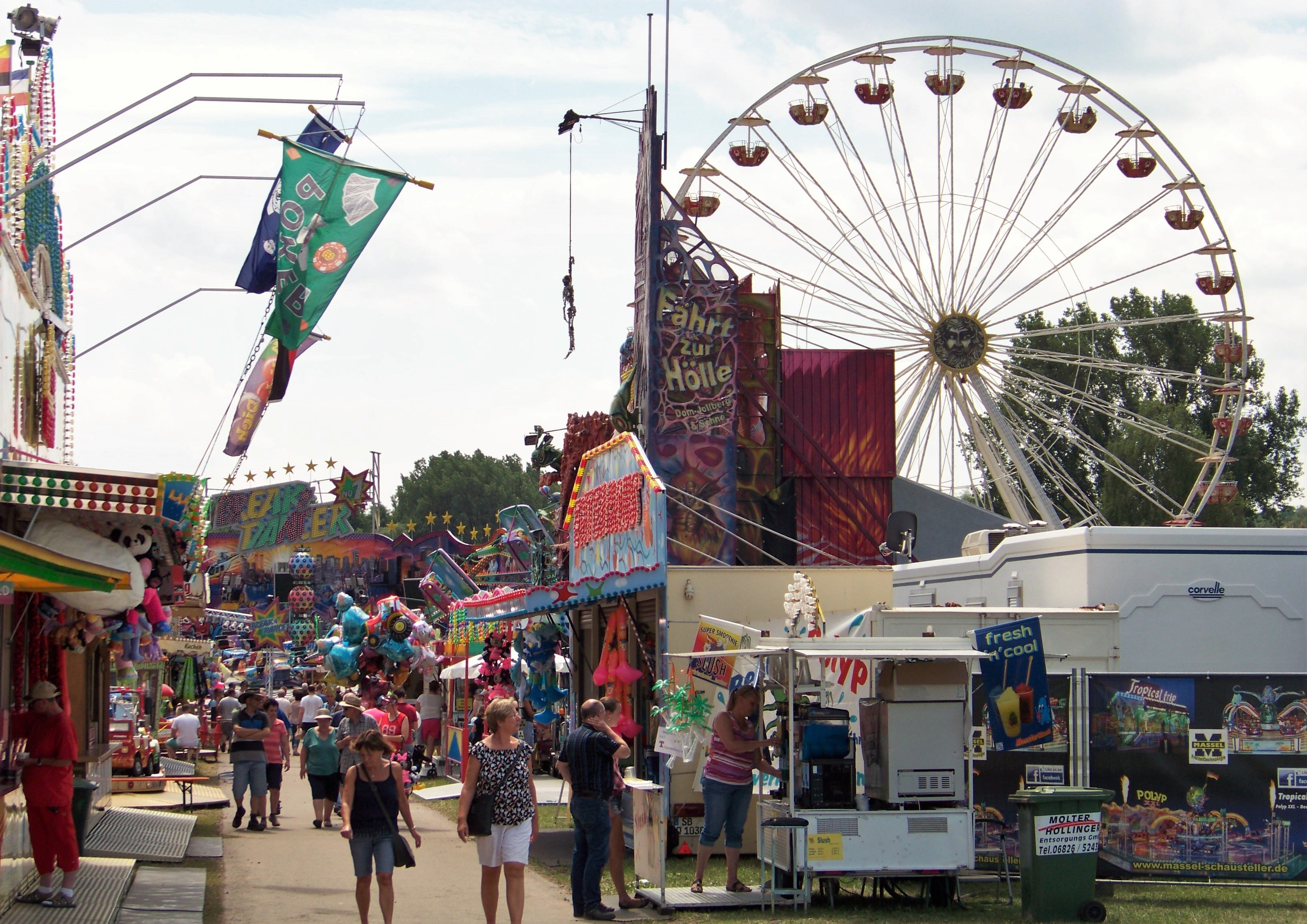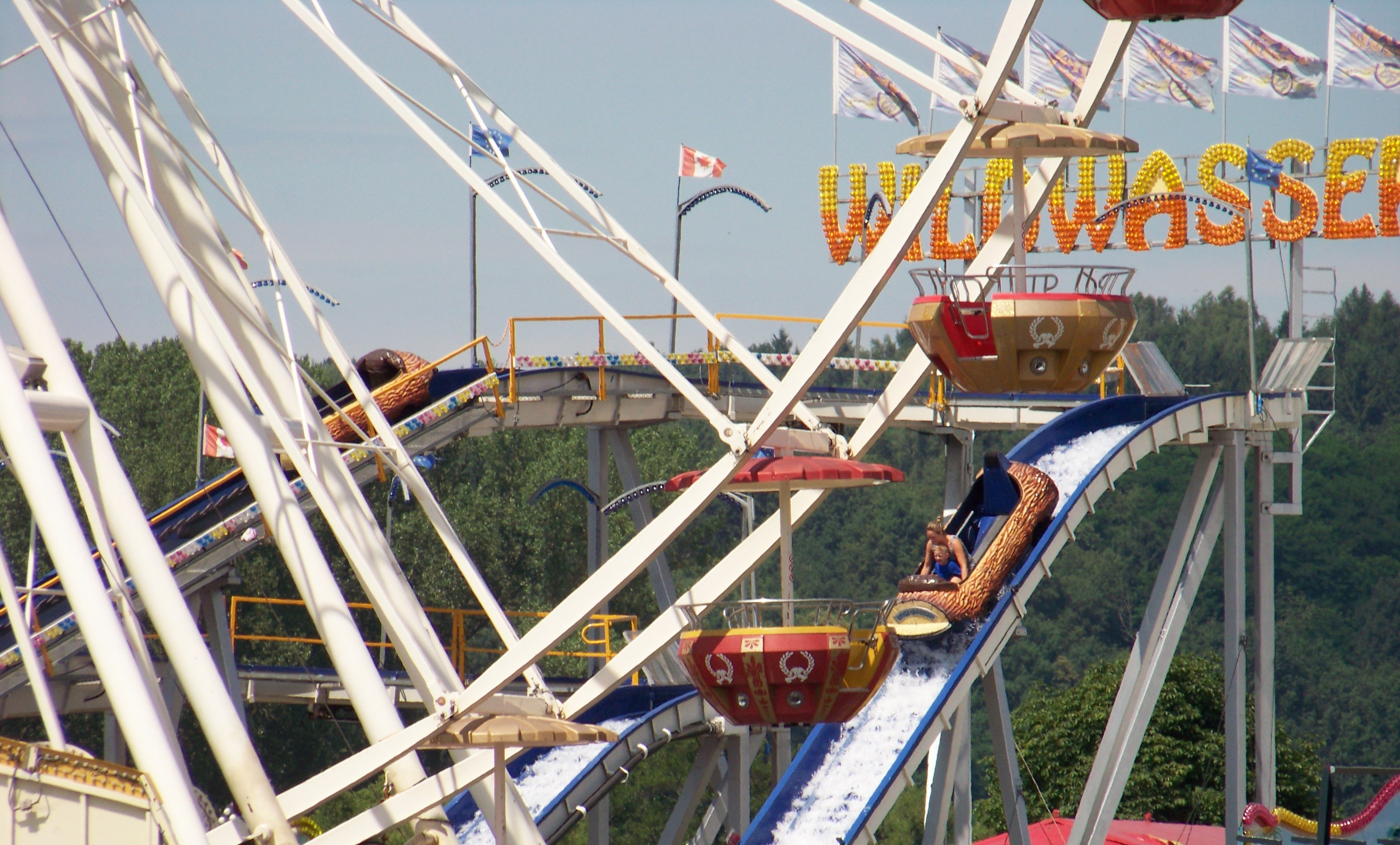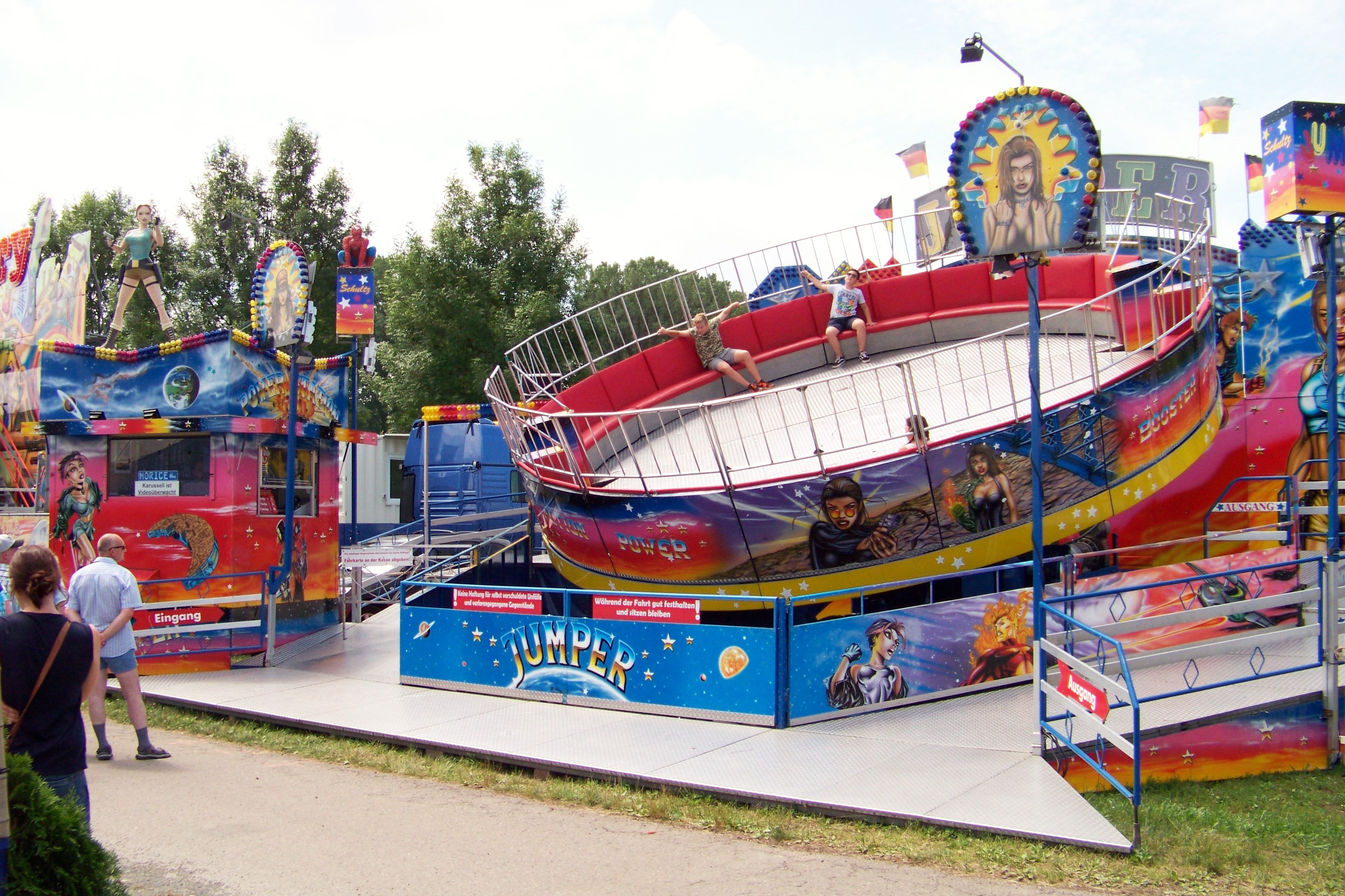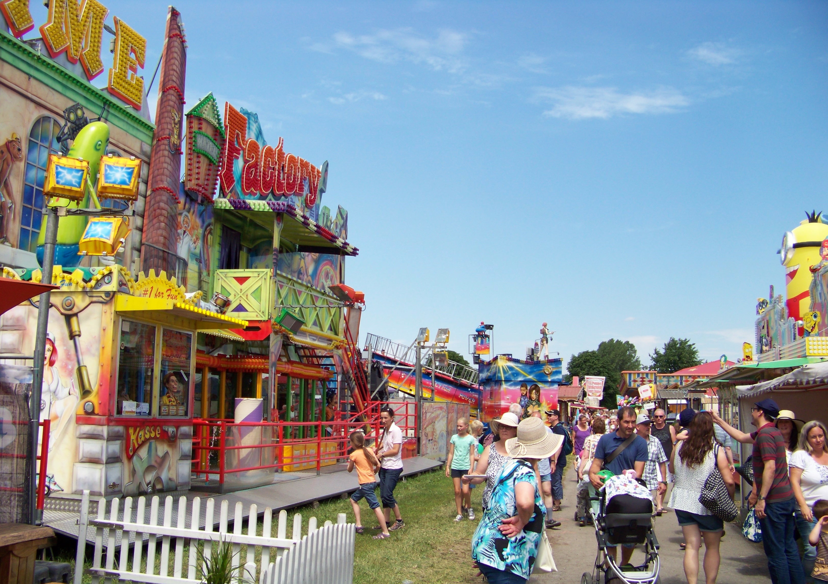 Auf der den Rundlauf abschließenden Ecke des Festplatzes standen der Take Off von Ruppert, das Colossus-Riesenrad von Göbel und gegenüber davon die Wildwasserbahn von Bergmann-Dölle, welche bei den hohen Temperaturen am Samstagnachmittag die meisten Fahrgäste von allen Fahrgeschäften vor Ort anzog.