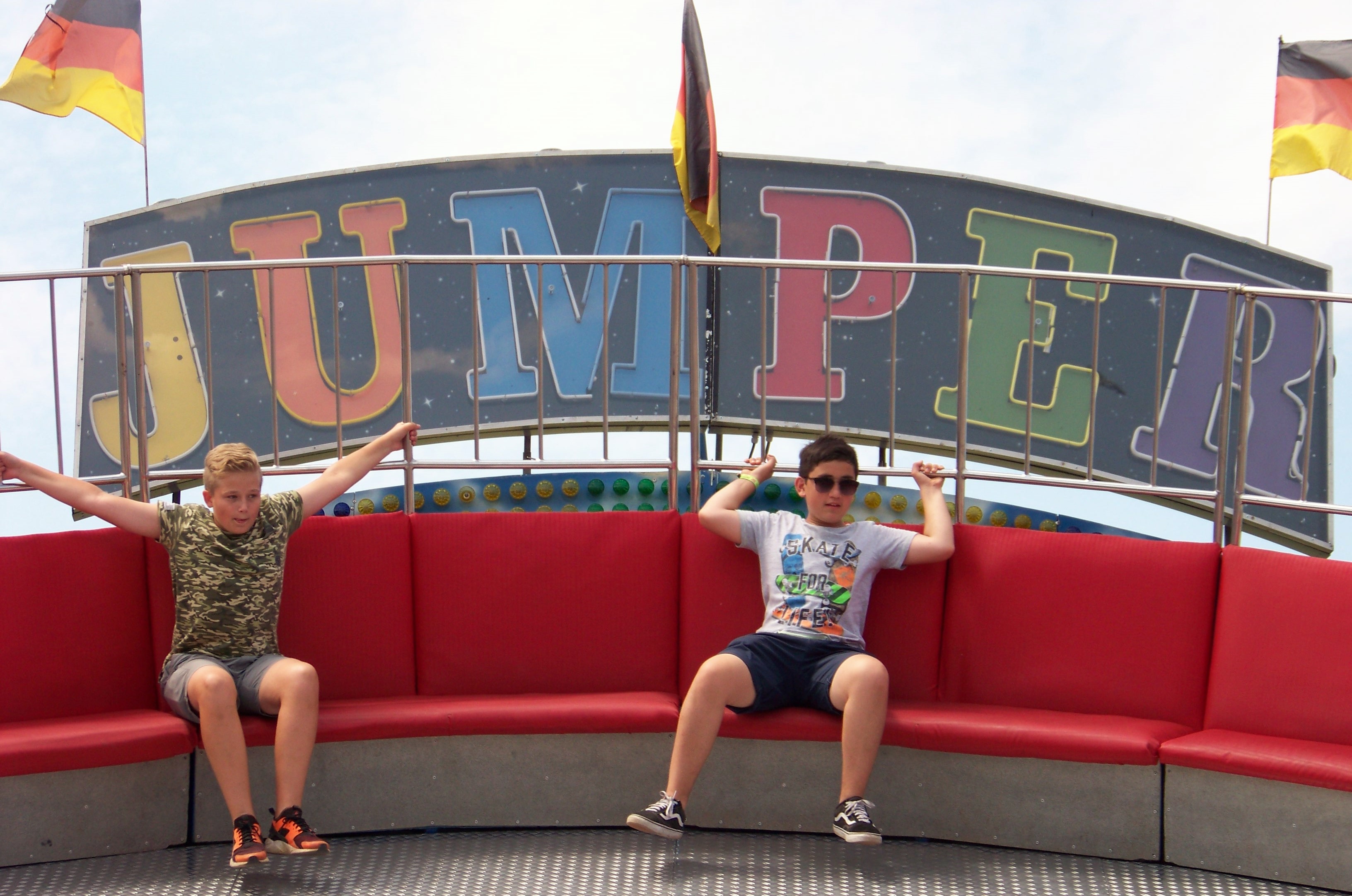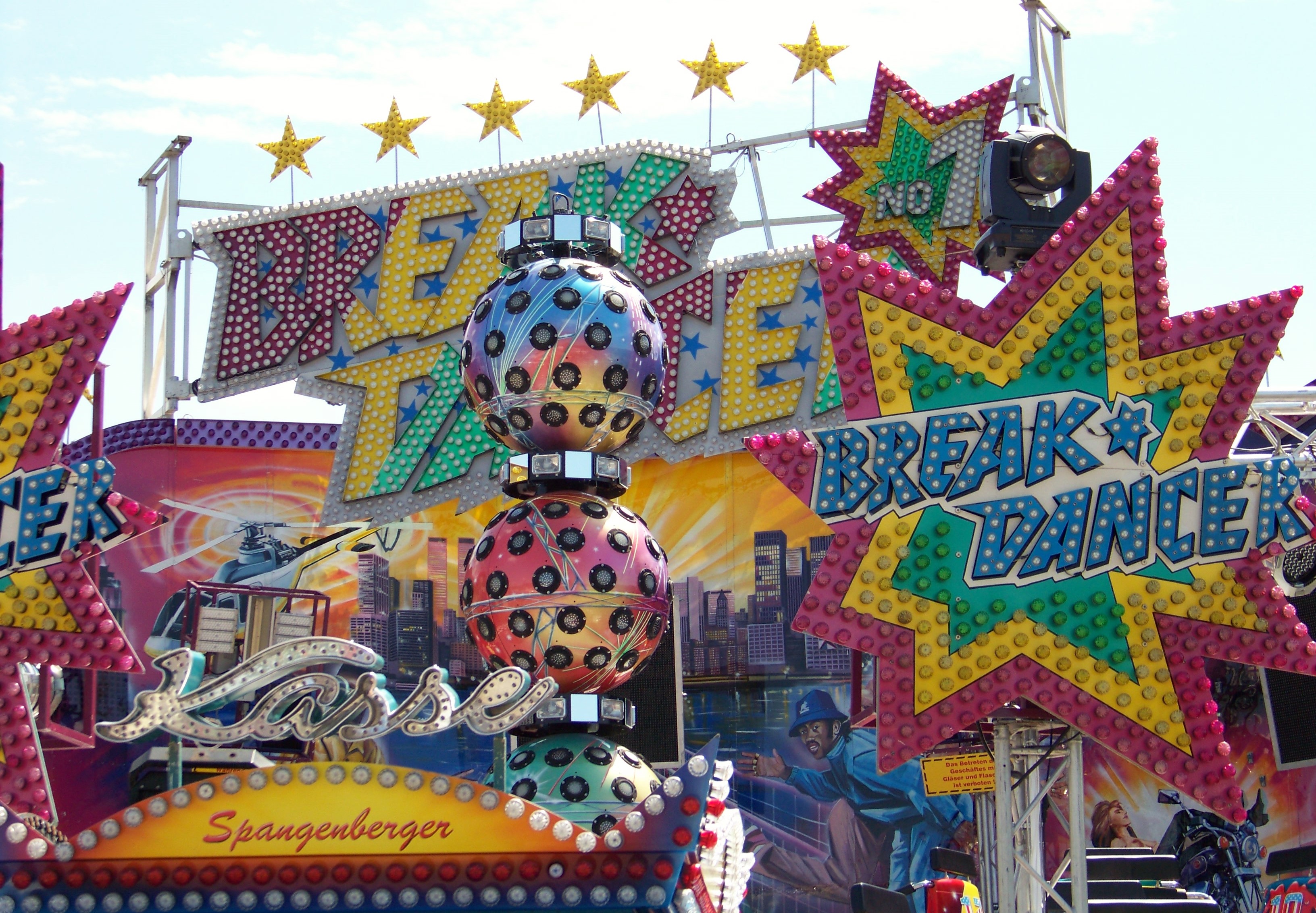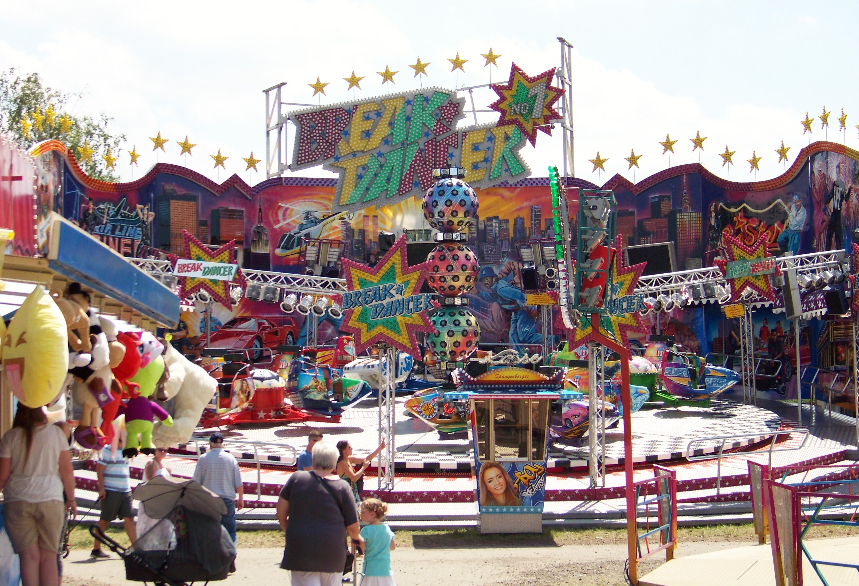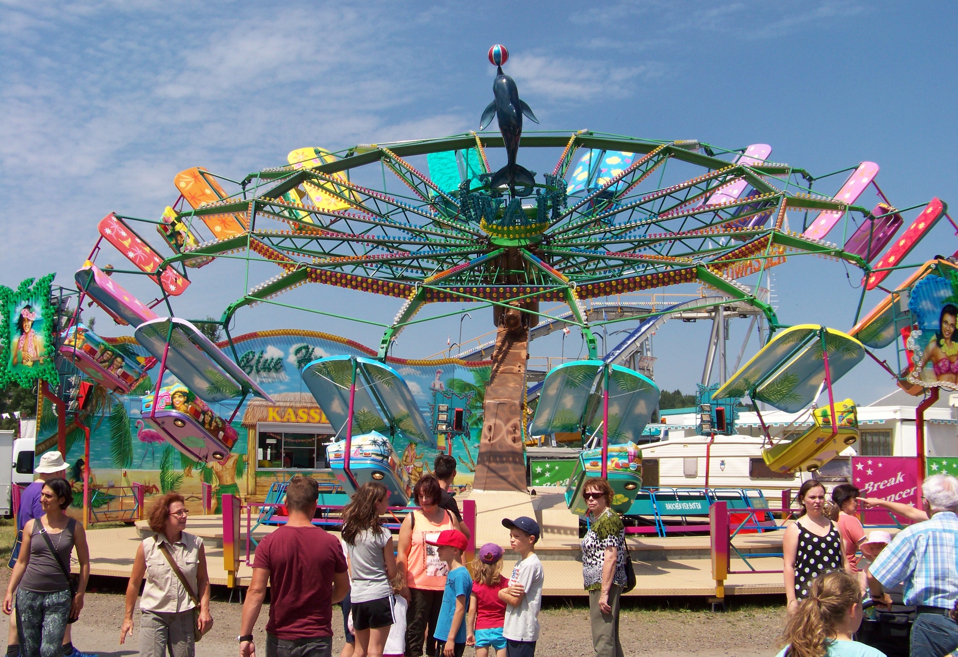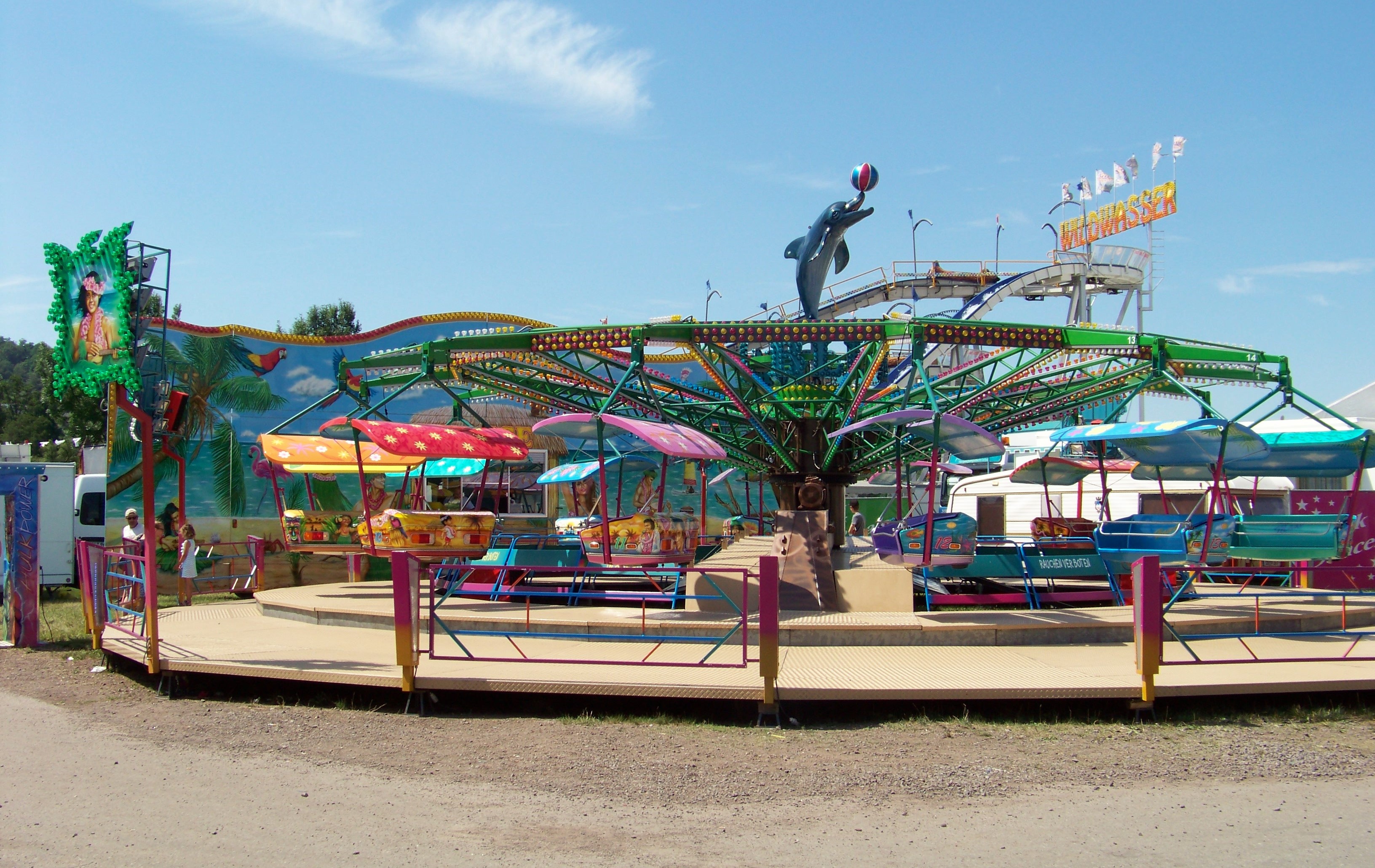 Ansonsten bot sich in diesem Jahr eine ganz angenehme Beschickung bei eher geringem Besucherandrang am sehr heißen Viehmarktstag. Den Rundgang eröffne ich am Haupteingang zum Kirmesplatz, wo der schon genannte Twister „Blue Hawaii“ von Pistorius seine Runden drehte und gegenüber der Break Dancer von Spangenberger auf Besucher wartete.