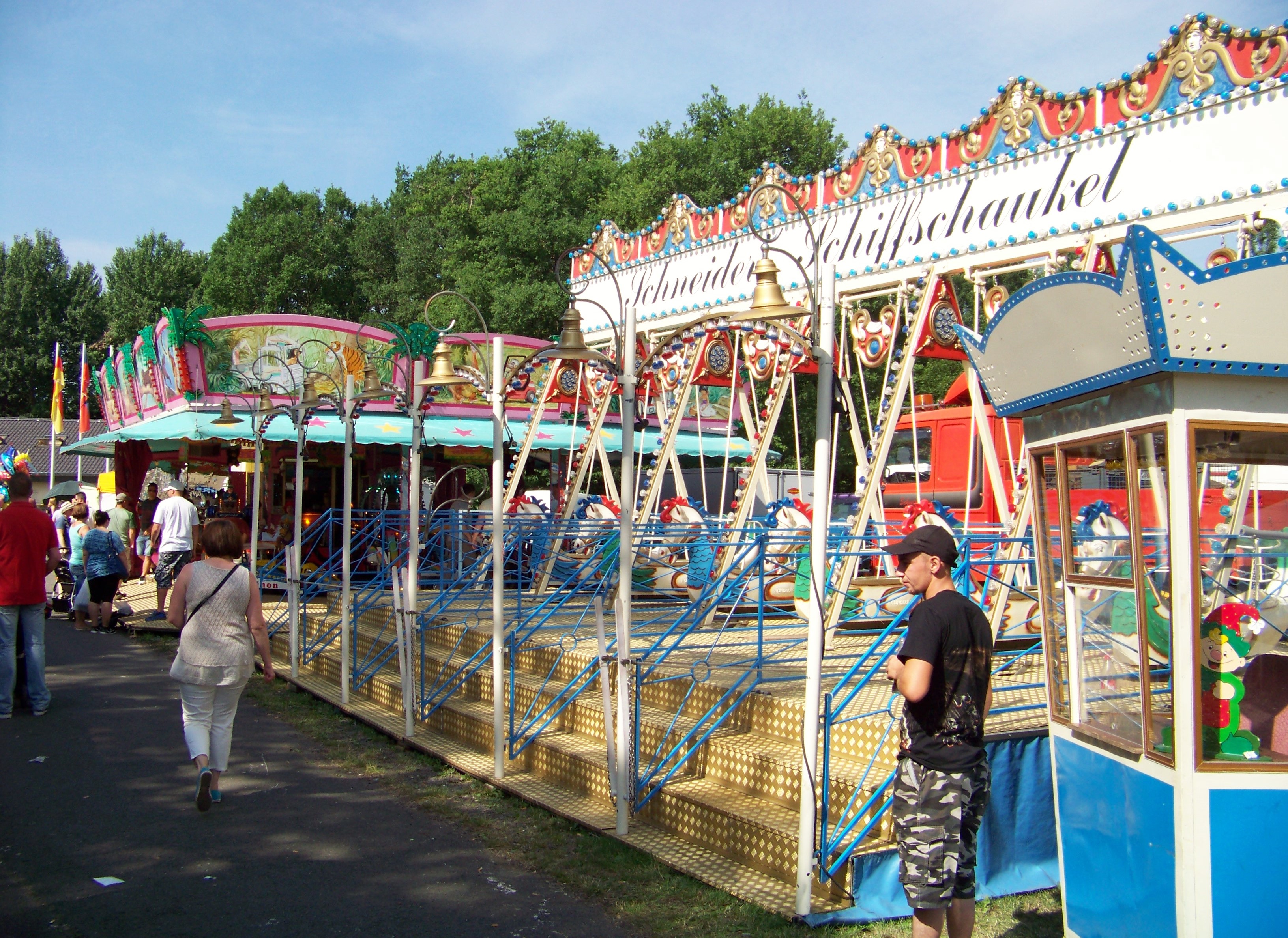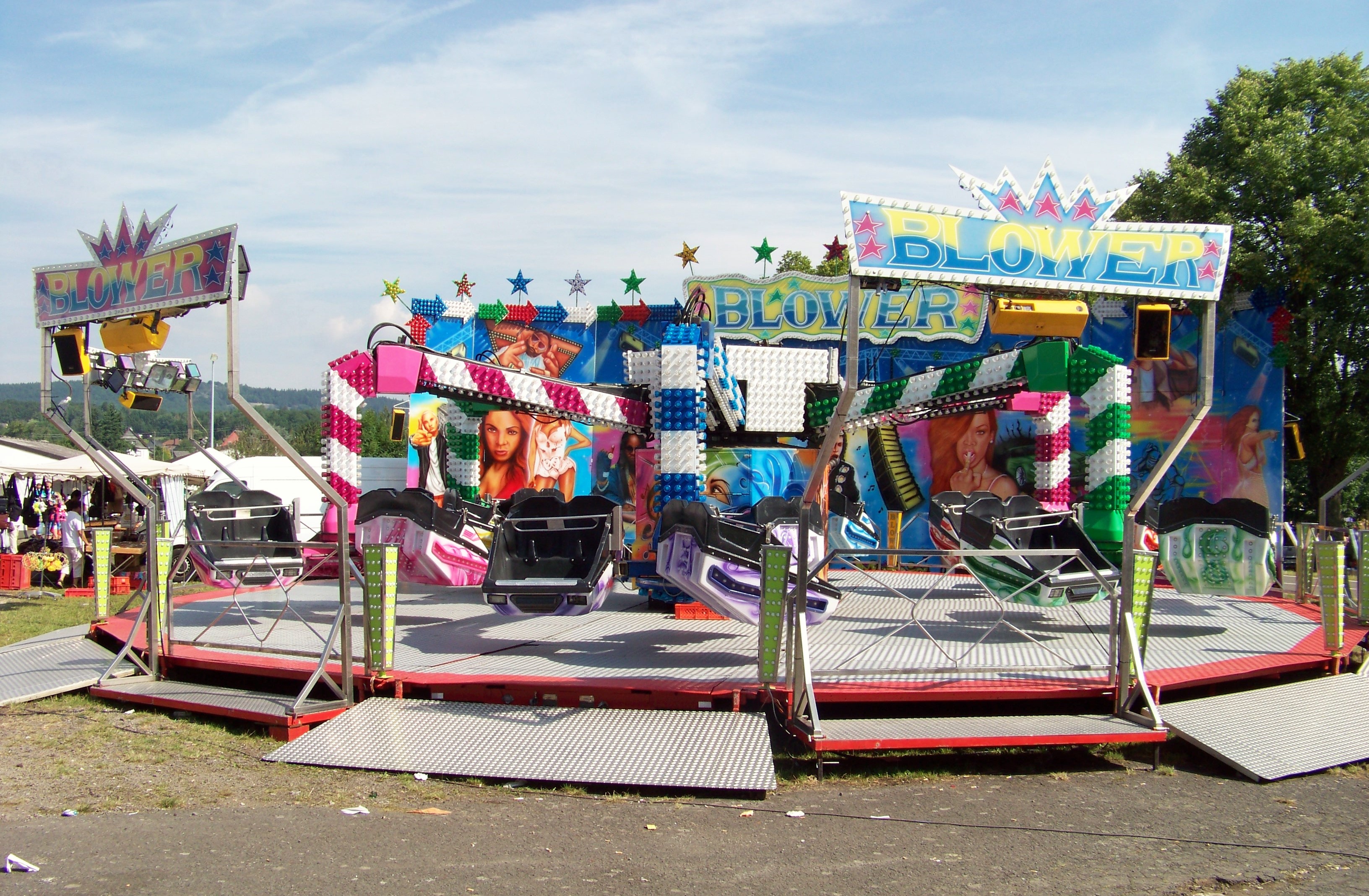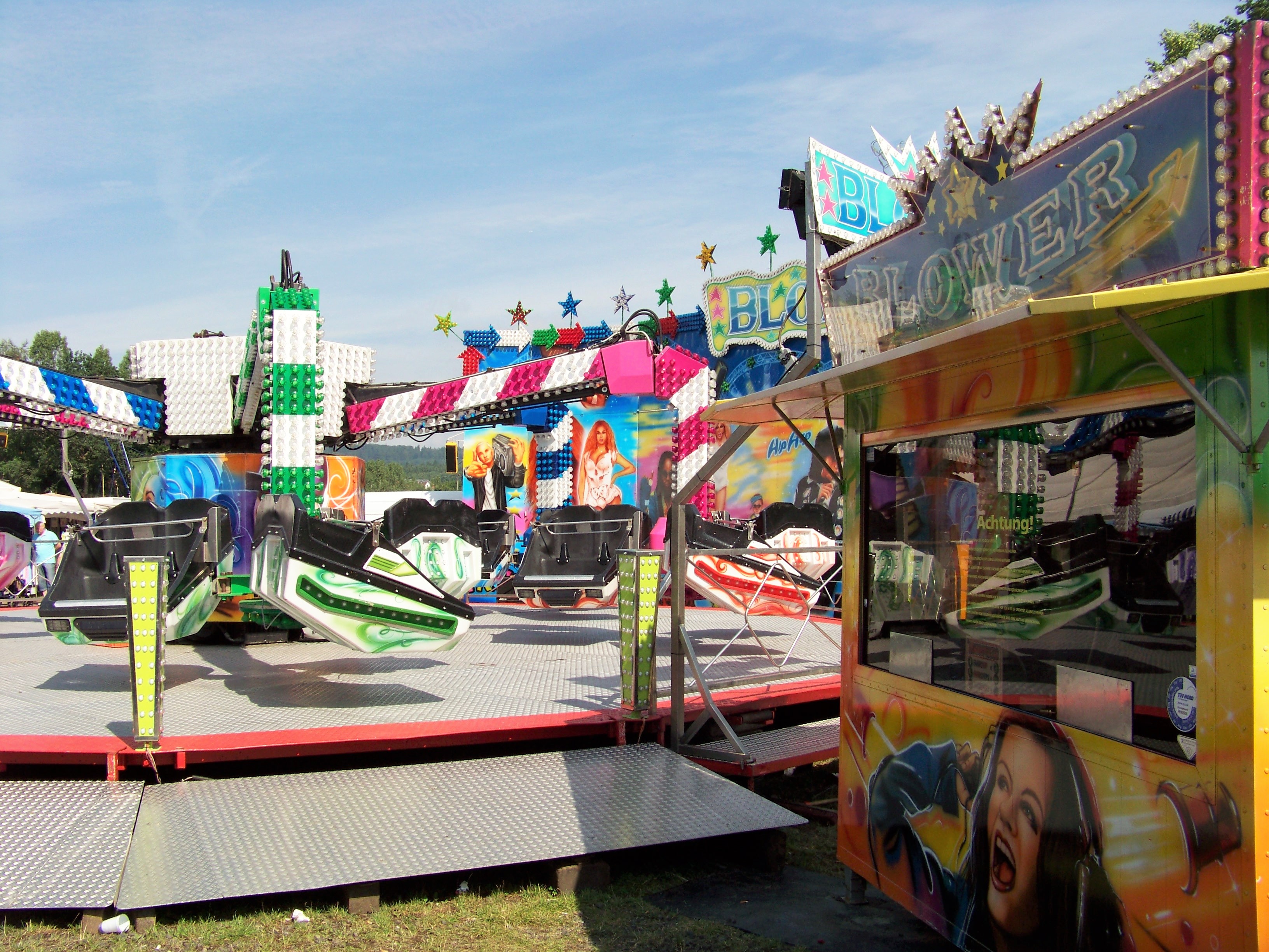 Neben der Landstraße, die mitten durchs Marktgelände führt und während der Markttage nicht gesperrt wird findet man auch die wenigen größeren Fahrgeschäfte. Dieses Jahr zum ersten mal zu Gast ist der Blower von Schaak, der den Platz des Break Dance (der 3er-Breaker von Schneider war hier Stammgeschäft gewesen) einnimmt. Ich bin sehr gespannt, ob der Blower nun den Stammplatz übernimmt oder hier in den kommenden Jahren rotiert wird.