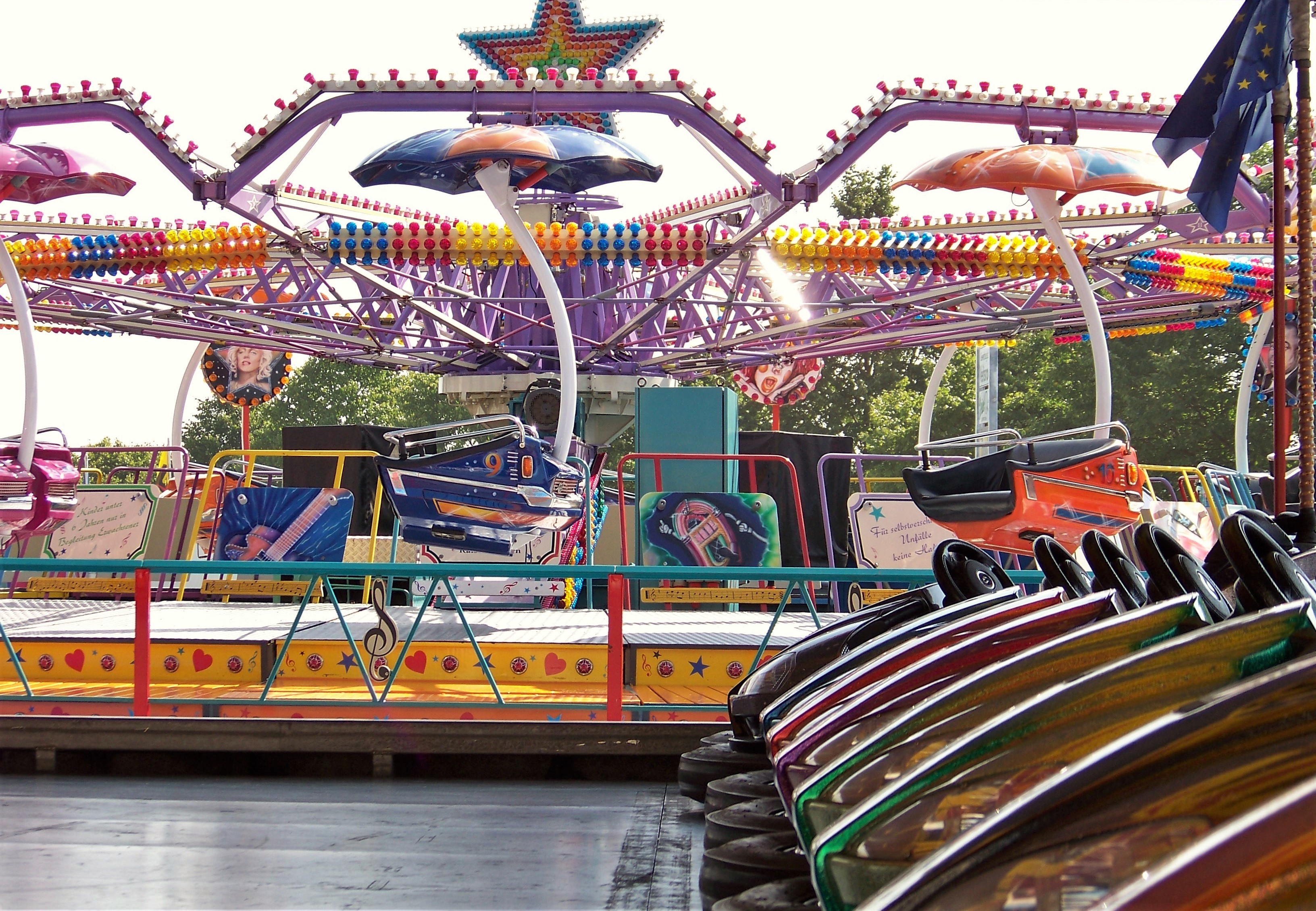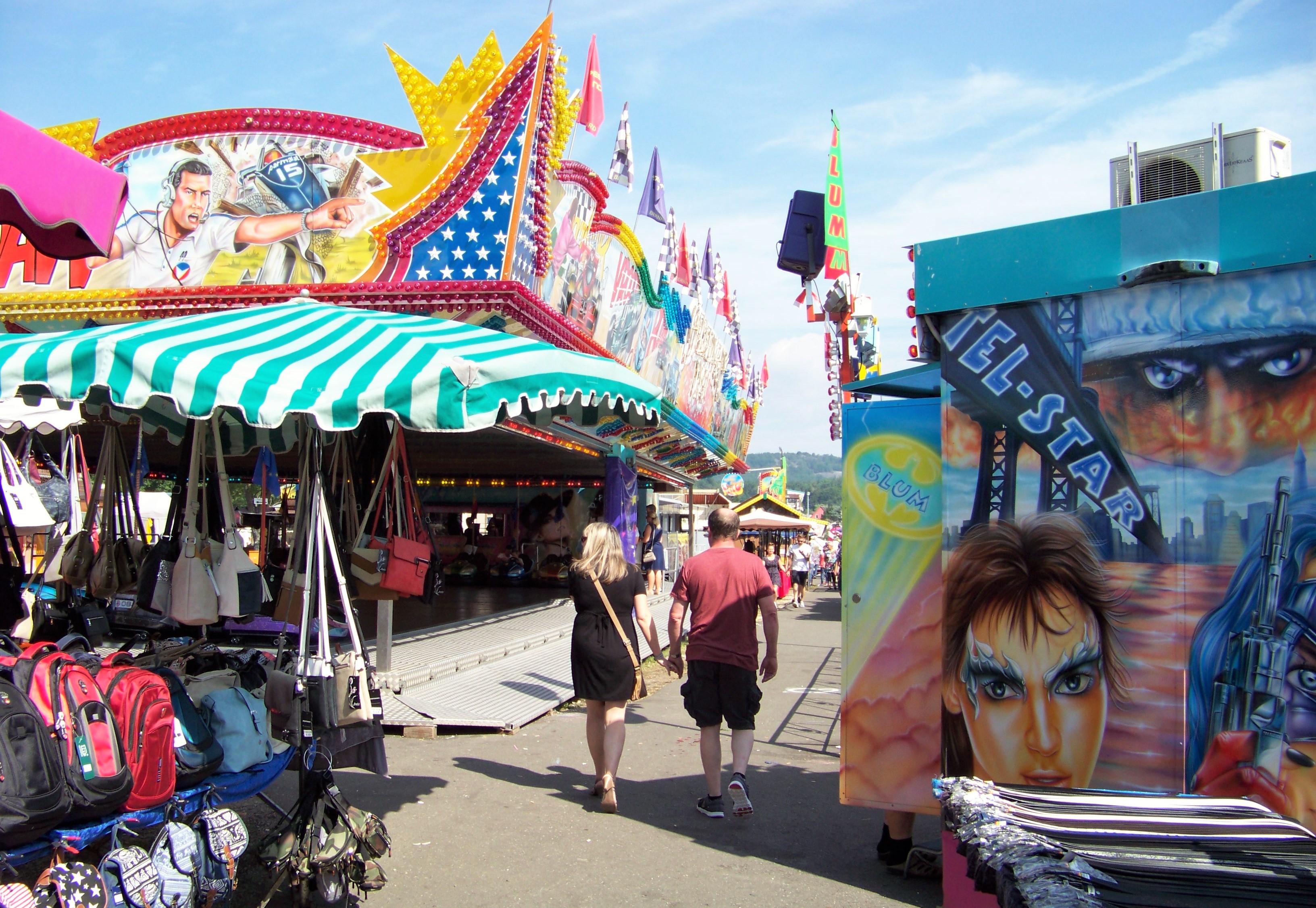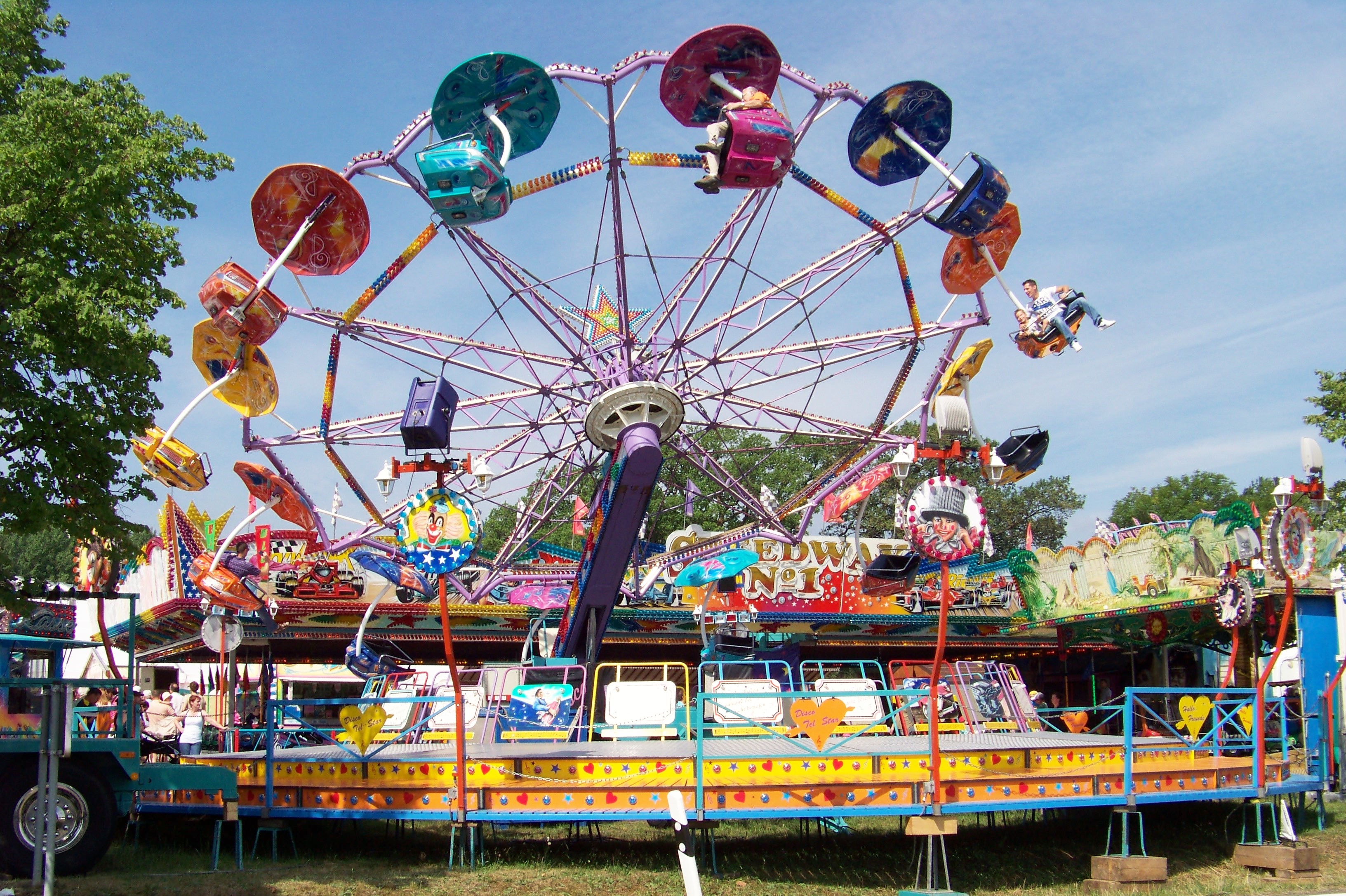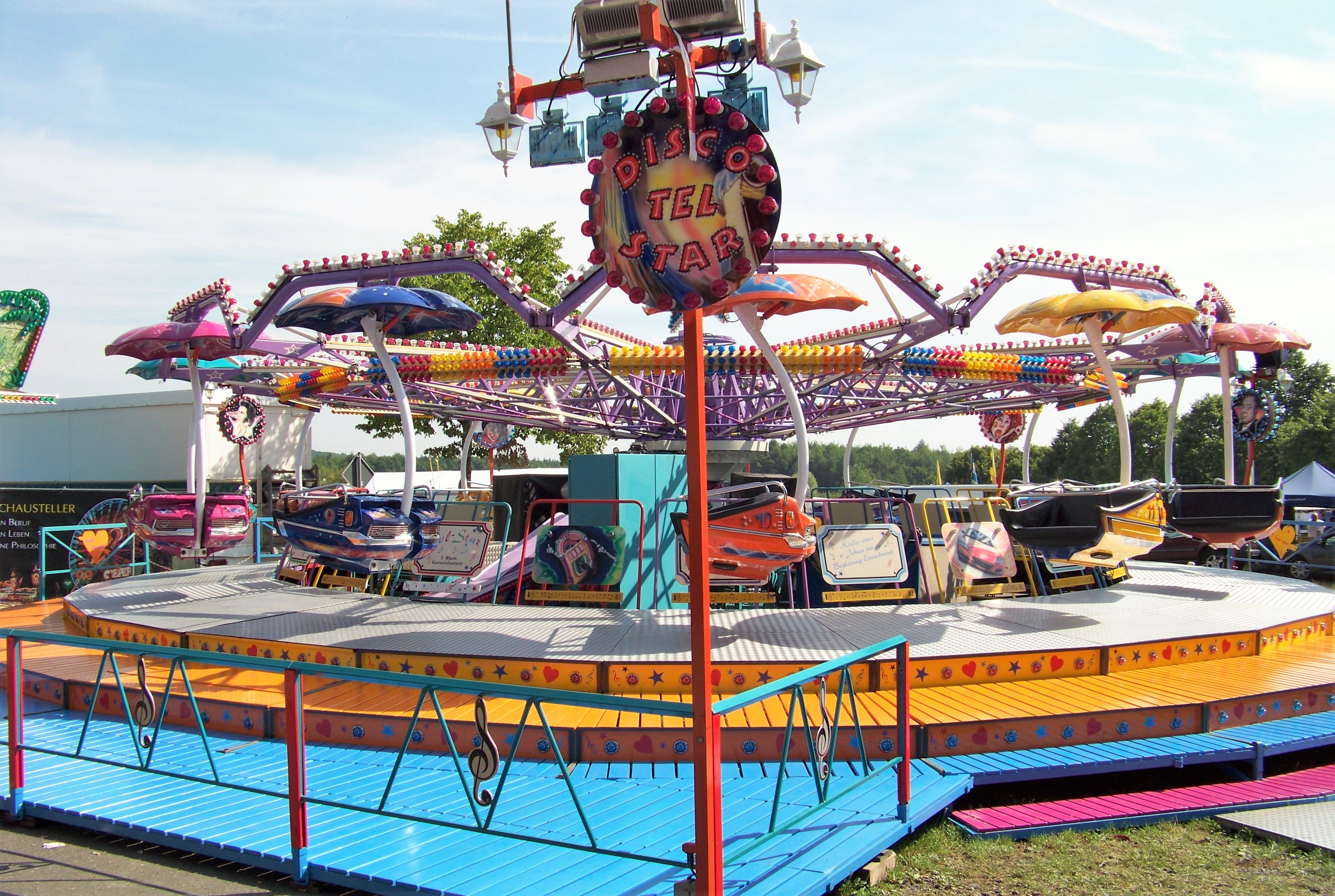 Geht man die enge Kirmesgasse parallel der Straße entlang, trifft man auf die beiden anderen Großfahrgeschäfte, die hier ihre angestammten Plätze eingenommen haben: Den Autoscooter von Rosskopf (auch wenn der Speedway No.1 noch recht neu für Veitsrodt ist) und den Tel Star von Blum, der hier nicht wegzudenken ist.