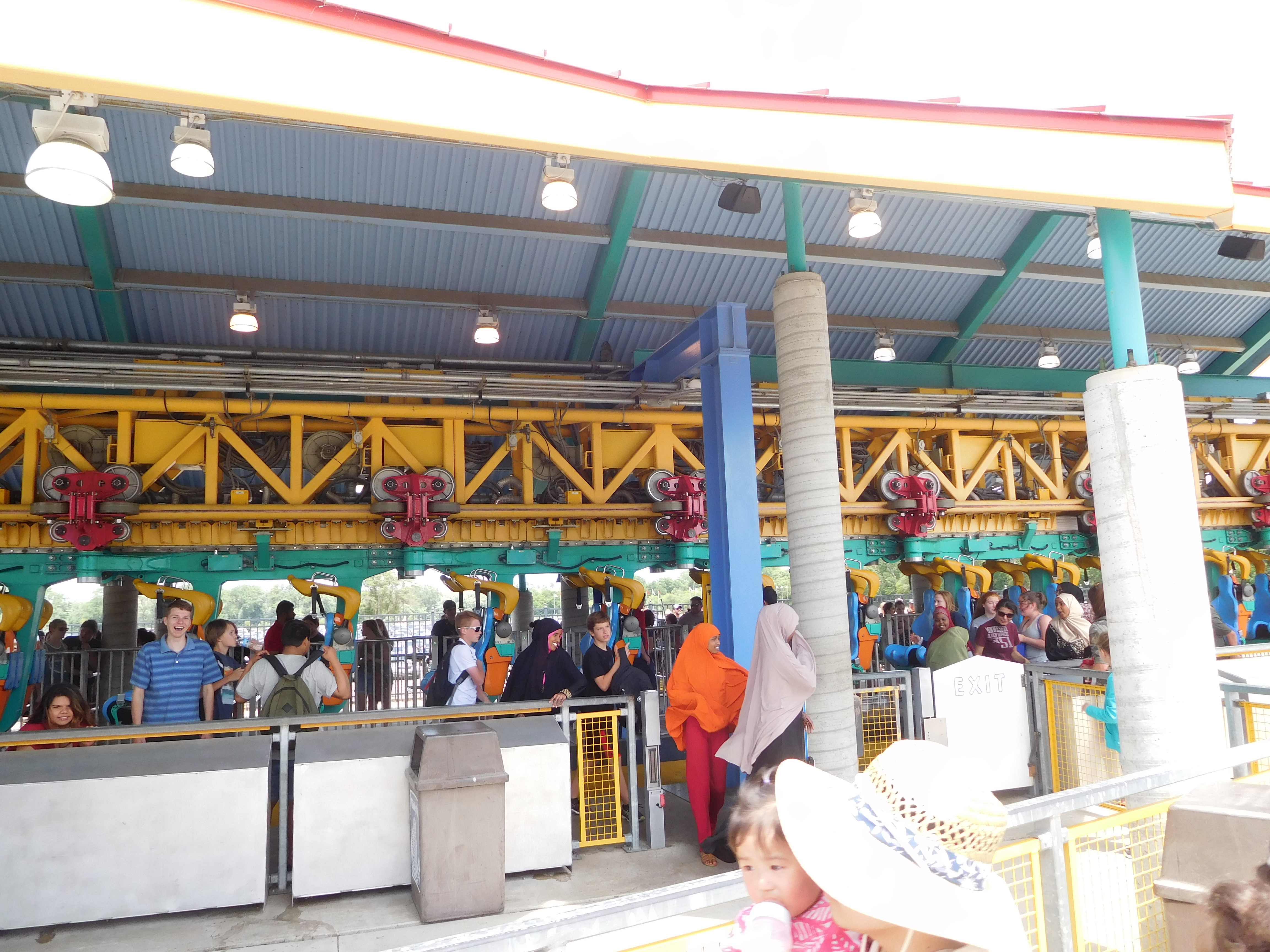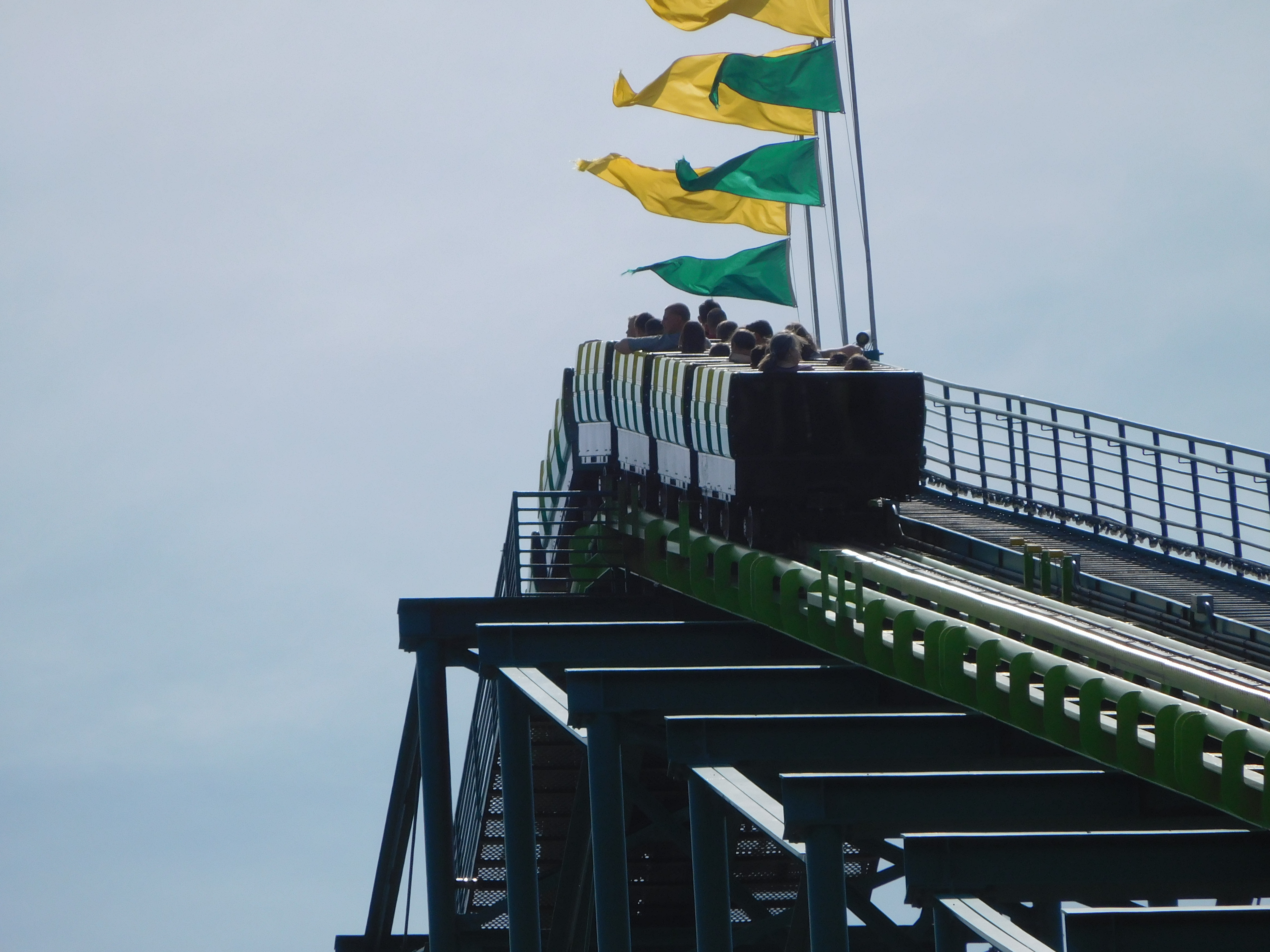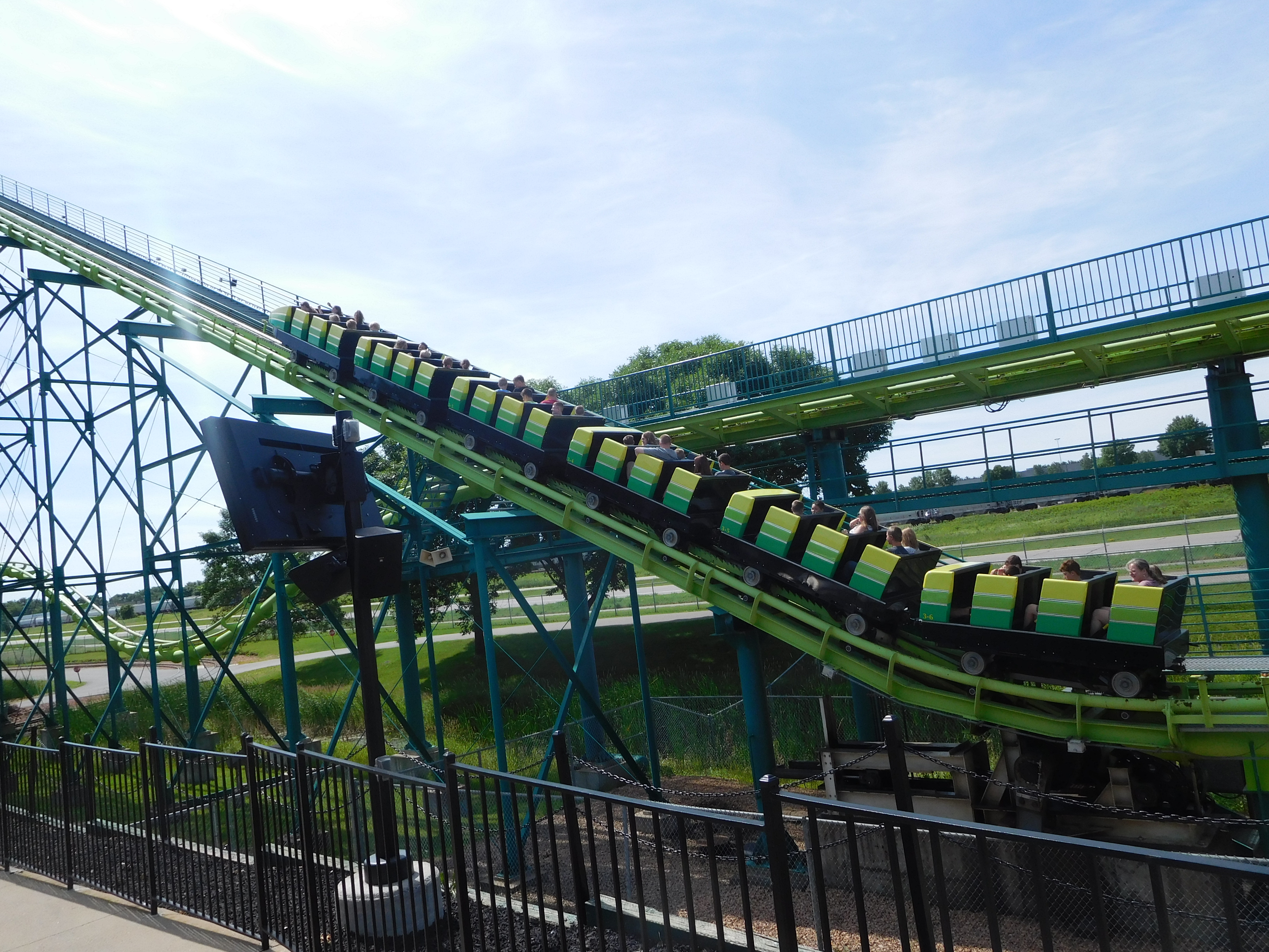 Die Abfertigung hatte sich nun im Vergleich zum Morgen spürbar verbessert. Dort musste man hin und wieder sogar 1-2 Minuten in der Schlussbremse warten, nun war der Zug meist schon auf dem Lifthill, während der 2.Zug in die Schlussbremse raste. Dieses Mal probierte ich wie in Worlds of Fun noch die 2.Reihe aus. Auch hier gefiel mir diese noch ein wenig besser als der Platz hinten. Ein schöner Geschwindigkeitsrausch und die