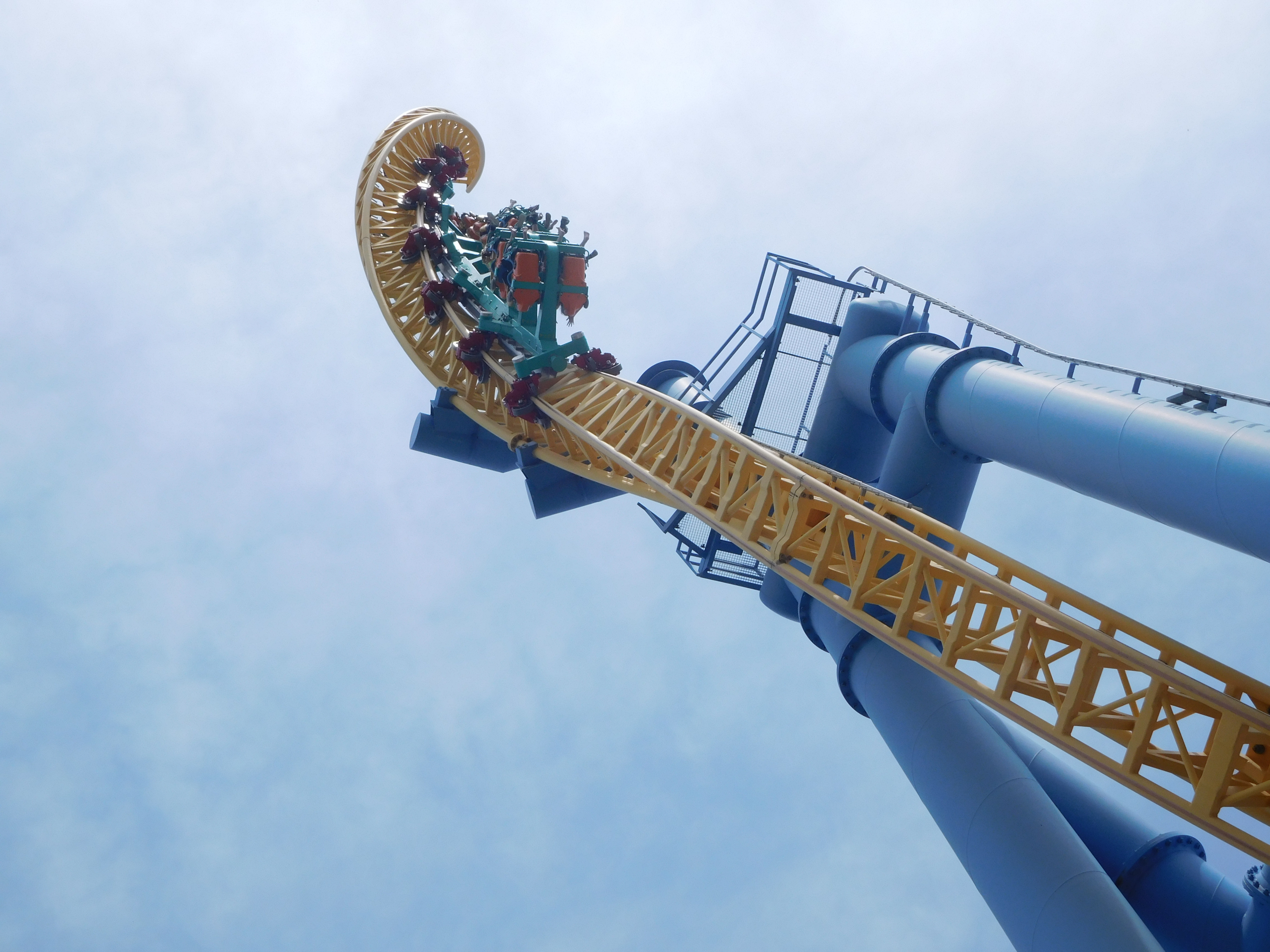 Intamin durchaus Kräftigeres gewohnt. Das Rückwärtsfahren vertrug ich glücklicherweise auch problemlos. Man wird zunächst noch nicht komplett nach vorne hoch geschossen, danach folgen aber noch jeweils 2 Launches rückwärts und vorwärts, bei denen man dem Ende der Türme recht nahe kommt. Vorne sitzend ist das Schöne, das man beim 3. und 5.Launch weit in die Spiralen hineinfährt, was gerade bei der Rückwärts-Abfahrt im freien Fall sehr lustig ist. Dafür sind die Drops vom hinteren Turm natürlich nicht so hoch. Eine schöne Besonderheit: Bei einem der Rückwärtslaunches wird man oben im hinteren Turm für einen kurzen Augenblick angehalten. Ein sehr witziges Gefühl, was den Adrenalinspiegel erstmal kurz hochtreibt.
