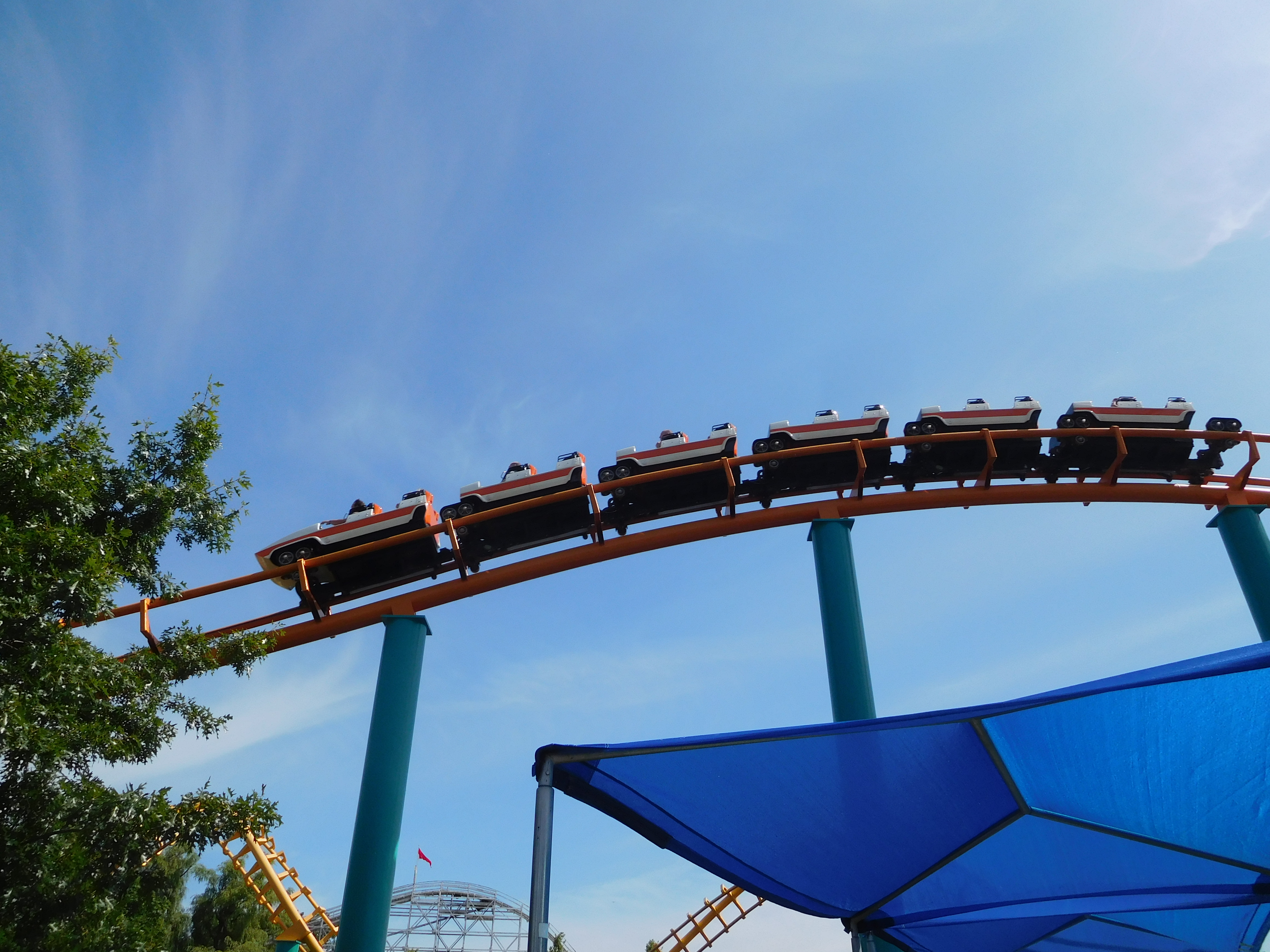 Airtime über den 1.Hügel. Danach gehts nochmal weit aufwärts und es folgt ein kurzes gerades Stück. Danach gehts es nach links geneigt abwärts und die nun folgende Wende ist etwas anders als im Worlds of Fun. Unten im Tal angekommen geht es gleich nochmal aufwärts in eine hochgelegene Rechtskurve. Aus dieser geht es erneut leicht abwärts und man fährt nun in die