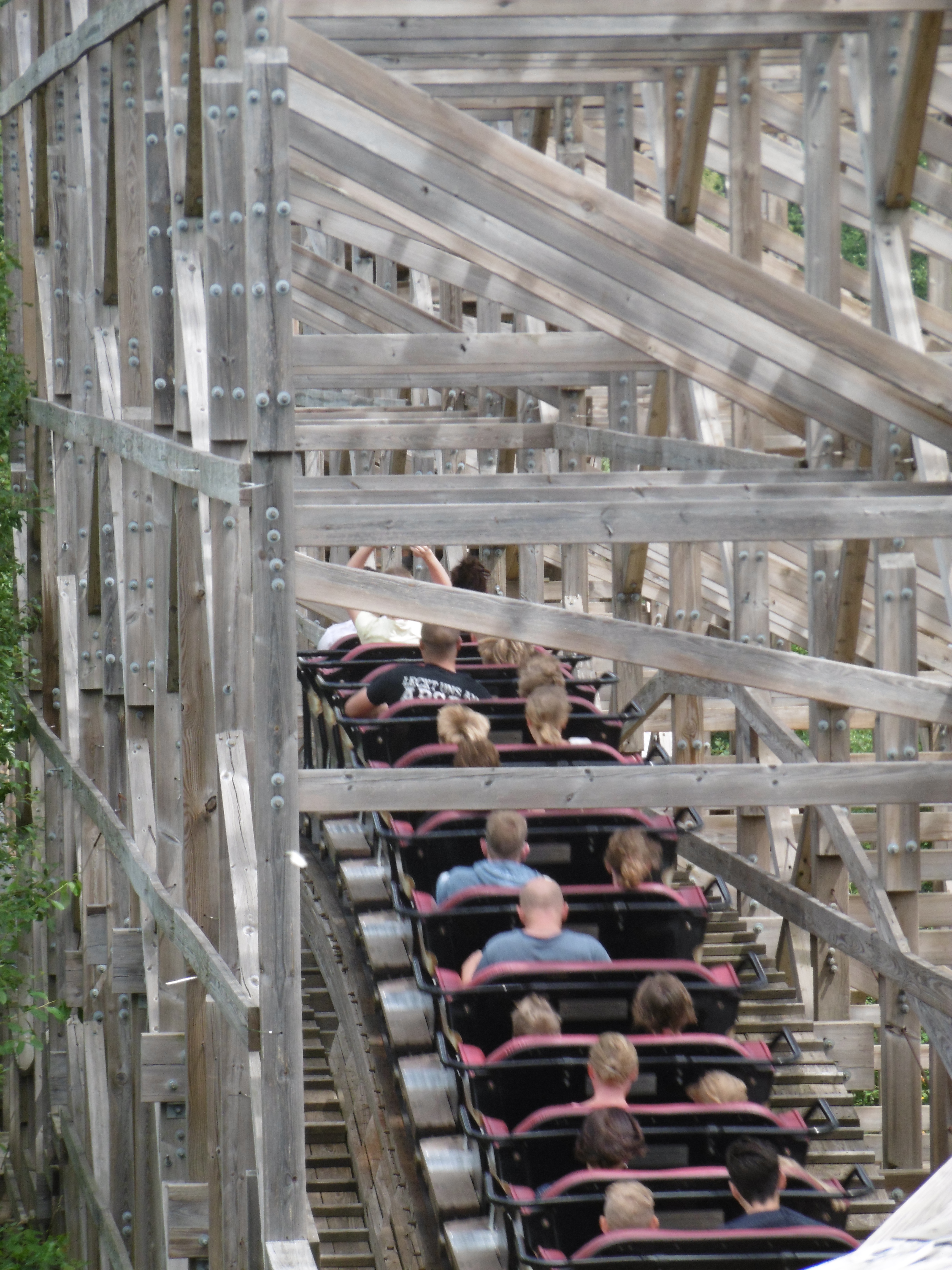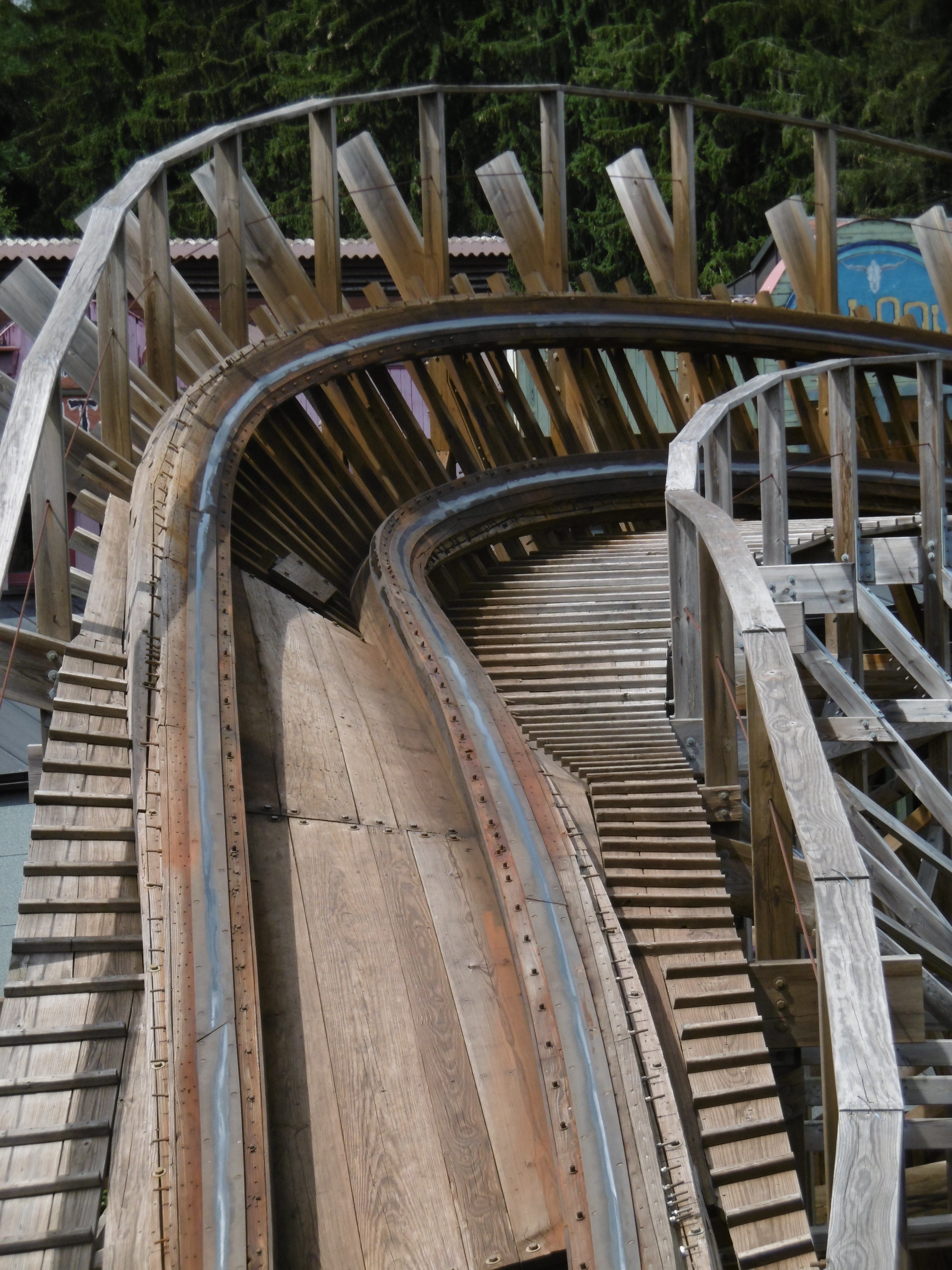 Nachdem 24,5 Meter Höhe erreicht wurden geht es zunächst gerade, dann mit einer steilen Rechtskurve unter den ersten Lift der Wildwasserbahn hindurch zum meiner Meinung nach spaßigsten Punkt.